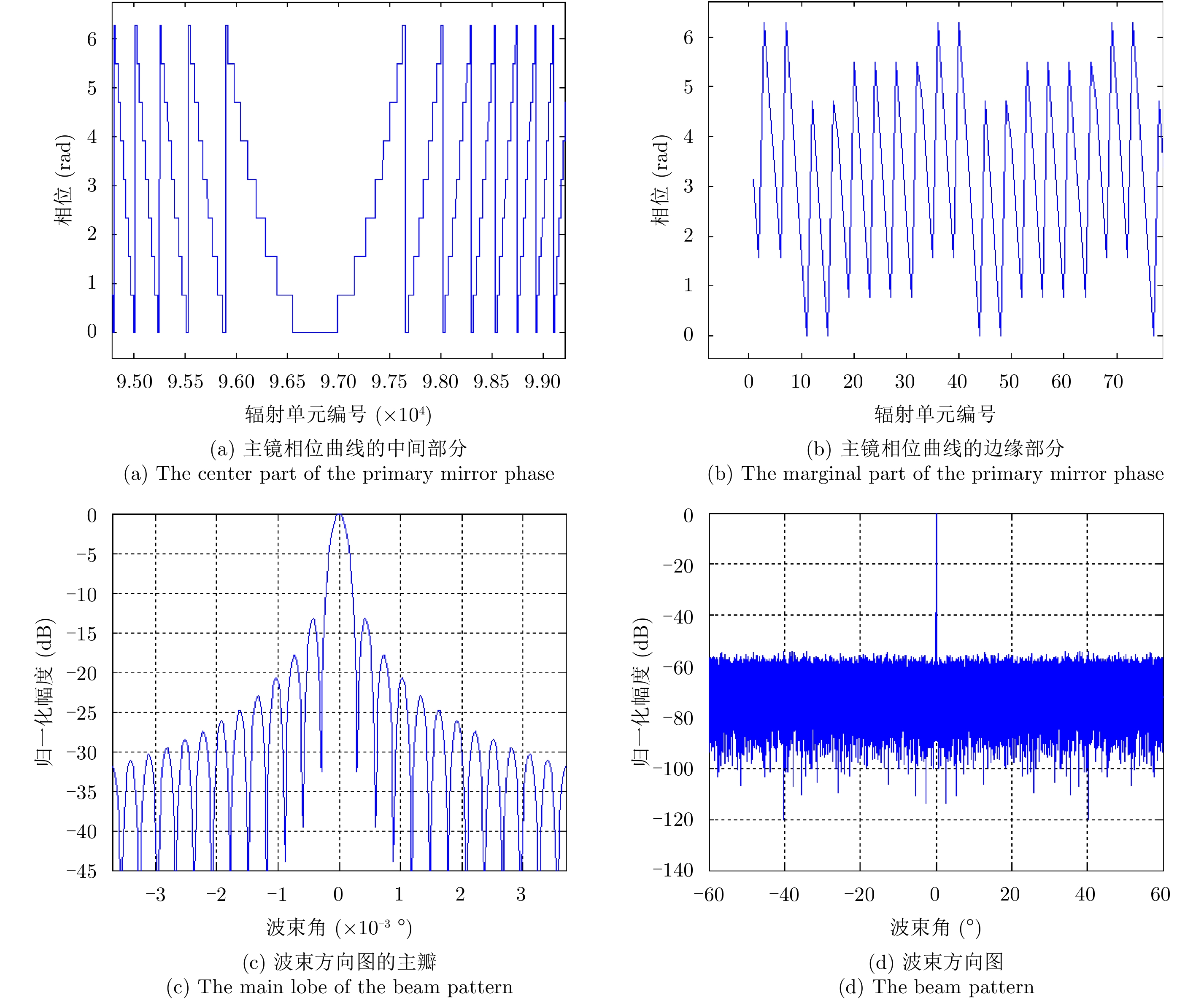 该文对合成孔径激光雷达(Synthetic Aperture Ladar, SAL)光学系统和作用距离进行了分析。根据SAL成像特点,提出了SAL使用非成像衍射光学系统的概念,并引入相控阵模型对其性能进行分析。通过在压缩光路中馈源和主镜两处使用二元光学器件,在口径300 mm条件下将2°接收视场信号收入光纤,对所需的相位参数和对应的波束方向图进行了计算仿真。给出了SAL作用距离方程,分析了相干探测和信号积累增益,明确了SAL具有良好的微弱信号探测能力的结论。针对实际应用需求,给出了一个远距离高分辨率机载SAL系统参数和工作模式。5 cm分辨率时,在连续条带成像模式下,其作用距离可达5 km,幅宽可达1.5 km;在滑动聚束成像模式下,作用距离可达10 km,幅宽可达1 km。 该文对合成孔径激光雷达(Synthetic Aperture Ladar, SAL)光学系统和作用距离进行了分析。根据SAL成像特点,提出了SAL使用非成像衍射光学系统的概念,并引入相控阵模型对其性能进行分析。通过在压缩光路中馈源和主镜两处使用二元光学器件,在口径300 mm条件下将2°接收视场信号收入光纤,对所需的相位参数和对应的波束方向图进行了计算仿真。给出了SAL作用距离方程,分析了相干探测和信号积累增益,明确了SAL具有良好的微弱信号探测能力的结论。针对实际应用需求,给出了一个远距离高分辨率机载SAL系统参数和工作模式。5 cm分辨率时,在连续条带成像模式下,其作用距离可达5 km,幅宽可达1.5 km;在滑动聚束成像模式下,作用距离可达10 km,幅宽可达1 km。