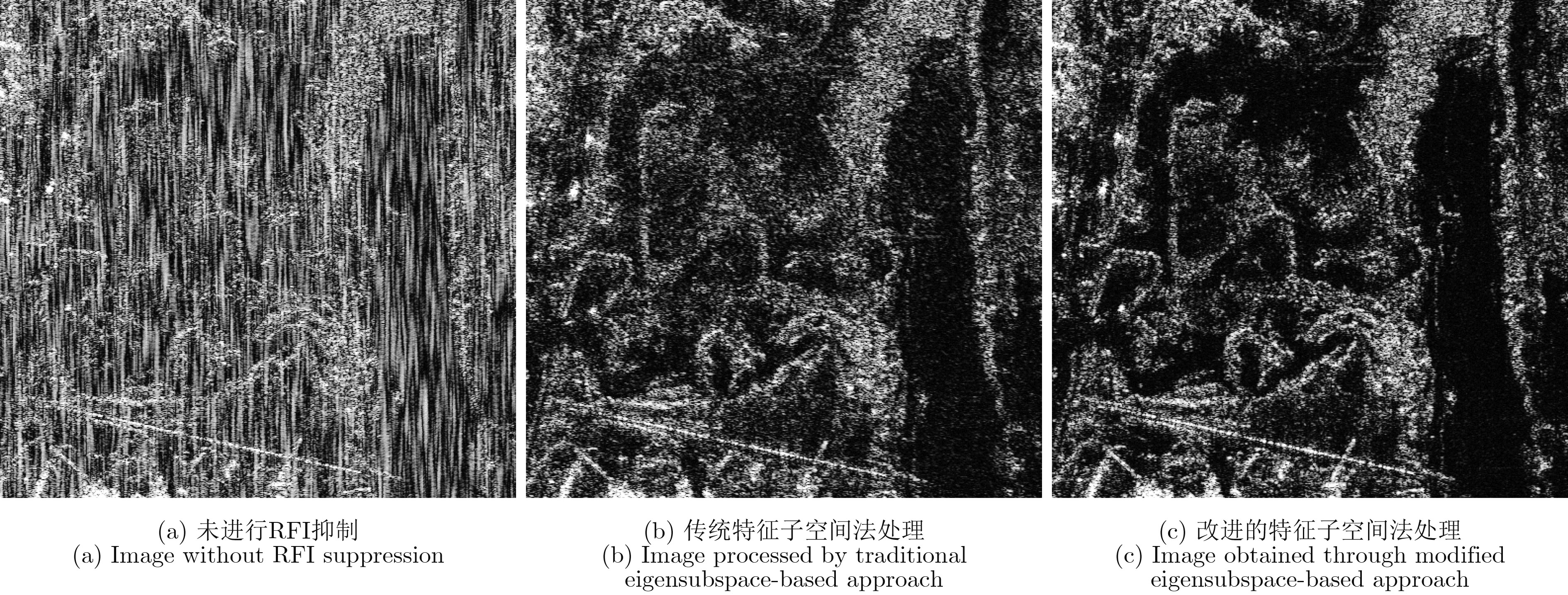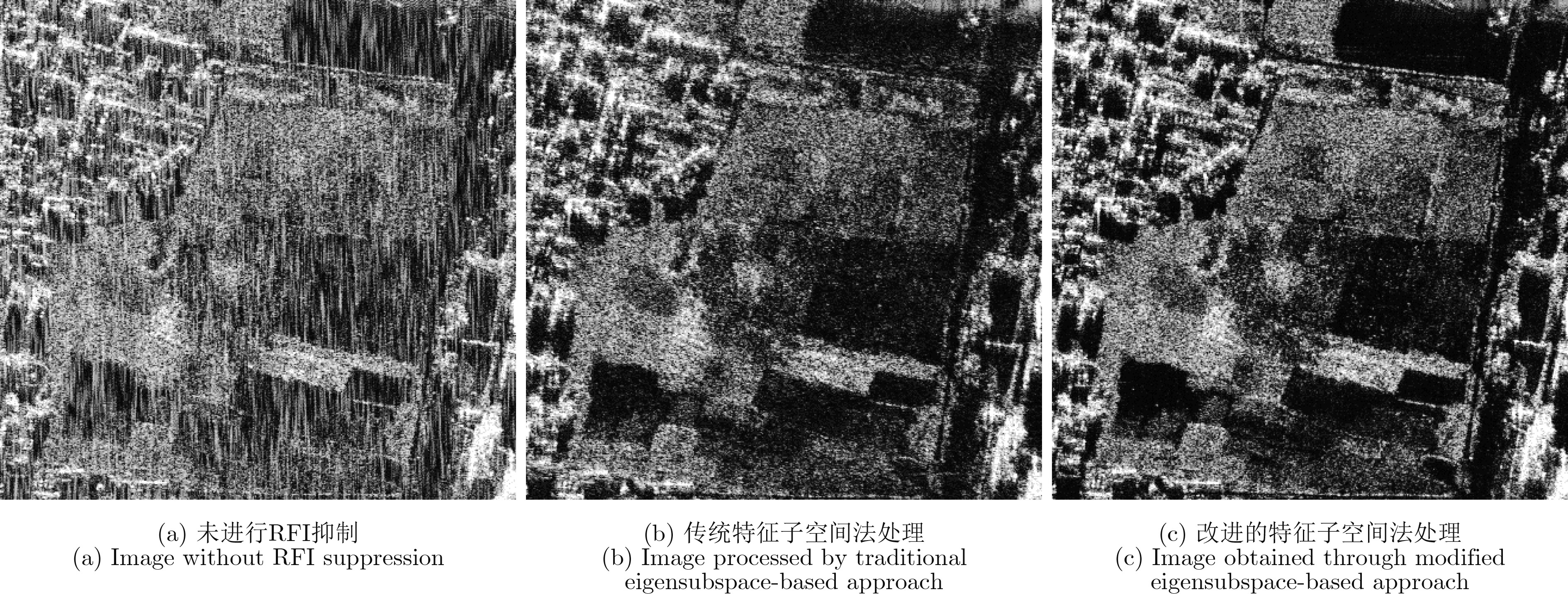 射频干扰(the Radio Frequency Interference, RFI)会对有用信号产生不利影响,进而严重影响成像质量。该文提出了一种改进的基于特征子空间的合成孔径雷达(Synthetic Aperture Radar, SAR)图像射频干扰抑制算法。相比传统算法,所提算法增加了专门用于射频干扰检测的预处理模块。在预处理阶段,分别在频域和时域对干扰所在的数据区域进行检测。在后处理阶段,只对检测到干扰的数据区域进行基于特征子空间的干扰抑制。相比传统算法,所提算法在保持图像细部结构方面效果更好,且避免了时域逐脉冲干扰抑制带来的巨大运算量,运算效率大幅提高。 射频干扰(the Radio Frequency Interference, RFI)会对有用信号产生不利影响,进而严重影响成像质量。该文提出了一种改进的基于特征子空间的合成孔径雷达(Synthetic Aperture Radar, SAR)图像射频干扰抑制算法。相比传统算法,所提算法增加了专门用于射频干扰检测的预处理模块。在预处理阶段,分别在频域和时域对干扰所在的数据区域进行检测。在后处理阶段,只对检测到干扰的数据区域进行基于特征子空间的干扰抑制。相比传统算法,所提算法在保持图像细部结构方面效果更好,且避免了时域逐脉冲干扰抑制带来的巨大运算量,运算效率大幅提高。