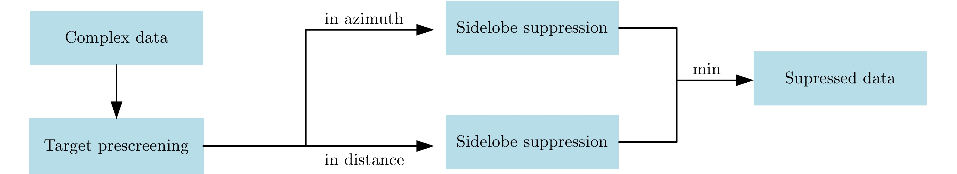 由于合成孔径雷达(SAR)特殊的成像机制,导致了SAR图像上出现了旁瓣效应(SVA)。针对舰船目标检测过程中,旁瓣效应改变了强反射目标的形状导致的定位困难与定位错误问题,该文提出了一种基于空间变迹滤波与有序统计恒虚警率(OS-CFAR)的舰船检测算法。该算法将空间变迹滤波算法运用到复图像数据中,针对目标检测要求的实时性问题进行算法改进,通过全局CFAR只对潜在目标点进行旁瓣抑制而忽略对舰船检测无意义的大量背景点,在抑制旁瓣的同时减少了算法运算量。然后采用非线性的OS-CAFR算法对旁瓣抑制后的图像进行目标检测,并且采用形态学膨胀运算,弥补SVA算法可能造成的像素点幅值错误降低的问题。最后利用高分三号(GF-3)的实测数据进行验证,通过对比有无使用该文算法的结果的图像对比度与检查目标个数,体现了算法的有效性。 由于合成孔径雷达(SAR)特殊的成像机制,导致了SAR图像上出现了旁瓣效应(SVA)。针对舰船目标检测过程中,旁瓣效应改变了强反射目标的形状导致的定位困难与定位错误问题,该文提出了一种基于空间变迹滤波与有序统计恒虚警率(OS-CFAR)的舰船检测算法。该算法将空间变迹滤波算法运用到复图像数据中,针对目标检测要求的实时性问题进行算法改进,通过全局CFAR只对潜在目标点进行旁瓣抑制而忽略对舰船检测无意义的大量背景点,在抑制旁瓣的同时减少了算法运算量。然后采用非线性的OS-CAFR算法对旁瓣抑制后的图像进行目标检测,并且采用形态学膨胀运算,弥补SVA算法可能造成的像素点幅值错误降低的问题。最后利用高分三号(GF-3)的实测数据进行验证,通过对比有无使用该文算法的结果的图像对比度与检查目标个数,体现了算法的有效性。