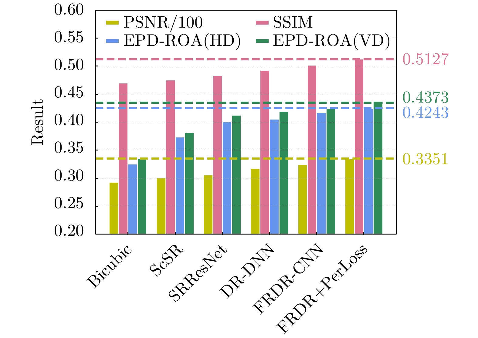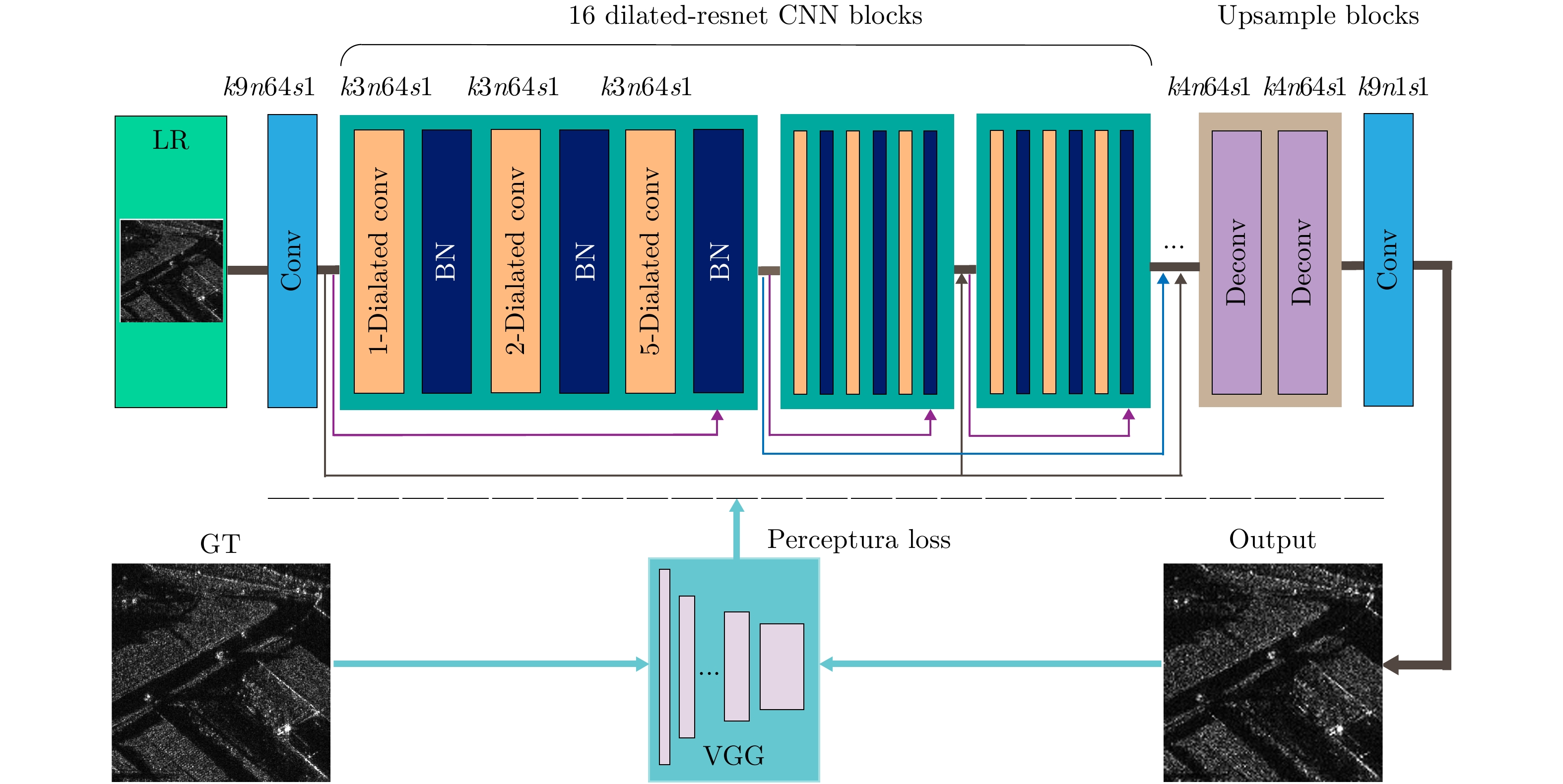 对于合成孔径雷达(SAR)图像,传统的超分辨重建方法对视觉特征的人为构造十分依赖,基于普通卷积神经网络(CNN)的超分辨重建方法对微小目标的重建能力较弱,对边缘轮廓的保真度较差。针对以上问题,该文提出一种基于特征复用的膨胀-残差卷积超分辨网络模型,同时引入感知损失,实现了精确的SAR图像4倍语义级超分辨。该方法为增加网络感受野,采用膨胀-残差卷积(DR-CNN)结构用于限制模型中特征图分辨率的严重损失,提高网络对微小细节的敏感度;为实现不同层级的特征最大化利用,将不同层级的特征图进行级联,形成一种特征复用结构(FRDR-CNN),以此大幅度提升特征提取模块的效率,进一步提升超分辨精度;针对SAR图像特殊的相干斑噪声干扰,引入感知损失,使得该方法在恢复图像边缘和精细的纹理信息方面具有优越表现。文中实验表明,与传统算法以及目前较为流行的几种全卷积神经网络超分辨重建算法相比,该文采用的FRDR-CNN模型在视觉上对小物体的超分辨重建能力更强,对边界等轮廓信息的重建更准确,客观指标中的峰值信噪比(PSNR)和结构相似性指数(SSIM)分别为33.5023 dB和0.5127,边缘保持系数(EPD-ROA)在水平和垂直方向上分别为0.4243和0.4373。 对于合成孔径雷达(SAR)图像,传统的超分辨重建方法对视觉特征的人为构造十分依赖,基于普通卷积神经网络(CNN)的超分辨重建方法对微小目标的重建能力较弱,对边缘轮廓的保真度较差。针对以上问题,该文提出一种基于特征复用的膨胀-残差卷积超分辨网络模型,同时引入感知损失,实现了精确的SAR图像4倍语义级超分辨。该方法为增加网络感受野,采用膨胀-残差卷积(DR-CNN)结构用于限制模型中特征图分辨率的严重损失,提高网络对微小细节的敏感度;为实现不同层级的特征最大化利用,将不同层级的特征图进行级联,形成一种特征复用结构(FRDR-CNN),以此大幅度提升特征提取模块的效率,进一步提升超分辨精度;针对SAR图像特殊的相干斑噪声干扰,引入感知损失,使得该方法在恢复图像边缘和精细的纹理信息方面具有优越表现。文中实验表明,与传统算法以及目前较为流行的几种全卷积神经网络超分辨重建算法相比,该文采用的FRDR-CNN模型在视觉上对小物体的超分辨重建能力更强,对边界等轮廓信息的重建更准确,客观指标中的峰值信噪比(PSNR)和结构相似性指数(SSIM)分别为33.5023 dB和0.5127,边缘保持系数(EPD-ROA)在水平和垂直方向上分别为0.4243和0.4373。