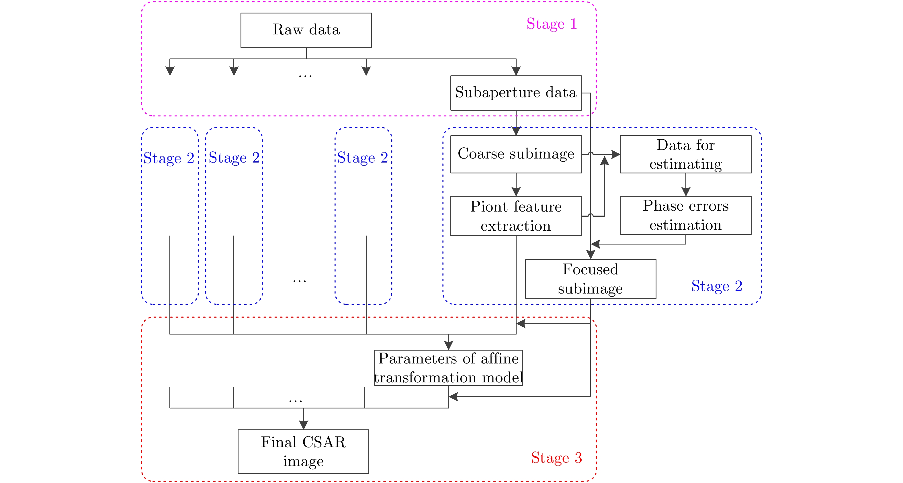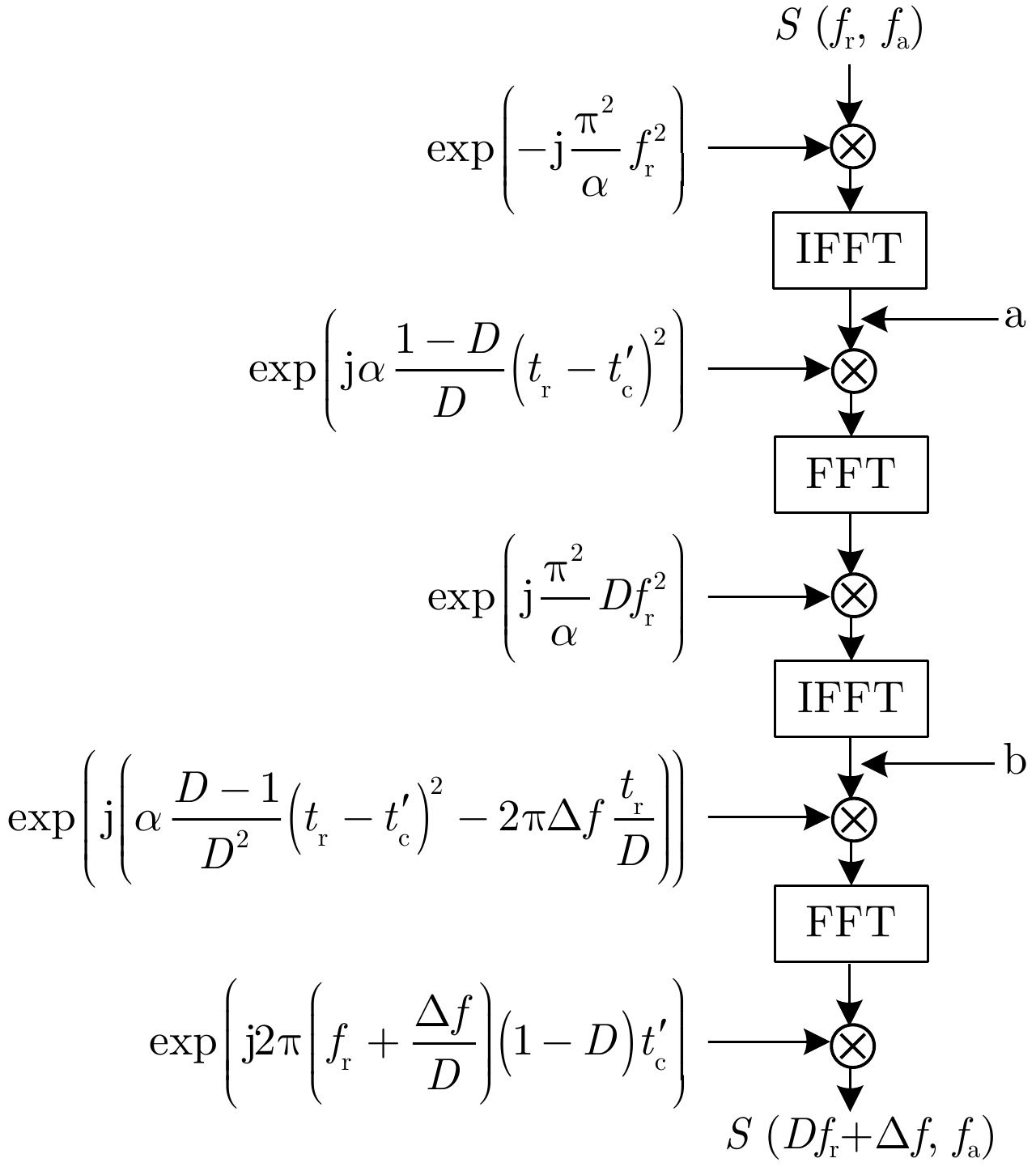 距离徙动算法(RMA)作为一种合成孔径雷达(SAR)频域成像算法,理论上能够达到最优性能。然而,该算法采用逐像素点卷积运算实现Stolt映射,其计算效率无法满足SAR大数据量处理需求。据此,该文提出基于尺度变换原理(PCS)的RMA成像算法。首先,将SAR回波数据沿距离向进行划分,利用子带参考距离处2阶距离方位耦合项与高阶项对子带信号进行补偿;然后,转化非线性Stolt映射为线性形式;最后,利用PCS原理实现Stolt插值,以实现高效率的数据重采样。所提PCS-RMA算法仅利用快速傅里叶变换和复矢量相乘操作即可实现改进型Stolt映射,兼具良好的聚焦性能与较高的计算效率。基于多组仿真数据与X波段1.2 GHz带宽的机载SAR实测数据处理结果,验证了所提算法的有效性,同时该算法可进一步应用于弹载/星载/无人机载SAR数据的快速成像处理。 距离徙动算法(RMA)作为一种合成孔径雷达(SAR)频域成像算法,理论上能够达到最优性能。然而,该算法采用逐像素点卷积运算实现Stolt映射,其计算效率无法满足SAR大数据量处理需求。据此,该文提出基于尺度变换原理(PCS)的RMA成像算法。首先,将SAR回波数据沿距离向进行划分,利用子带参考距离处2阶距离方位耦合项与高阶项对子带信号进行补偿;然后,转化非线性Stolt映射为线性形式;最后,利用PCS原理实现Stolt插值,以实现高效率的数据重采样。所提PCS-RMA算法仅利用快速傅里叶变换和复矢量相乘操作即可实现改进型Stolt映射,兼具良好的聚焦性能与较高的计算效率。基于多组仿真数据与X波段1.2 GHz带宽的机载SAR实测数据处理结果,验证了所提算法的有效性,同时该算法可进一步应用于弹载/星载/无人机载SAR数据的快速成像处理。