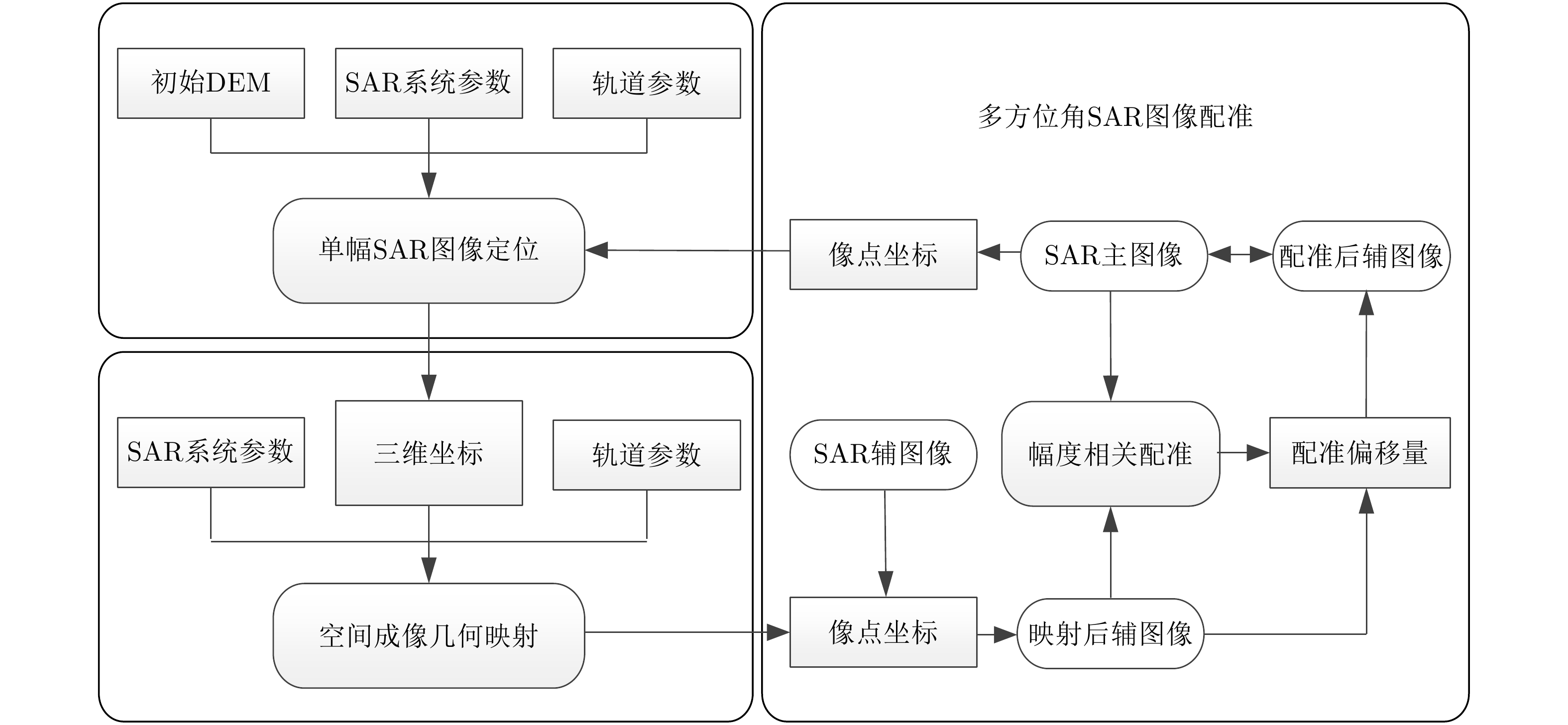 城市建筑区域叠掩、阴影严重,图像理解困难且干涉相位变化复杂紊乱,一直是InSAR处理的困难区域。SAR图像仿真能为图像理解和处理方法研究提供数据支撑,然而现有建筑区域SAR图像仿真方法大多无法获得具有相干性的干涉SAR图像对。该文提出了一种面向建筑区域的干涉SAR复图像对仿真方法,能够获得建筑的复数图像对、干涉相位图以及叠掩成分数目等信息,为城区干涉SAR处理及信息提取研究提供仿真数据支撑。同时,基于仿真中对相位变化规律的分析,提出叠掩区相位解缠时的基准确定方法,解决传统解缠方法面临的叠掩区域干涉相位不连续问题,进而反演建筑高程信息。最后,通过建模仿真结果与实际SAR图像和干涉相位的对比,验证了仿真方法的正确性,并对仿真及实际干涉相位进行解缠和高程反演处理,验证了该文高程反演方法的有效性。 城市建筑区域叠掩、阴影严重,图像理解困难且干涉相位变化复杂紊乱,一直是InSAR处理的困难区域。SAR图像仿真能为图像理解和处理方法研究提供数据支撑,然而现有建筑区域SAR图像仿真方法大多无法获得具有相干性的干涉SAR图像对。该文提出了一种面向建筑区域的干涉SAR复图像对仿真方法,能够获得建筑的复数图像对、干涉相位图以及叠掩成分数目等信息,为城区干涉SAR处理及信息提取研究提供仿真数据支撑。同时,基于仿真中对相位变化规律的分析,提出叠掩区相位解缠时的基准确定方法,解决传统解缠方法面临的叠掩区域干涉相位不连续问题,进而反演建筑高程信息。最后,通过建模仿真结果与实际SAR图像和干涉相位的对比,验证了仿真方法的正确性,并对仿真及实际干涉相位进行解缠和高程反演处理,验证了该文高程反演方法的有效性。