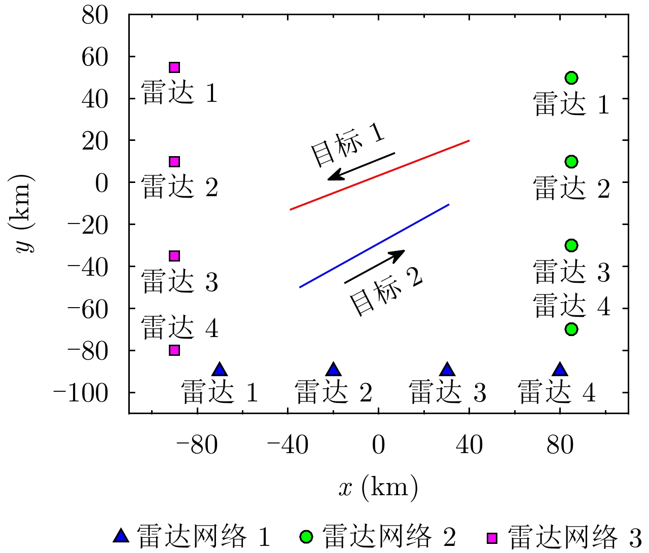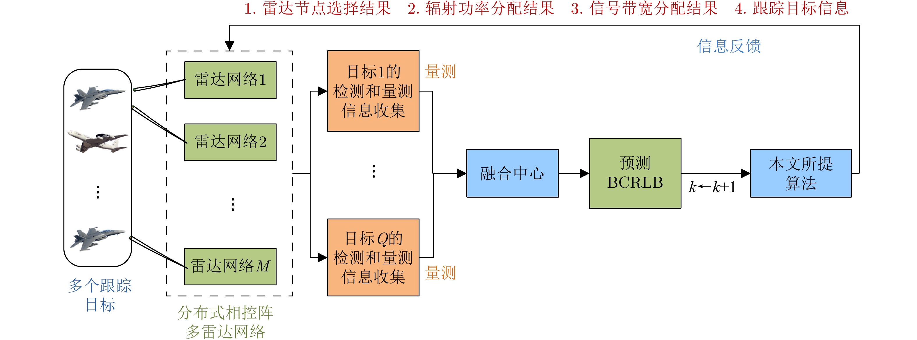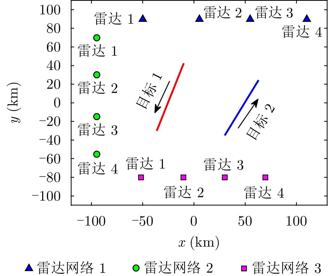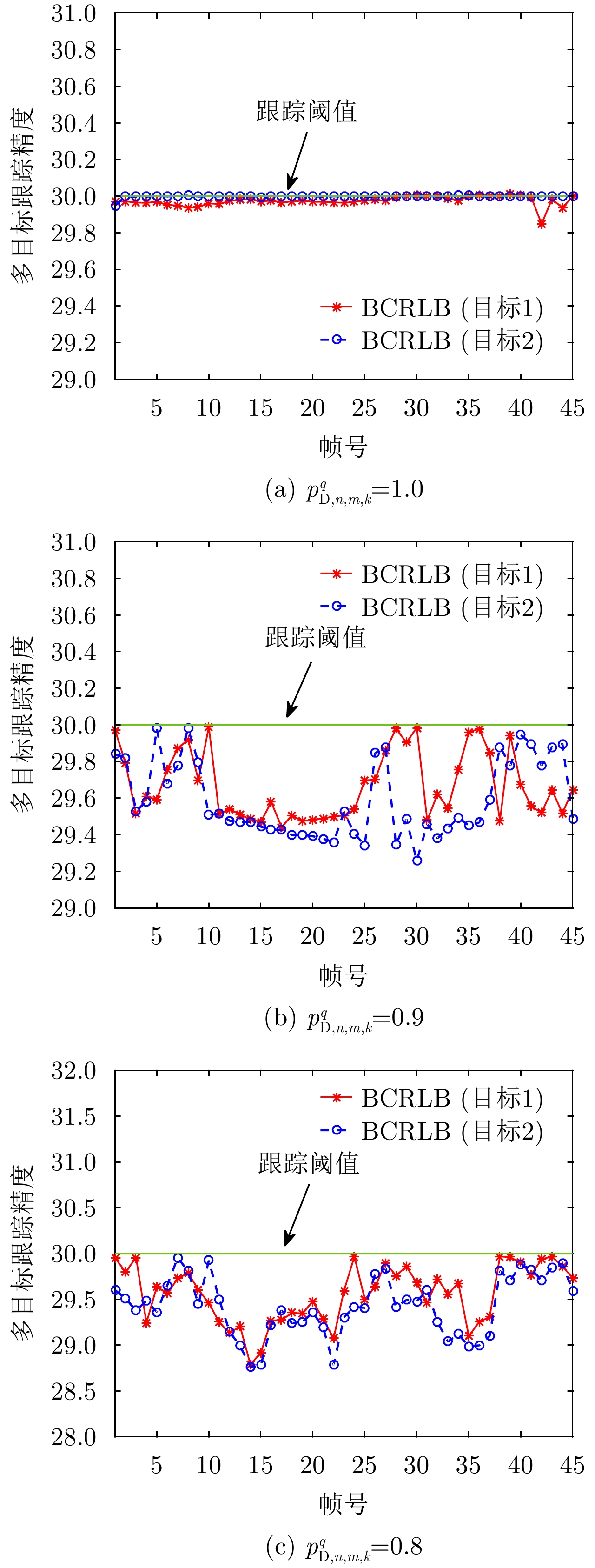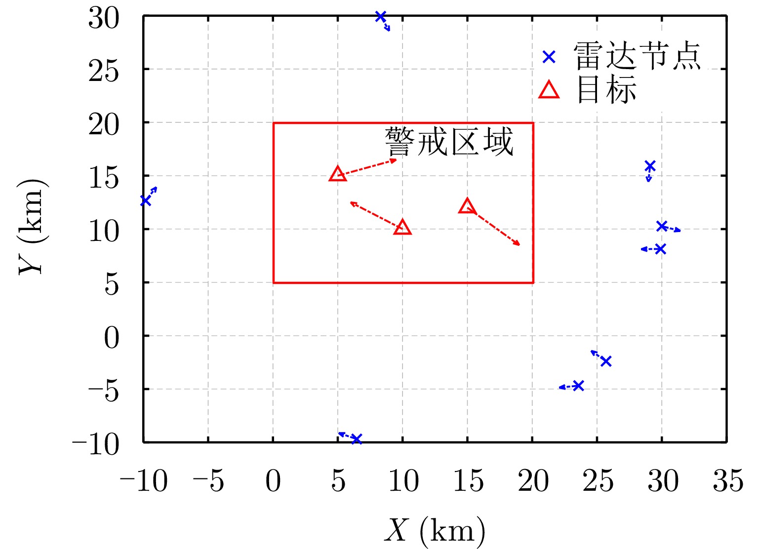 该文针对分布式相控阵多雷达网络的多目标跟踪场景,研究非理想检测条件下的节点选择与辐射资源联合优化分配算法。首先,根据分布式相控阵多雷达网络构成、目标运动模型、雷达量测模型以及雷达节点检测情况,推导非理想检测下以雷达节点选择、辐射功率和信号带宽为变量的贝叶斯克拉默-拉奥下界(BCRLB)闭式解析表达式,并以此作为多目标跟踪精度衡量指标。在此基础上,以最小化系统各雷达节点对所有目标的总辐射功率为优化目标,以满足目标跟踪精度门限以及给定的系统射频辐射资源限制为约束条件,建立非理想检测条件下多雷达网络节点选择与辐射资源联合优化分配模型,对各时刻雷达节点选择、辐射功率和信号带宽等参数进行联合优化设计,以提升多雷达网络的射频隐身性能。最后,针对上述非线性、非凸优化问题,采用基于障碍函数法和循环最小化算法的4步分解算法进行求解。仿真结果表明,与现有算法相比,所提算法能在满足给定多目标跟踪精度的条件下有效降低分布式相控阵多雷达网络的总辐射功率,至少降低了约32.3%,从而提升其射频隐身性能。 该文针对分布式相控阵多雷达网络的多目标跟踪场景,研究非理想检测条件下的节点选择与辐射资源联合优化分配算法。首先,根据分布式相控阵多雷达网络构成、目标运动模型、雷达量测模型以及雷达节点检测情况,推导非理想检测下以雷达节点选择、辐射功率和信号带宽为变量的贝叶斯克拉默-拉奥下界(BCRLB)闭式解析表达式,并以此作为多目标跟踪精度衡量指标。在此基础上,以最小化系统各雷达节点对所有目标的总辐射功率为优化目标,以满足目标跟踪精度门限以及给定的系统射频辐射资源限制为约束条件,建立非理想检测条件下多雷达网络节点选择与辐射资源联合优化分配模型,对各时刻雷达节点选择、辐射功率和信号带宽等参数进行联合优化设计,以提升多雷达网络的射频隐身性能。最后,针对上述非线性、非凸优化问题,采用基于障碍函数法和循环最小化算法的4步分解算法进行求解。仿真结果表明,与现有算法相比,所提算法能在满足给定多目标跟踪精度的条件下有效降低分布式相控阵多雷达网络的总辐射功率,至少降低了约32.3%,从而提升其射频隐身性能。