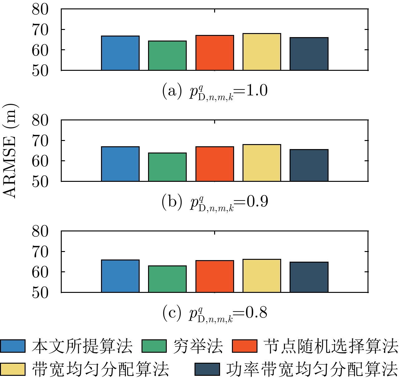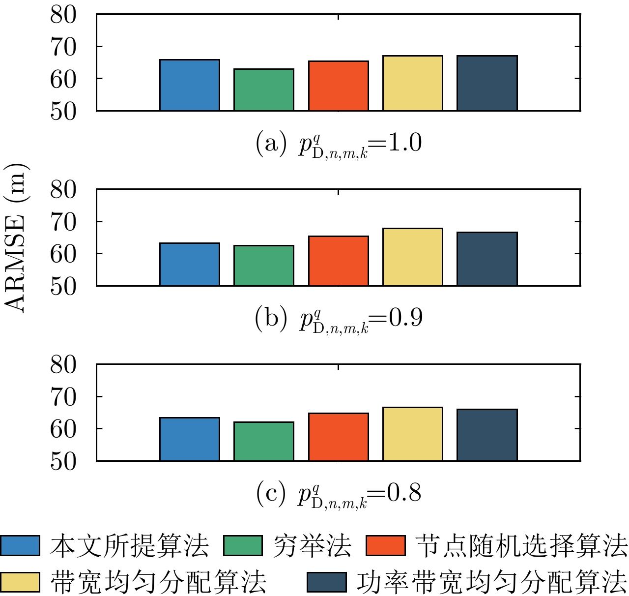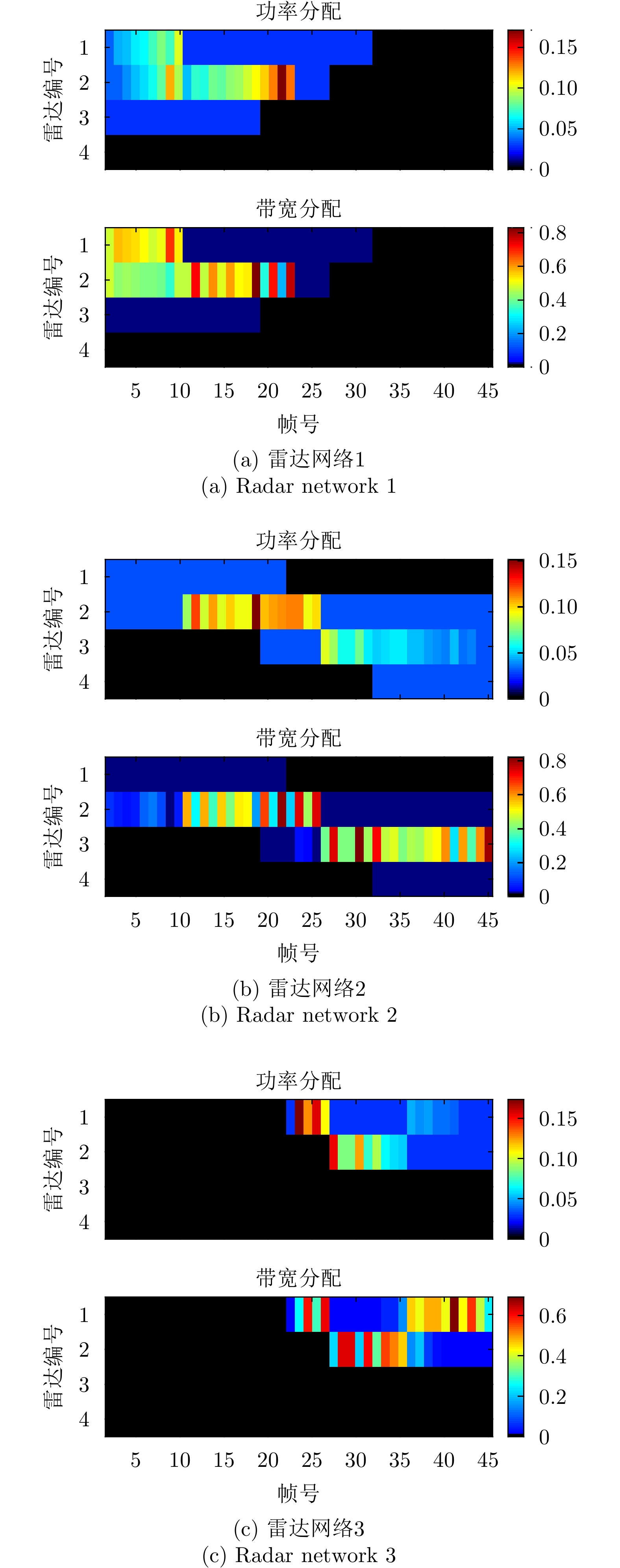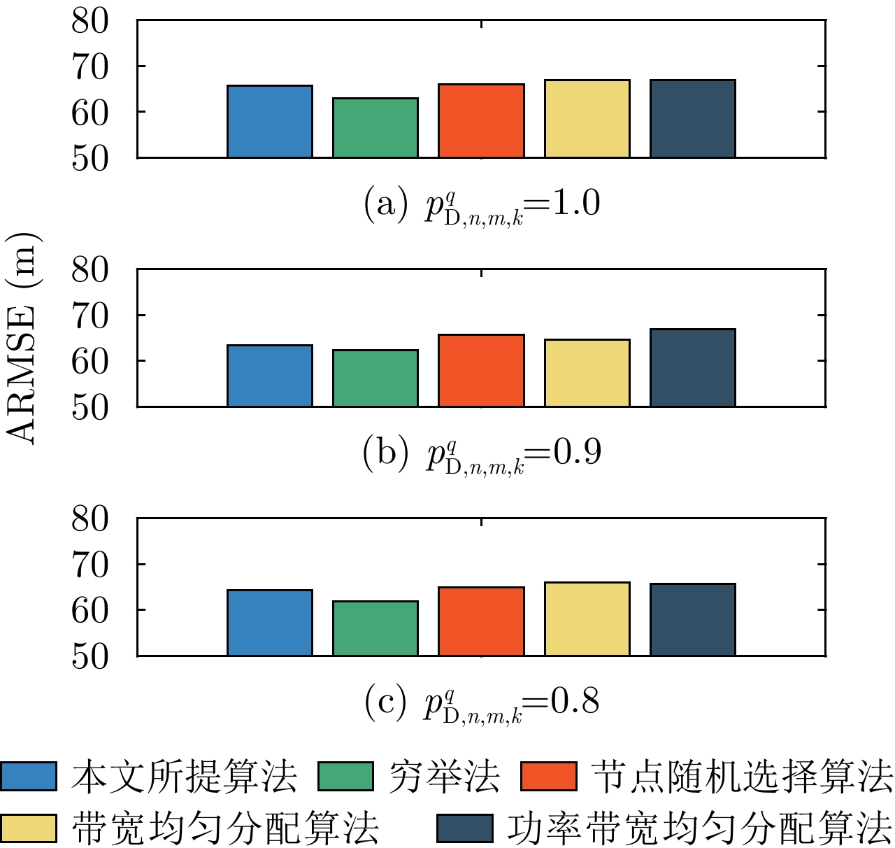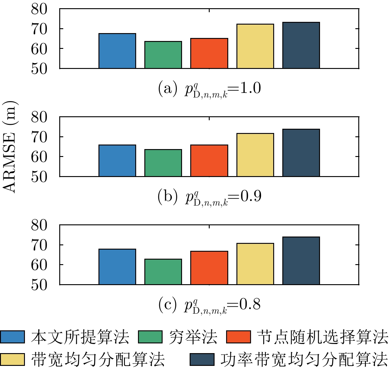 该文针对分布式相控阵多雷达网络的多目标跟踪场景,研究非理想检测条件下的节点选择与辐射资源联合优化分配算法。首先,根据分布式相控阵多雷达网络构成、目标运动模型、雷达量测模型以及雷达节点检测情况,推导非理想检测下以雷达节点选择、辐射功率和信号带宽为变量的贝叶斯克拉默-拉奥下界(BCRLB)闭式解析表达式,并以此作为多目标跟踪精度衡量指标。在此基础上,以最小化系统各雷达节点对所有目标的总辐射功率为优化目标,以满足目标跟踪精度门限以及给定的系统射频辐射资源限制为约束条件,建立非理想检测条件下多雷达网络节点选择与辐射资源联合优化分配模型,对各时刻雷达节点选择、辐射功率和信号带宽等参数进行联合优化设计,以提升多雷达网络的射频隐身性能。最后,针对上述非线性、非凸优化问题,采用基于障碍函数法和循环最小化算法的4步分解算法进行求解。仿真结果表明,与现有算法相比,所提算法能在满足给定多目标跟踪精度的条件下有效降低分布式相控阵多雷达网络的总辐射功率,至少降低了约32.3%,从而提升其射频隐身性能。 该文针对分布式相控阵多雷达网络的多目标跟踪场景,研究非理想检测条件下的节点选择与辐射资源联合优化分配算法。首先,根据分布式相控阵多雷达网络构成、目标运动模型、雷达量测模型以及雷达节点检测情况,推导非理想检测下以雷达节点选择、辐射功率和信号带宽为变量的贝叶斯克拉默-拉奥下界(BCRLB)闭式解析表达式,并以此作为多目标跟踪精度衡量指标。在此基础上,以最小化系统各雷达节点对所有目标的总辐射功率为优化目标,以满足目标跟踪精度门限以及给定的系统射频辐射资源限制为约束条件,建立非理想检测条件下多雷达网络节点选择与辐射资源联合优化分配模型,对各时刻雷达节点选择、辐射功率和信号带宽等参数进行联合优化设计,以提升多雷达网络的射频隐身性能。最后,针对上述非线性、非凸优化问题,采用基于障碍函数法和循环最小化算法的4步分解算法进行求解。仿真结果表明,与现有算法相比,所提算法能在满足给定多目标跟踪精度的条件下有效降低分布式相控阵多雷达网络的总辐射功率,至少降低了约32.3%,从而提升其射频隐身性能。