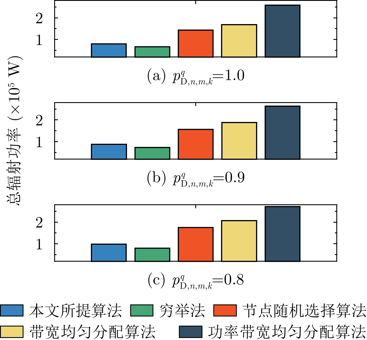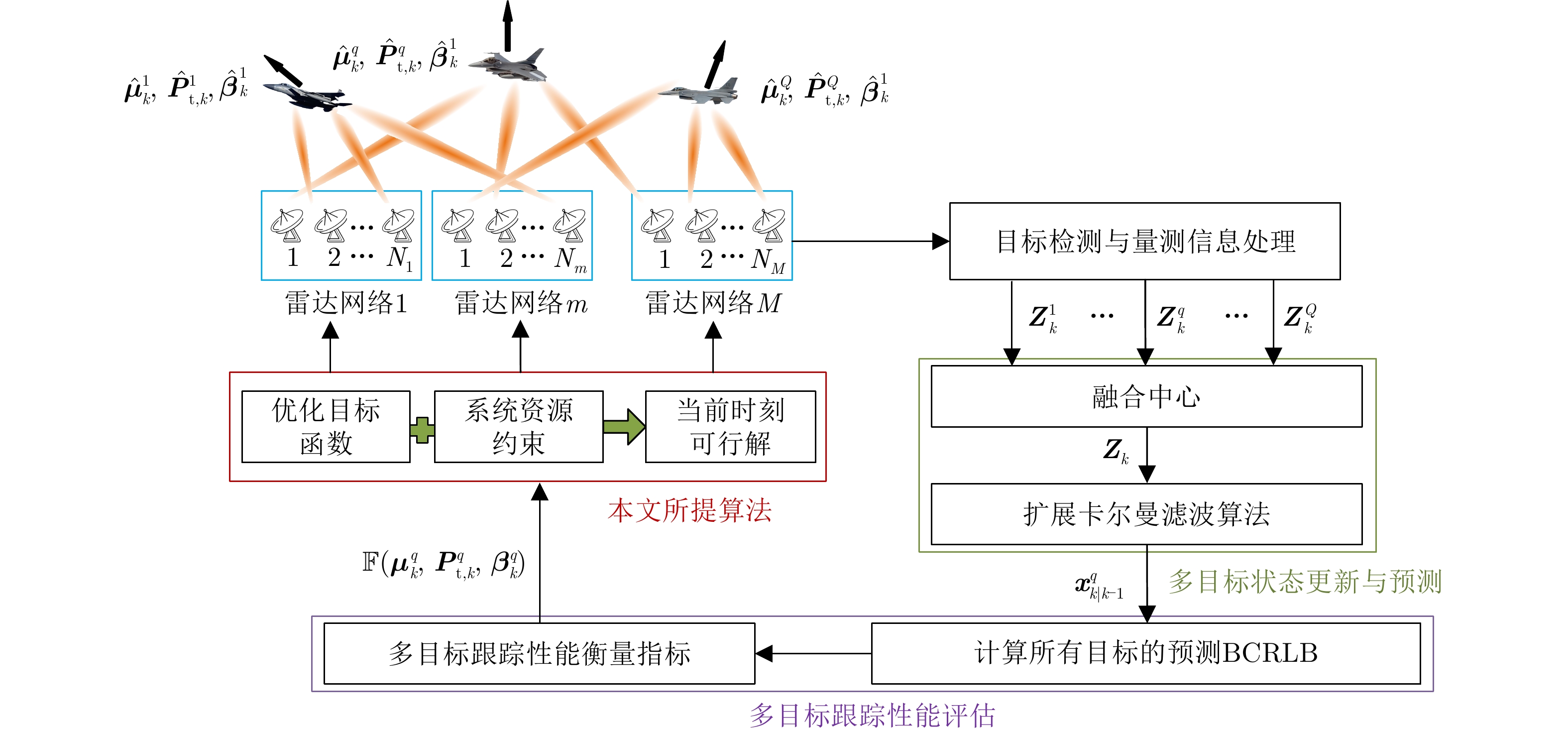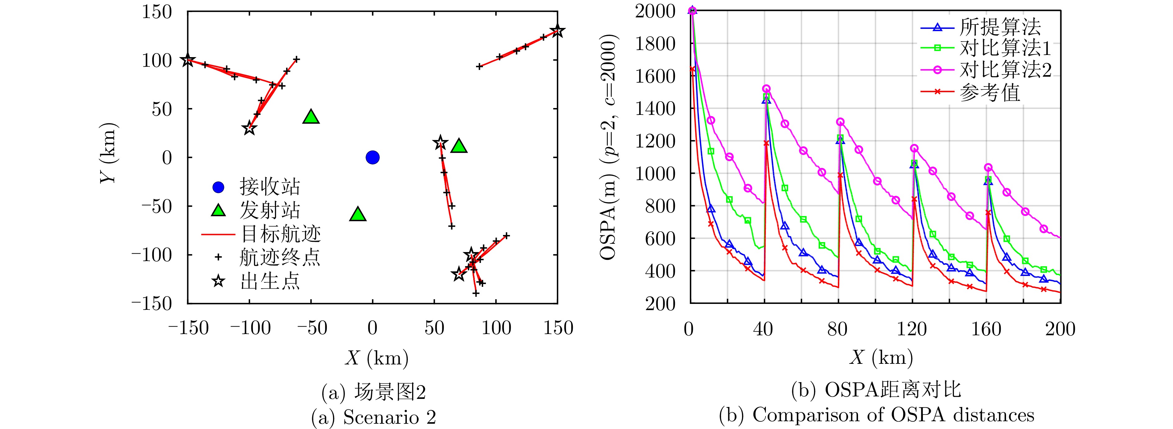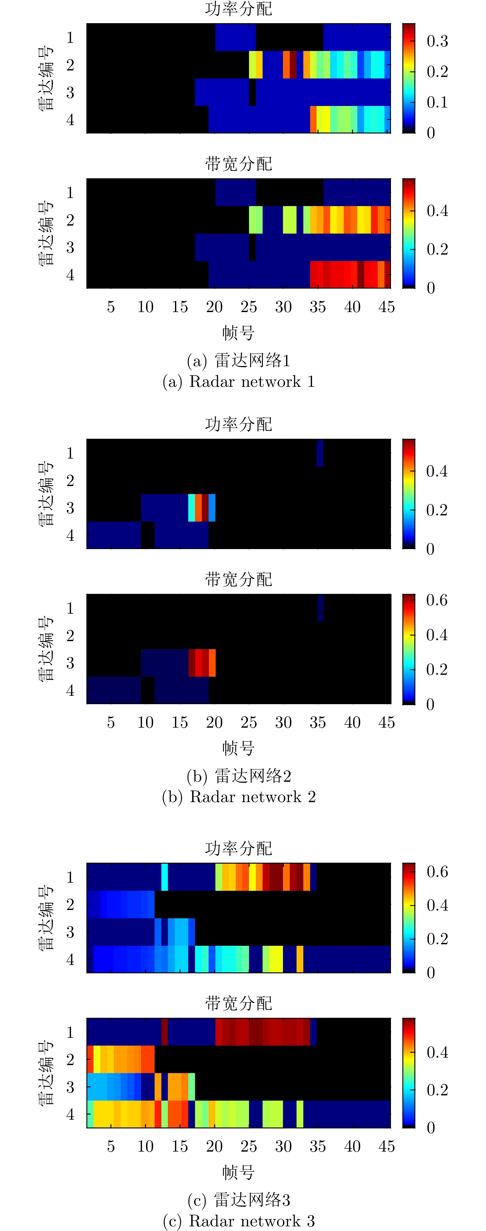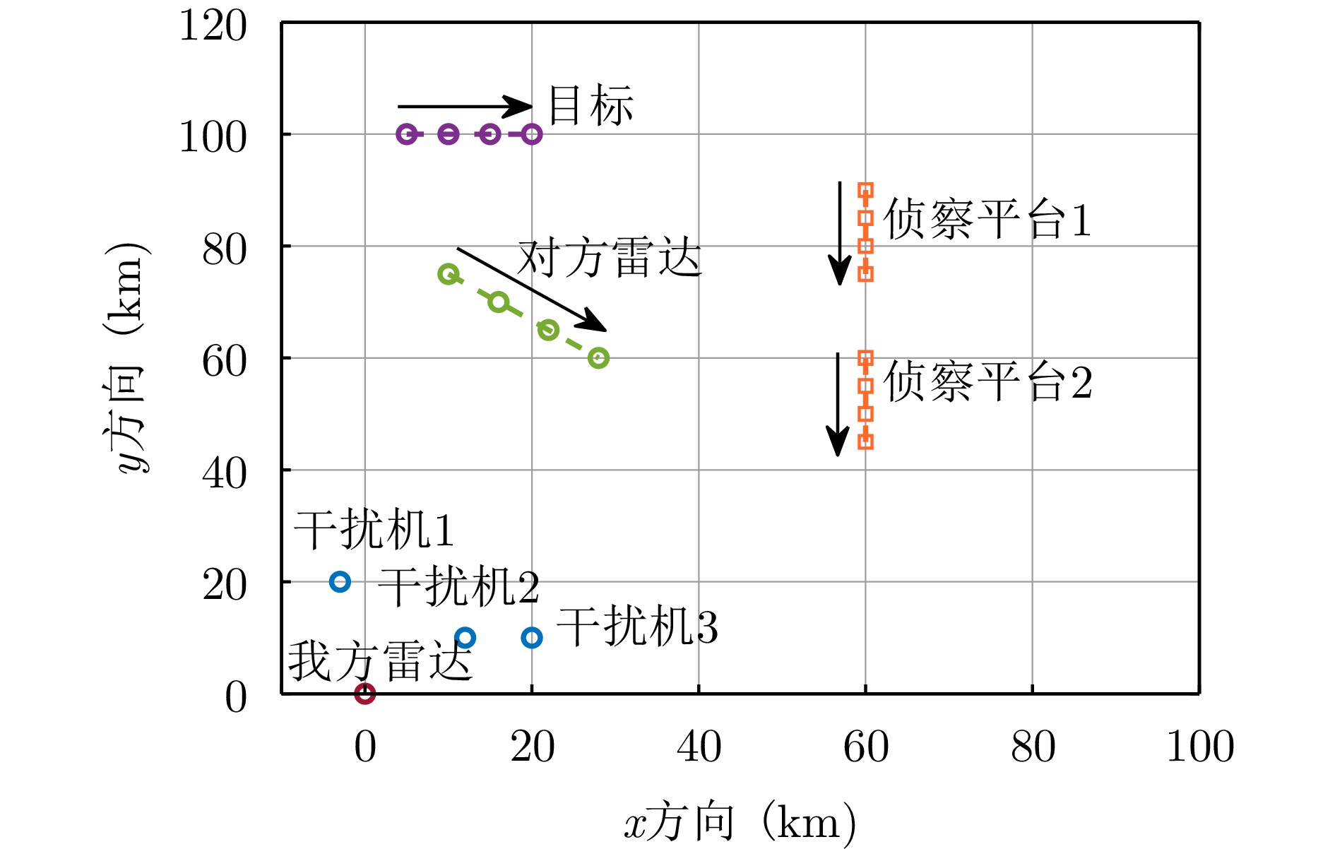 该文针对分布式相控阵多雷达网络的多目标跟踪场景,研究非理想检测条件下的节点选择与辐射资源联合优化分配算法。首先,根据分布式相控阵多雷达网络构成、目标运动模型、雷达量测模型以及雷达节点检测情况,推导非理想检测下以雷达节点选择、辐射功率和信号带宽为变量的贝叶斯克拉默-拉奥下界(BCRLB)闭式解析表达式,并以此作为多目标跟踪精度衡量指标。在此基础上,以最小化系统各雷达节点对所有目标的总辐射功率为优化目标,以满足目标跟踪精度门限以及给定的系统射频辐射资源限制为约束条件,建立非理想检测条件下多雷达网络节点选择与辐射资源联合优化分配模型,对各时刻雷达节点选择、辐射功率和信号带宽等参数进行联合优化设计,以提升多雷达网络的射频隐身性能。最后,针对上述非线性、非凸优化问题,采用基于障碍函数法和循环最小化算法的4步分解算法进行求解。仿真结果表明,与现有算法相比,所提算法能在满足给定多目标跟踪精度的条件下有效降低分布式相控阵多雷达网络的总辐射功率,至少降低了约32.3%,从而提升其射频隐身性能。 该文针对分布式相控阵多雷达网络的多目标跟踪场景,研究非理想检测条件下的节点选择与辐射资源联合优化分配算法。首先,根据分布式相控阵多雷达网络构成、目标运动模型、雷达量测模型以及雷达节点检测情况,推导非理想检测下以雷达节点选择、辐射功率和信号带宽为变量的贝叶斯克拉默-拉奥下界(BCRLB)闭式解析表达式,并以此作为多目标跟踪精度衡量指标。在此基础上,以最小化系统各雷达节点对所有目标的总辐射功率为优化目标,以满足目标跟踪精度门限以及给定的系统射频辐射资源限制为约束条件,建立非理想检测条件下多雷达网络节点选择与辐射资源联合优化分配模型,对各时刻雷达节点选择、辐射功率和信号带宽等参数进行联合优化设计,以提升多雷达网络的射频隐身性能。最后,针对上述非线性、非凸优化问题,采用基于障碍函数法和循环最小化算法的4步分解算法进行求解。仿真结果表明,与现有算法相比,所提算法能在满足给定多目标跟踪精度的条件下有效降低分布式相控阵多雷达网络的总辐射功率,至少降低了约32.3%,从而提升其射频隐身性能。