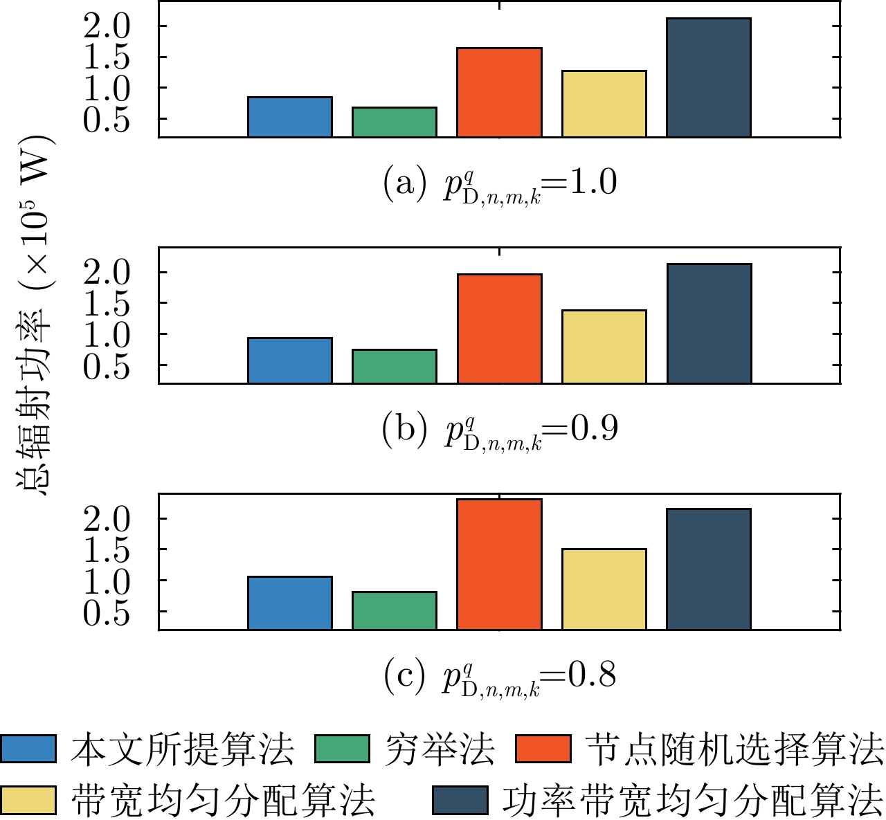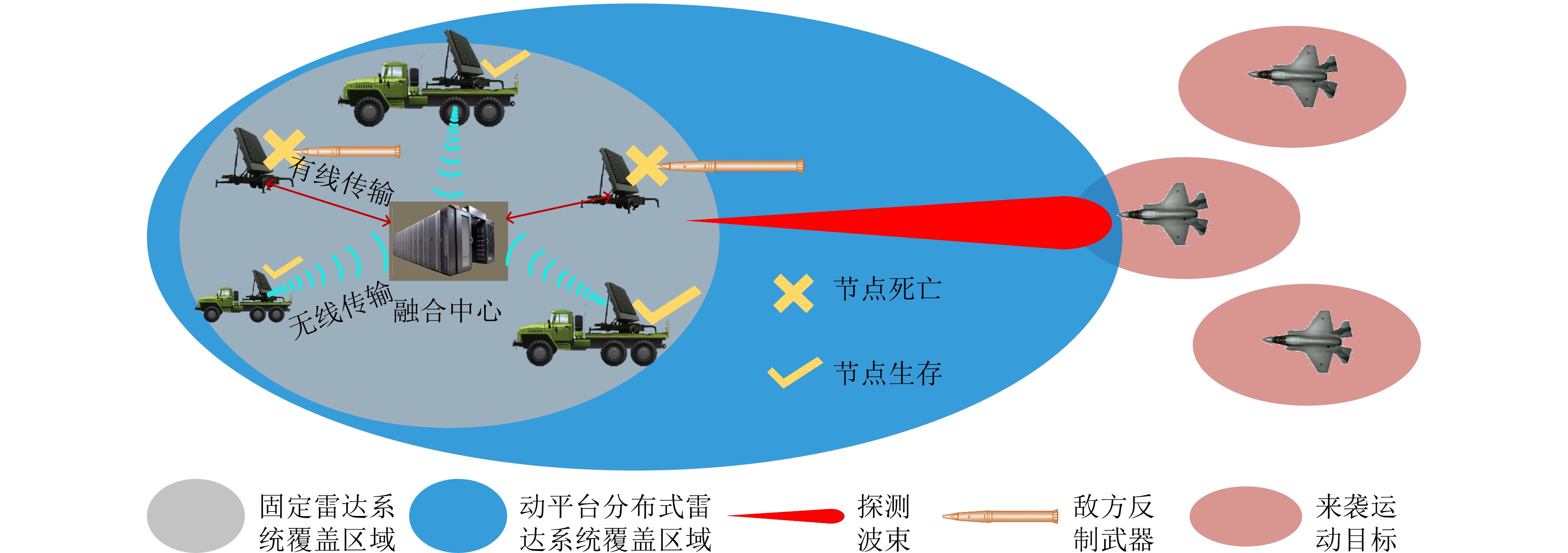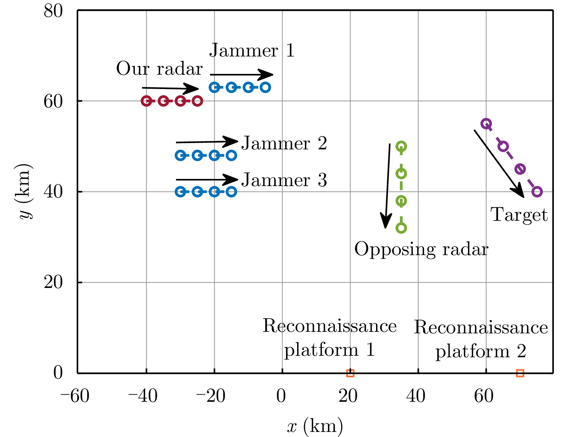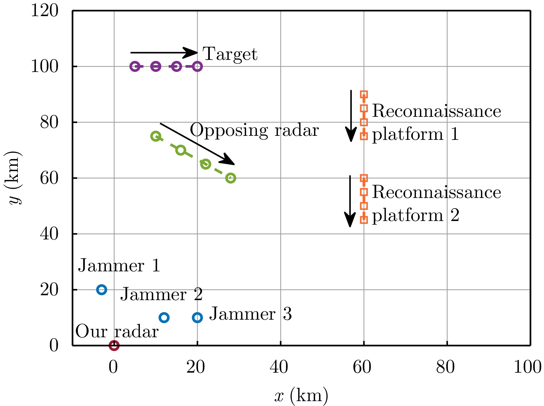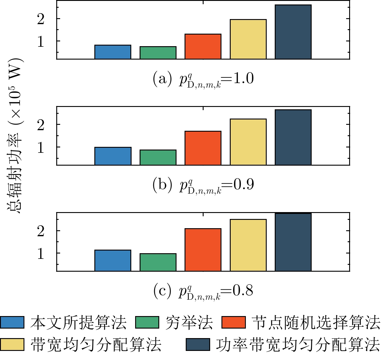 该文针对分布式相控阵多雷达网络的多目标跟踪场景,研究非理想检测条件下的节点选择与辐射资源联合优化分配算法。首先,根据分布式相控阵多雷达网络构成、目标运动模型、雷达量测模型以及雷达节点检测情况,推导非理想检测下以雷达节点选择、辐射功率和信号带宽为变量的贝叶斯克拉默-拉奥下界(BCRLB)闭式解析表达式,并以此作为多目标跟踪精度衡量指标。在此基础上,以最小化系统各雷达节点对所有目标的总辐射功率为优化目标,以满足目标跟踪精度门限以及给定的系统射频辐射资源限制为约束条件,建立非理想检测条件下多雷达网络节点选择与辐射资源联合优化分配模型,对各时刻雷达节点选择、辐射功率和信号带宽等参数进行联合优化设计,以提升多雷达网络的射频隐身性能。最后,针对上述非线性、非凸优化问题,采用基于障碍函数法和循环最小化算法的4步分解算法进行求解。仿真结果表明,与现有算法相比,所提算法能在满足给定多目标跟踪精度的条件下有效降低分布式相控阵多雷达网络的总辐射功率,至少降低了约32.3%,从而提升其射频隐身性能。 该文针对分布式相控阵多雷达网络的多目标跟踪场景,研究非理想检测条件下的节点选择与辐射资源联合优化分配算法。首先,根据分布式相控阵多雷达网络构成、目标运动模型、雷达量测模型以及雷达节点检测情况,推导非理想检测下以雷达节点选择、辐射功率和信号带宽为变量的贝叶斯克拉默-拉奥下界(BCRLB)闭式解析表达式,并以此作为多目标跟踪精度衡量指标。在此基础上,以最小化系统各雷达节点对所有目标的总辐射功率为优化目标,以满足目标跟踪精度门限以及给定的系统射频辐射资源限制为约束条件,建立非理想检测条件下多雷达网络节点选择与辐射资源联合优化分配模型,对各时刻雷达节点选择、辐射功率和信号带宽等参数进行联合优化设计,以提升多雷达网络的射频隐身性能。最后,针对上述非线性、非凸优化问题,采用基于障碍函数法和循环最小化算法的4步分解算法进行求解。仿真结果表明,与现有算法相比,所提算法能在满足给定多目标跟踪精度的条件下有效降低分布式相控阵多雷达网络的总辐射功率,至少降低了约32.3%,从而提升其射频隐身性能。