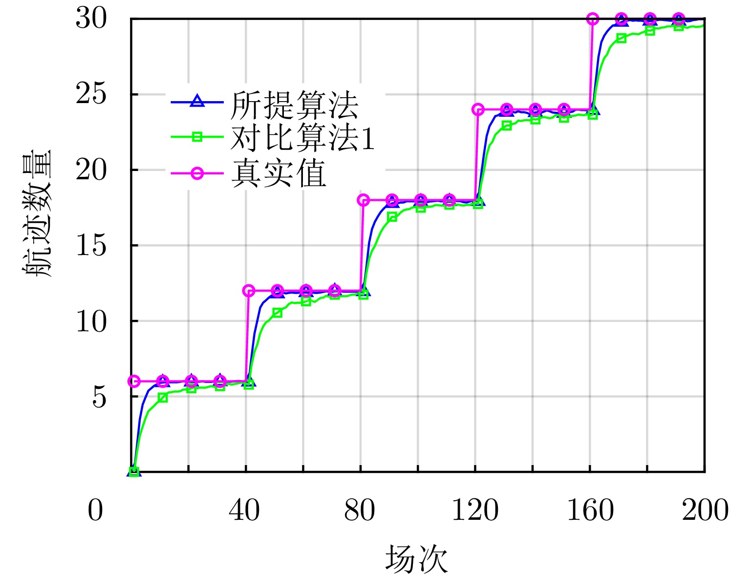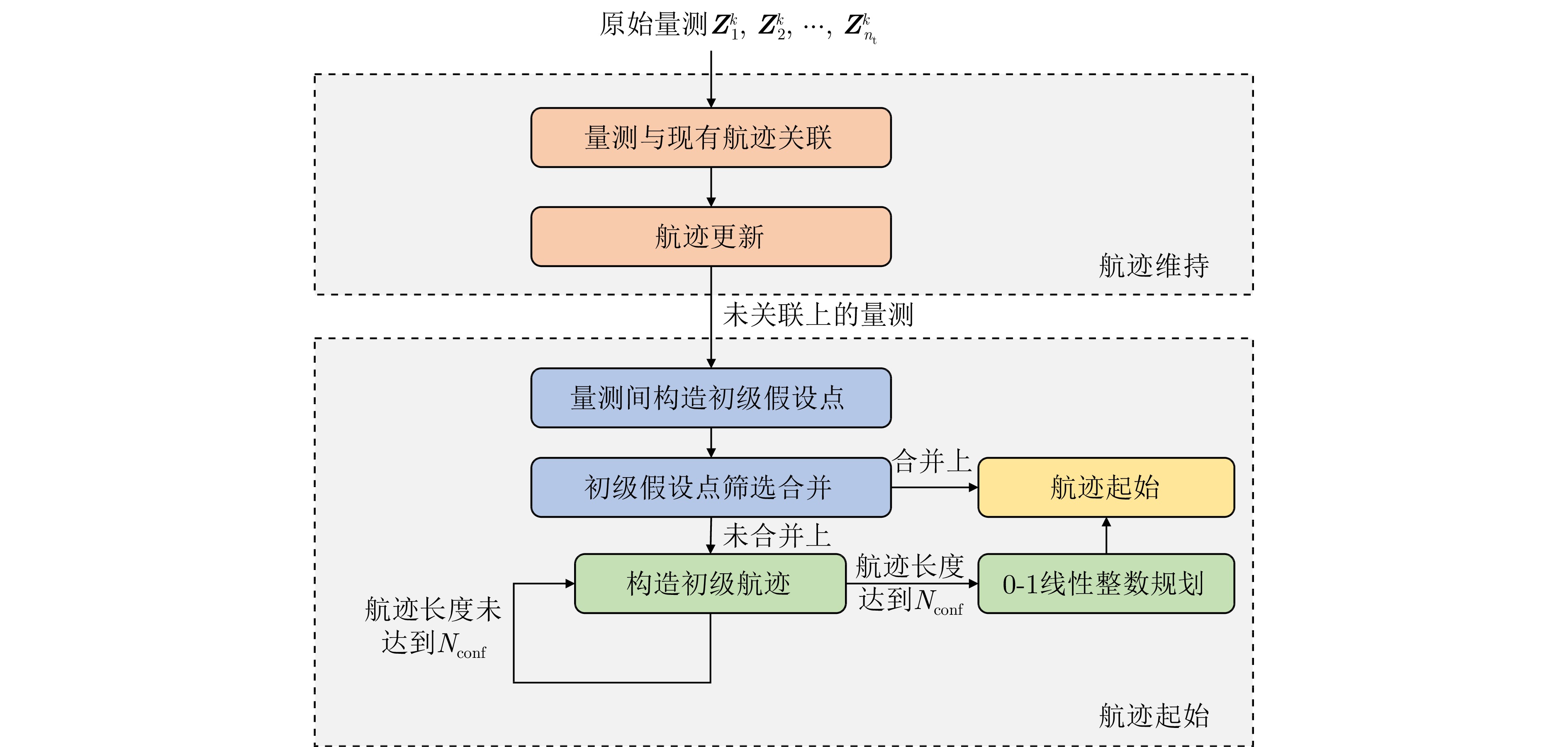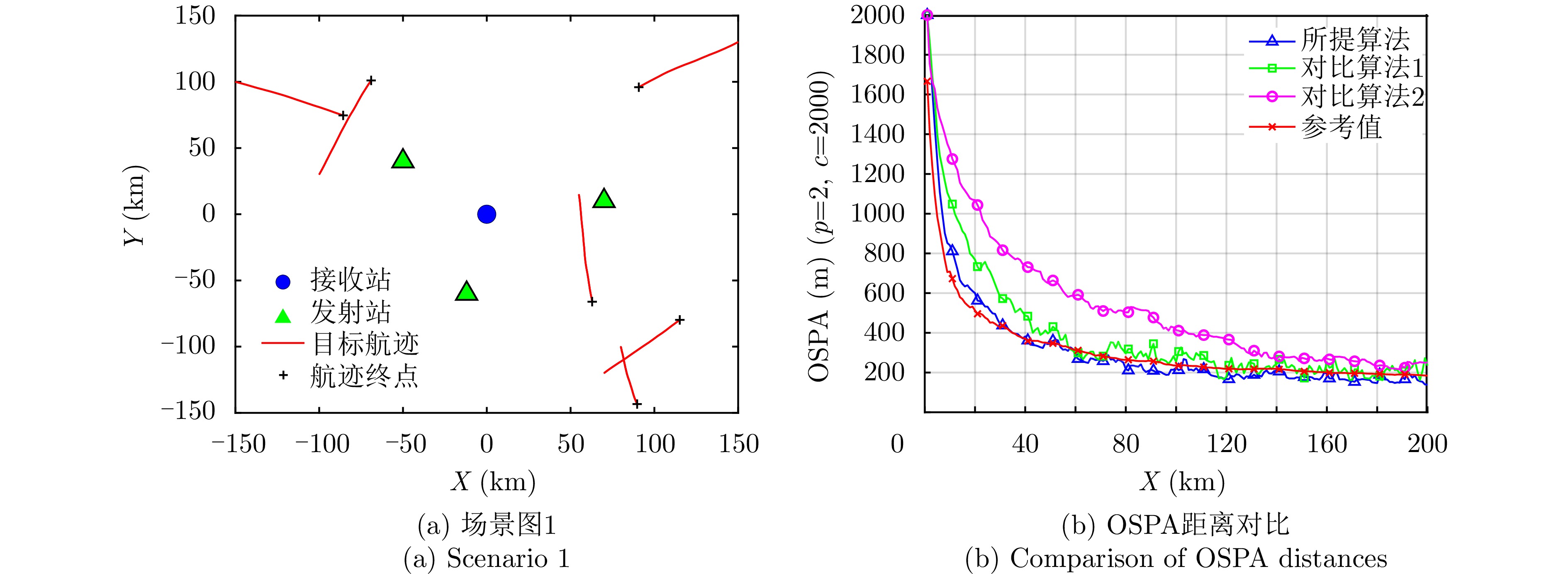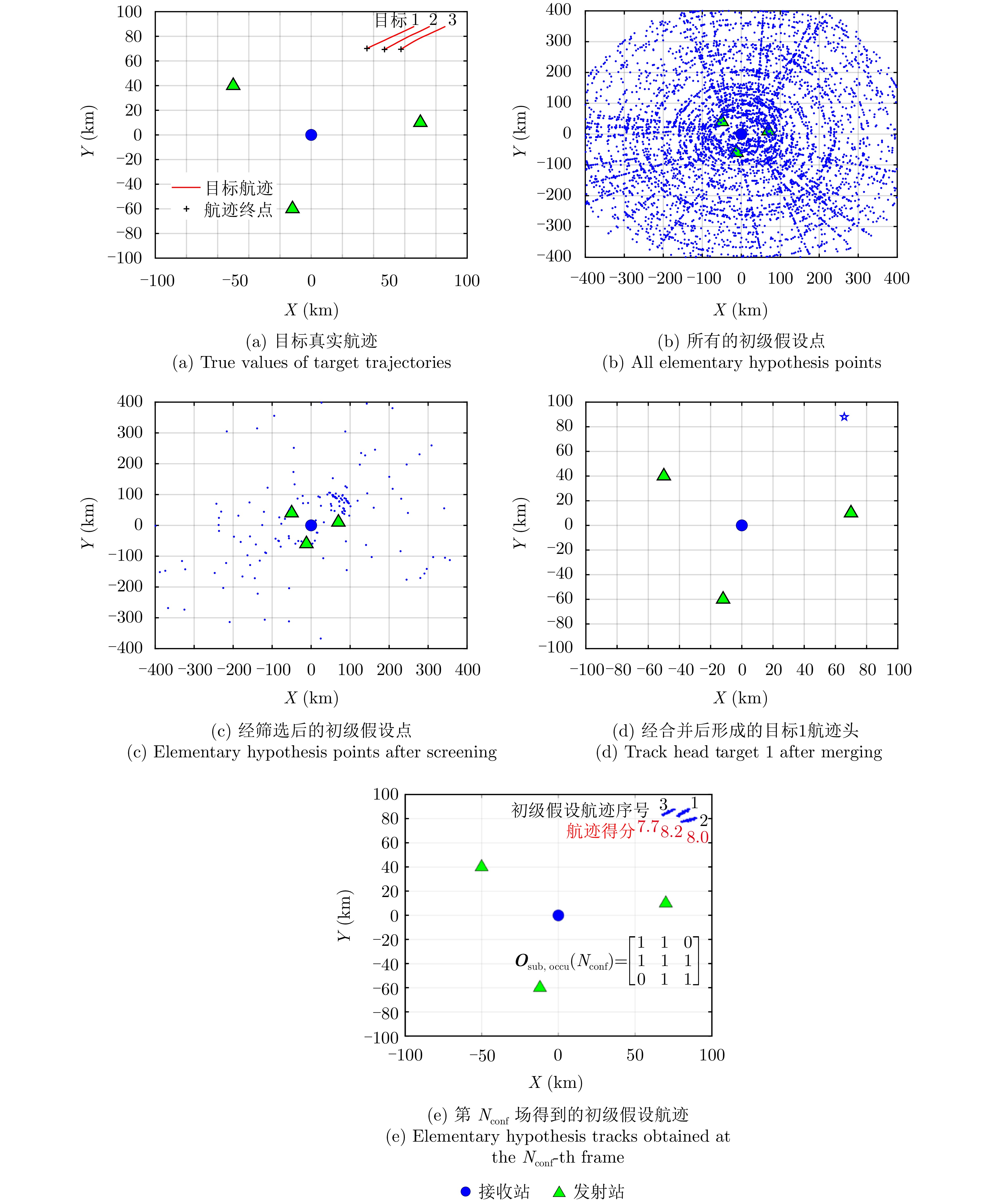 基于调频(FM)广播信号的外辐射源雷达有着检测概率低、虚警率高、量测精度差的特点,这给组网目标跟踪带来了极大挑战。一方面,较高的虚警率使计算量增加,组网算法的实时性受到考验;另一方面,检测概率低、方位角精度差造成冗余信息缺乏,量测关联与航迹起始变得困难。为解决这些问题,该文提出初级假设点和初级假设航迹的概念,以及基于此概念的FM广播外辐射源雷达网航迹起始算法。首先构造可能的低维关联假设,并解算出与其对应的初级假设点;随后关联不同时刻的初级假设点,形成多条可能的初级假设航迹;最后联合多场雷达网数据进行假设航迹判决,真实目标对应的初级假设航迹会得到确认,错误关联导致的虚假初级假设航迹会被剔除。相比于已有算法,所提算法有着更低的计算量,更快的航迹起始速度,仿真与实测结果均验证了所提算法的有效性。 基于调频(FM)广播信号的外辐射源雷达有着检测概率低、虚警率高、量测精度差的特点,这给组网目标跟踪带来了极大挑战。一方面,较高的虚警率使计算量增加,组网算法的实时性受到考验;另一方面,检测概率低、方位角精度差造成冗余信息缺乏,量测关联与航迹起始变得困难。为解决这些问题,该文提出初级假设点和初级假设航迹的概念,以及基于此概念的FM广播外辐射源雷达网航迹起始算法。首先构造可能的低维关联假设,并解算出与其对应的初级假设点;随后关联不同时刻的初级假设点,形成多条可能的初级假设航迹;最后联合多场雷达网数据进行假设航迹判决,真实目标对应的初级假设航迹会得到确认,错误关联导致的虚假初级假设航迹会被剔除。相比于已有算法,所提算法有着更低的计算量,更快的航迹起始速度,仿真与实测结果均验证了所提算法的有效性。