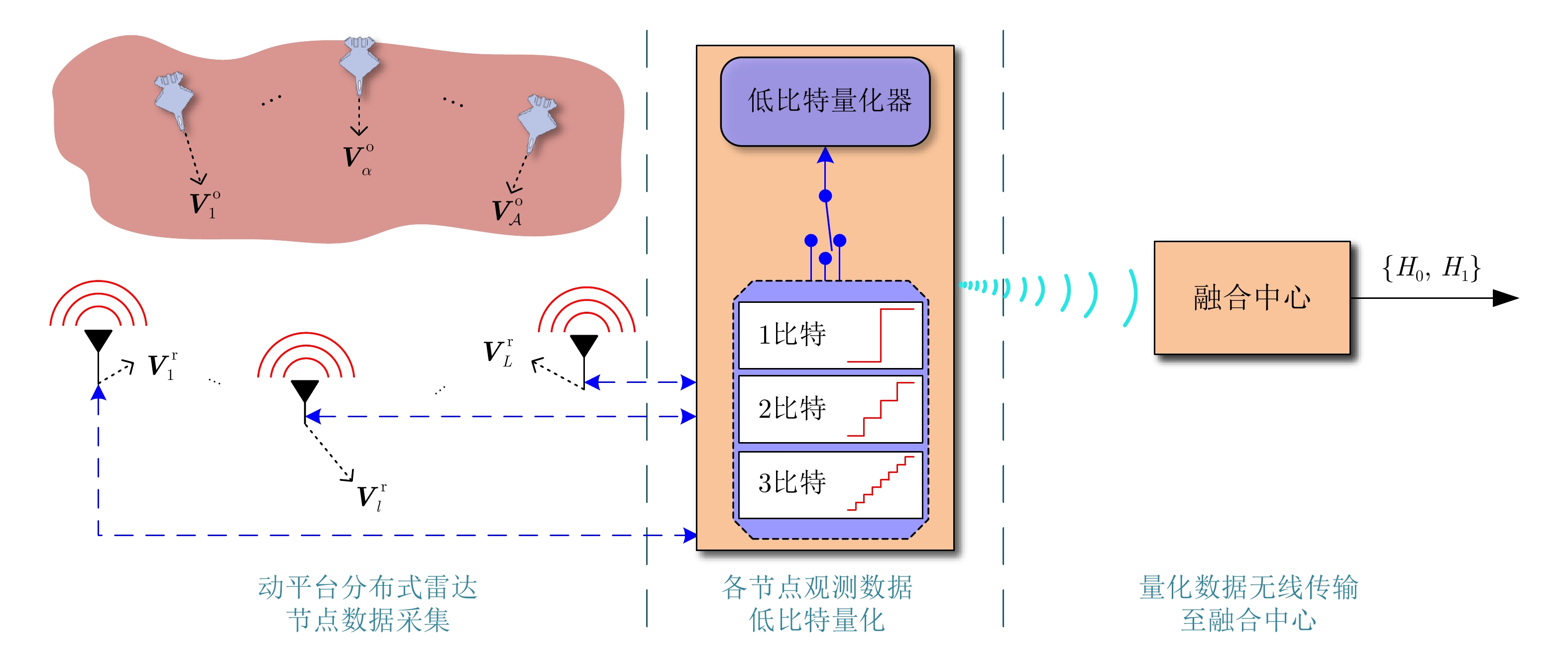 动平台分布式雷达系统可有效提升系统的生存能力和探测性能,但运动平台之间通常采用无线传输方式,难以配备大通信带宽以传输完整的信号数据,给雷达系统的高性能检测带来极大挑战。由于低比特量化技术可显著降低分布式系统的通信传输代价和计算资源消耗,该文针对低信噪比弱信号环境下提出了动平台分布式雷达系统的低比特量化运动目标检测算法。首先,根据系统资源将各节点的多脉冲观测数据选择对应位数的低比特量化器进行量化,推导了关于量化器和多个目标状态的似然函数。其次,证明了低比特量化数据对应似然函数关于未知目标反射系数的凸性,并基于该特性设计了多普勒频移和反射系数的联合估计器。然后,针对探测区域中存在的多个状态未知目标设计了多目标检测器,推导了其恒虚警率门限。最后,通过推导系统的渐近性能设计了最优低比特量化器,在保证系统鲁棒性的同时有效提升了系统的检测性能。仿真实验分析了所提算法的检测与估计性能,结果证明了所提算法在低信噪比弱信号环境下的有效性,同时表明低比特量化数据可在仅占用低于20%通信带宽的基础上实现接近高精度(16比特量化)数据对应的检测和估计性能,且2比特量化策略可作为检测性能和雷达系统资源消耗的折中选择。 动平台分布式雷达系统可有效提升系统的生存能力和探测性能,但运动平台之间通常采用无线传输方式,难以配备大通信带宽以传输完整的信号数据,给雷达系统的高性能检测带来极大挑战。由于低比特量化技术可显著降低分布式系统的通信传输代价和计算资源消耗,该文针对低信噪比弱信号环境下提出了动平台分布式雷达系统的低比特量化运动目标检测算法。首先,根据系统资源将各节点的多脉冲观测数据选择对应位数的低比特量化器进行量化,推导了关于量化器和多个目标状态的似然函数。其次,证明了低比特量化数据对应似然函数关于未知目标反射系数的凸性,并基于该特性设计了多普勒频移和反射系数的联合估计器。然后,针对探测区域中存在的多个状态未知目标设计了多目标检测器,推导了其恒虚警率门限。最后,通过推导系统的渐近性能设计了最优低比特量化器,在保证系统鲁棒性的同时有效提升了系统的检测性能。仿真实验分析了所提算法的检测与估计性能,结果证明了所提算法在低信噪比弱信号环境下的有效性,同时表明低比特量化数据可在仅占用低于20%通信带宽的基础上实现接近高精度(16比特量化)数据对应的检测和估计性能,且2比特量化策略可作为检测性能和雷达系统资源消耗的折中选择。