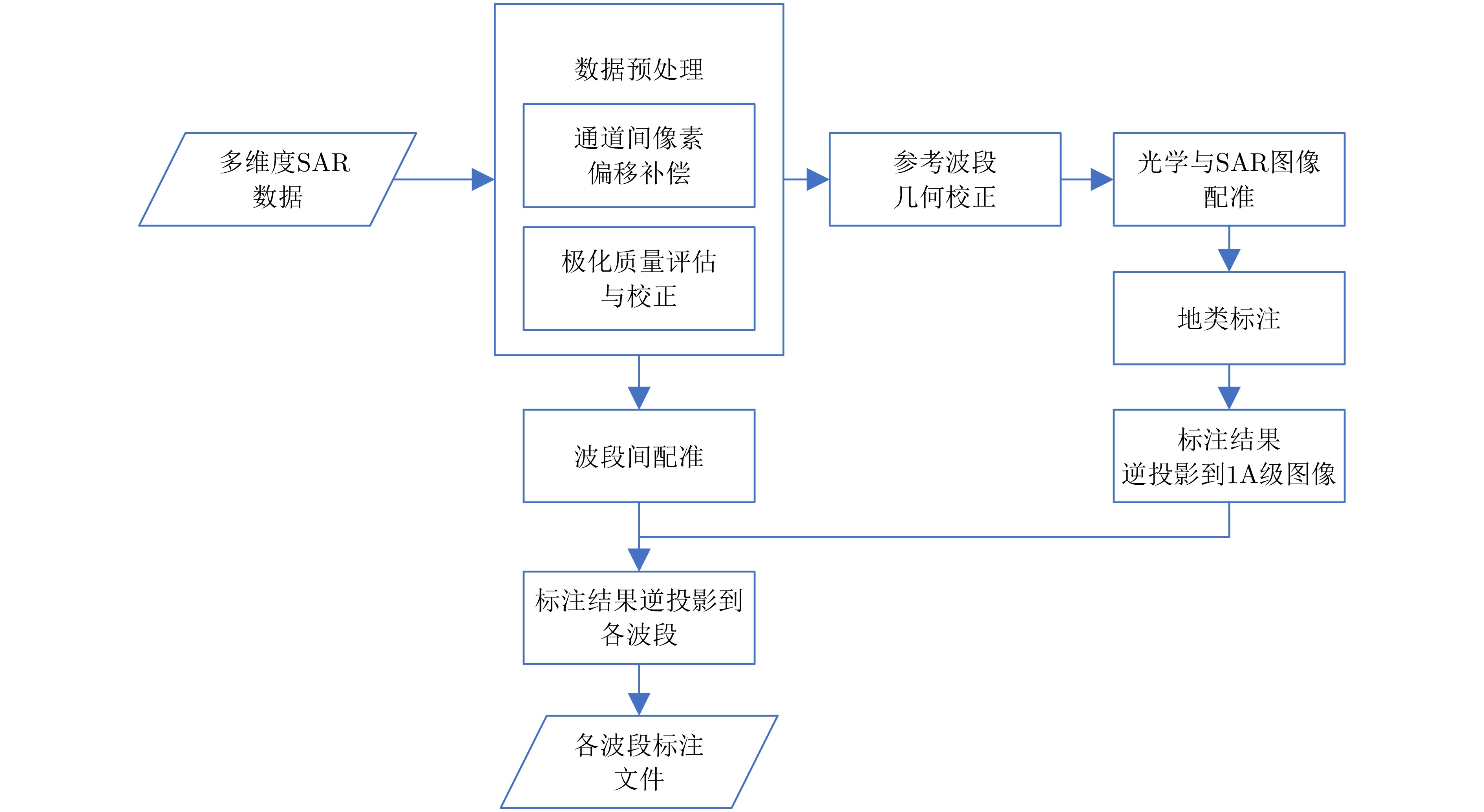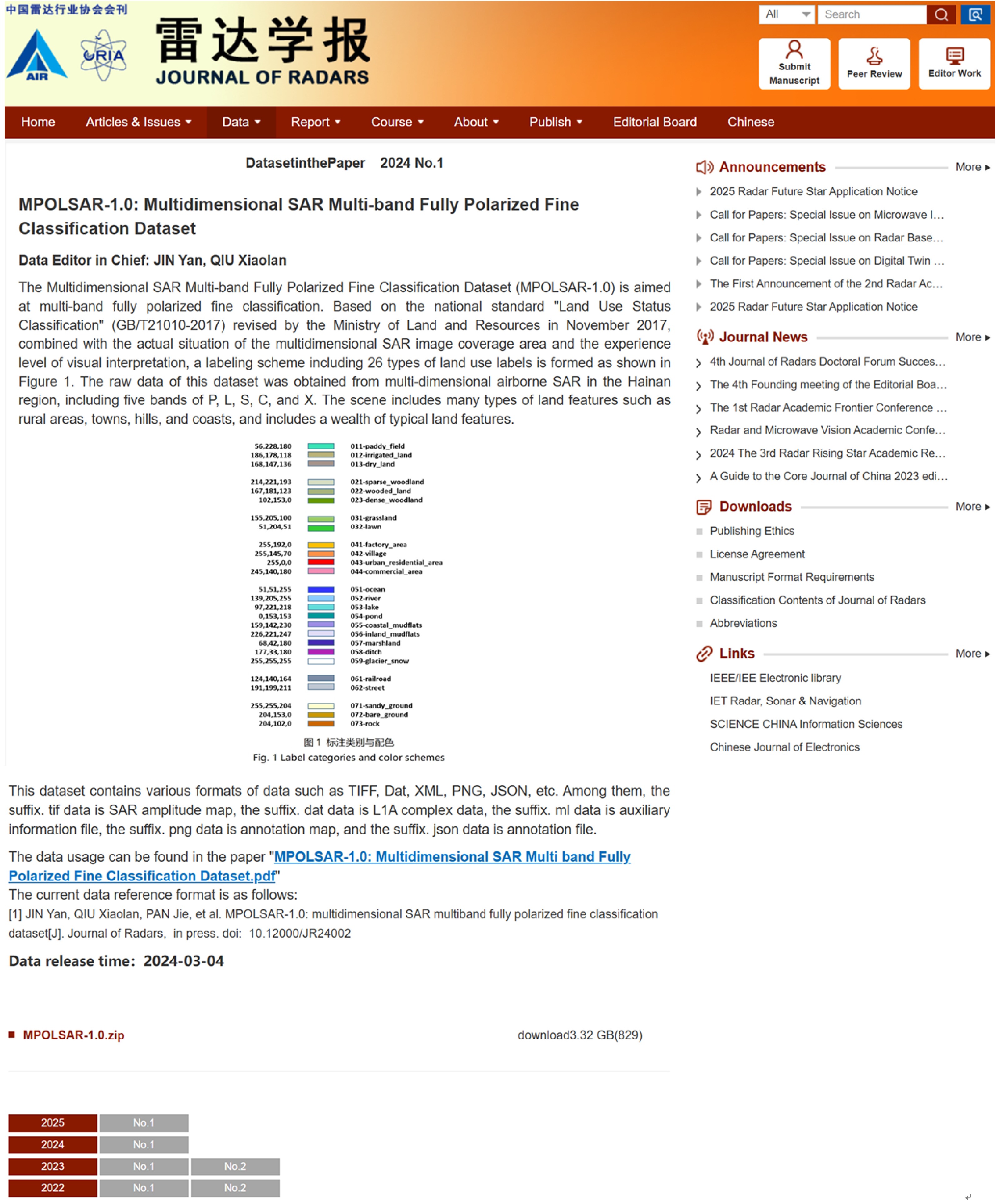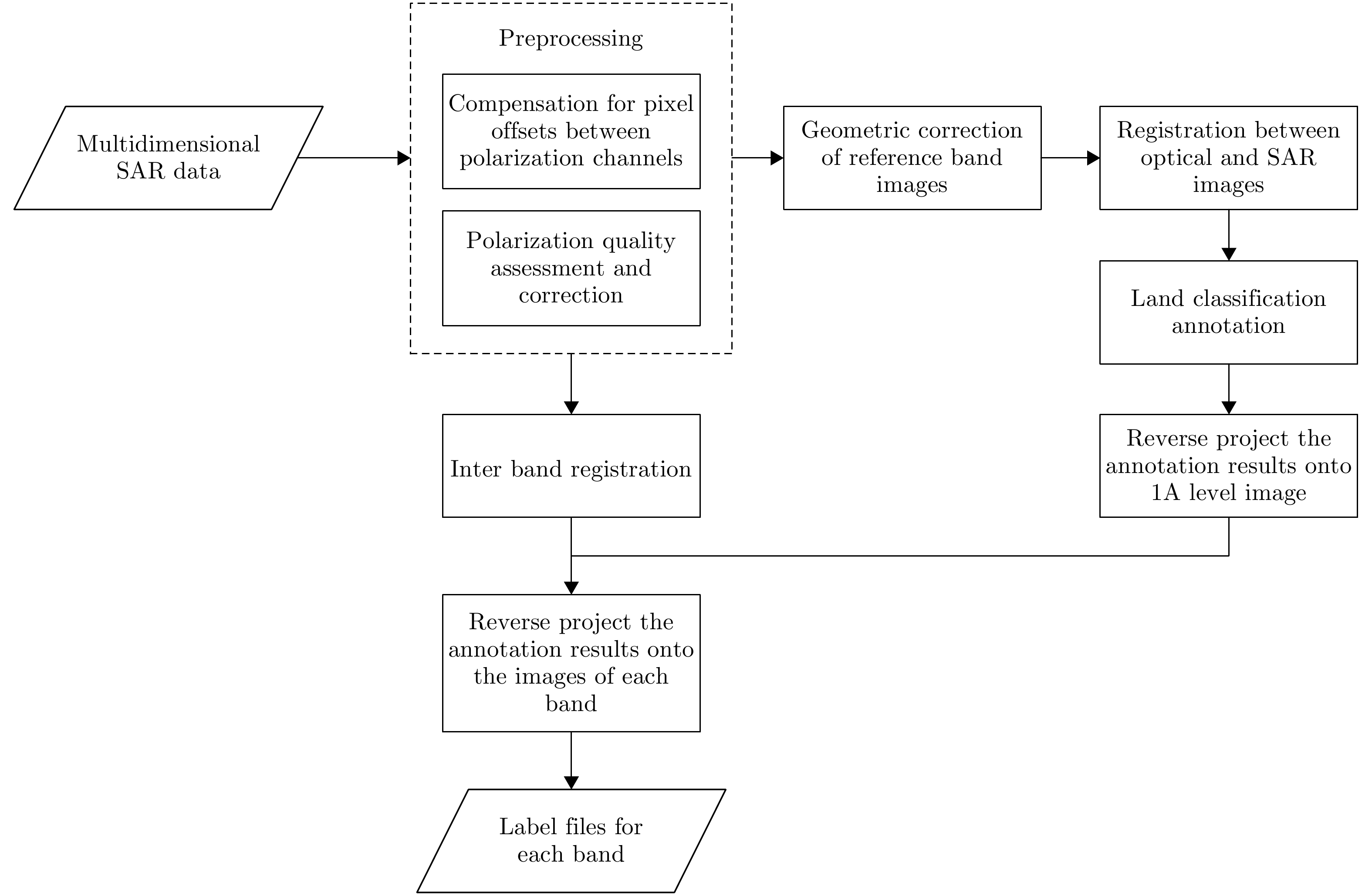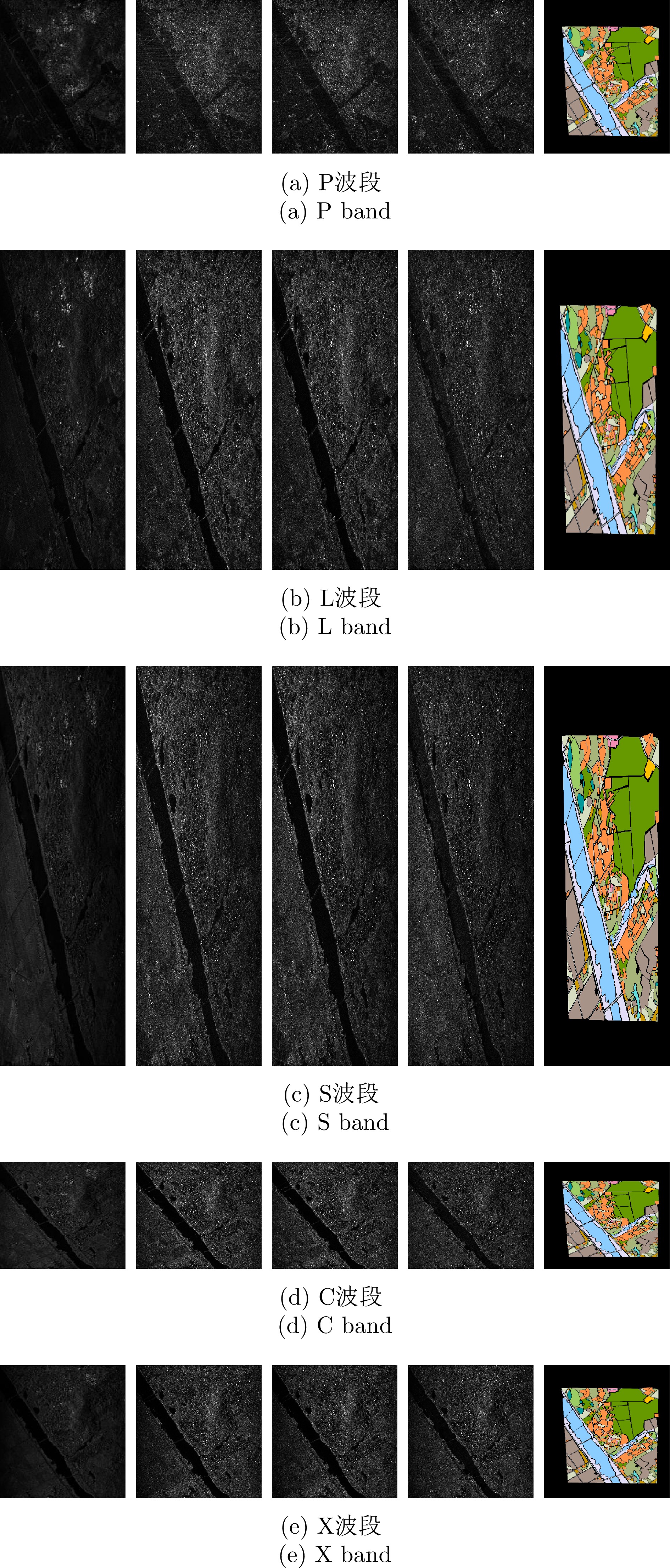地物精细分类是合成孔径雷达(SAR)的主要应用方向之一。在多波段全极化SAR工作模式下,可充分获取目标不同波段信息和极化响应特征,有望提高目标分类精度。然而国内外现有的数据集仅有个别波段、少数地区、少量样本的低分辨率全极化分类数据。为推动多波段全极化SAR分类应用的发展,在高分航空观测系统应用校飞与验证项目支持下,利用多维度SAR在海南的校飞数据构建了一个样本量充分大、地物类别较为丰富、分类可靠性较高的多波段全极化精细分类数据集。该文概述了该数据集的构成,给出了发布数据(MPOLSAR-1.0)的信息描述方式、数据集制作流程和方法,并分别基于极化特征分类方法和经典机器学习分类方法给出了初步的分类实验结果,为该数据集的共享和应用提供支撑。 地物精细分类是合成孔径雷达(SAR)的主要应用方向之一。在多波段全极化SAR工作模式下,可充分获取目标不同波段信息和极化响应特征,有望提高目标分类精度。然而国内外现有的数据集仅有个别波段、少数地区、少量样本的低分辨率全极化分类数据。为推动多波段全极化SAR分类应用的发展,在高分航空观测系统应用校飞与验证项目支持下,利用多维度SAR在海南的校飞数据构建了一个样本量充分大、地物类别较为丰富、分类可靠性较高的多波段全极化精细分类数据集。该文概述了该数据集的构成,给出了发布数据(MPOLSAR-1.0)的信息描述方式、数据集制作流程和方法,并分别基于极化特征分类方法和经典机器学习分类方法给出了初步的分类实验结果,为该数据集的共享和应用提供支撑。