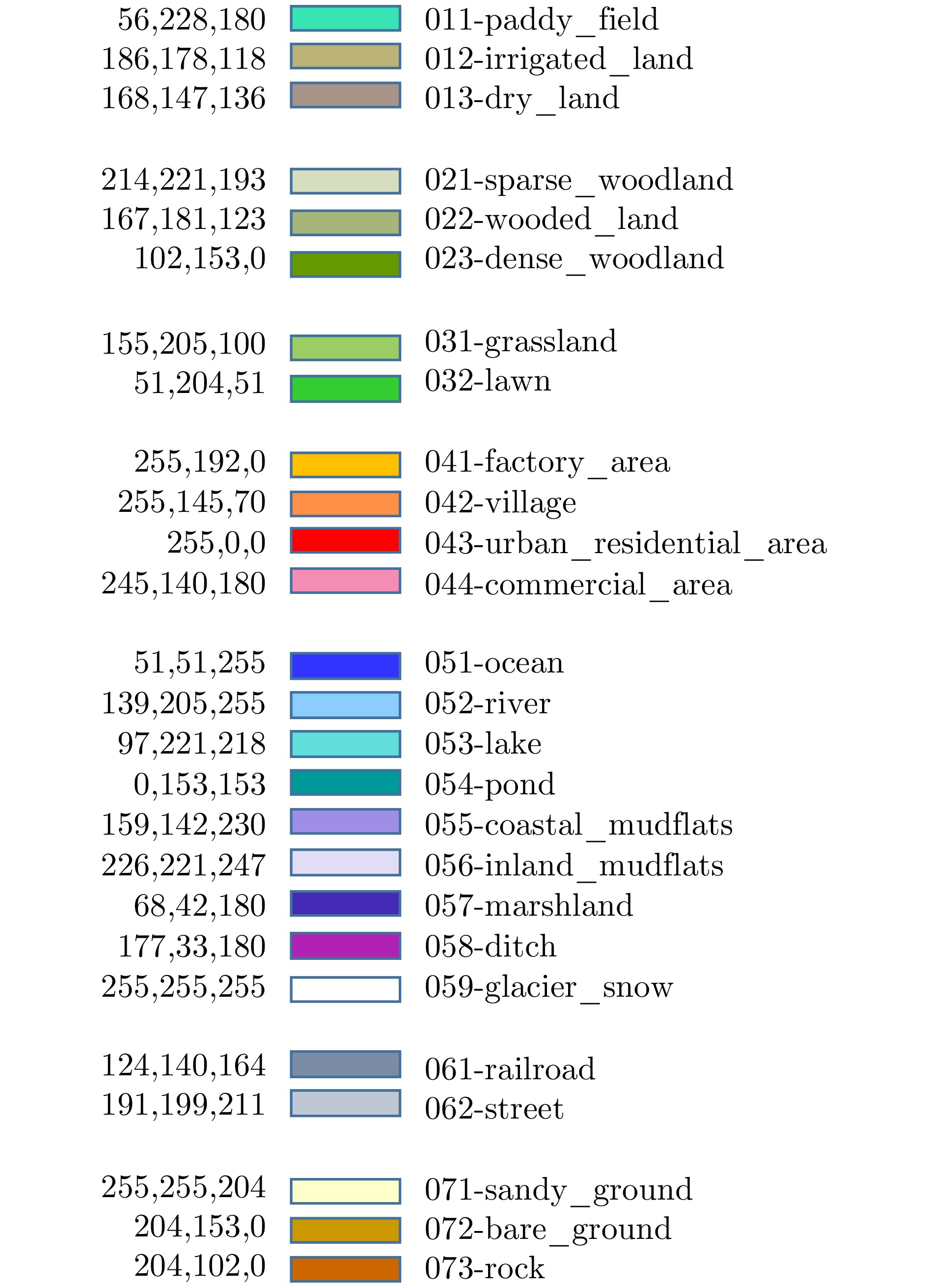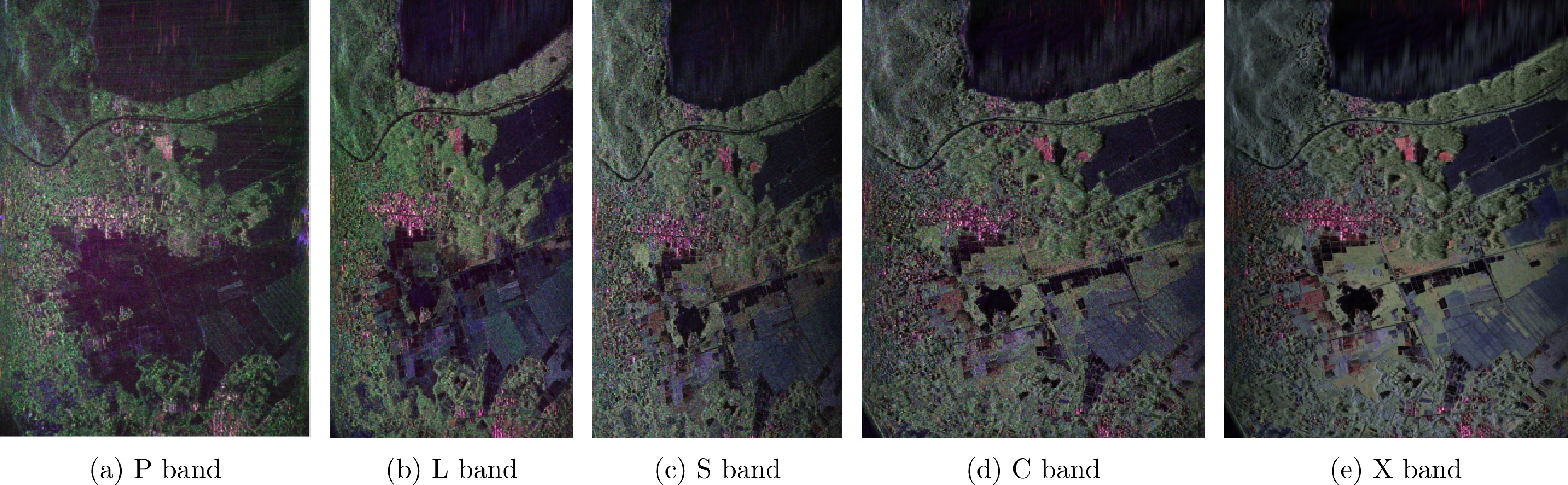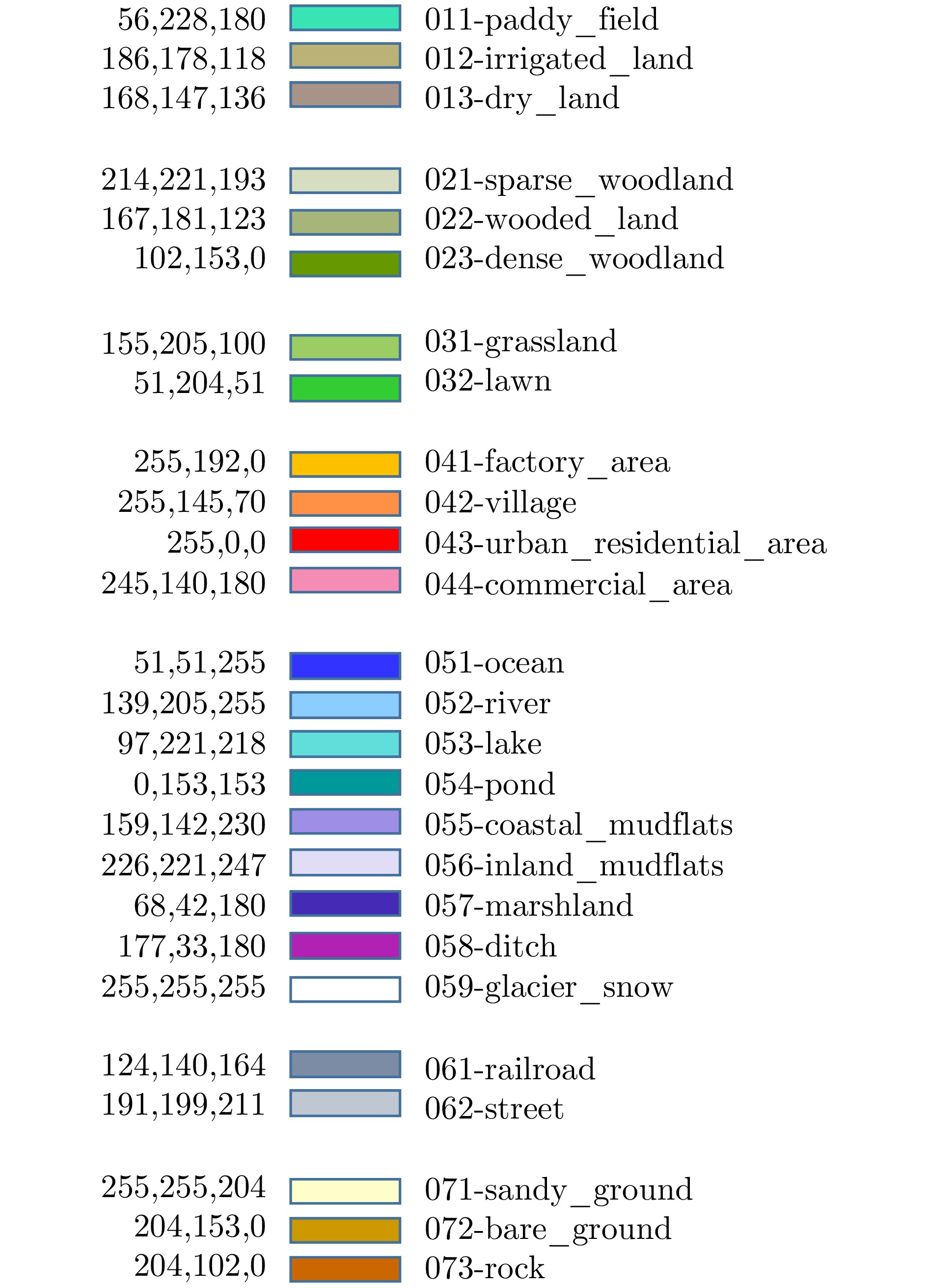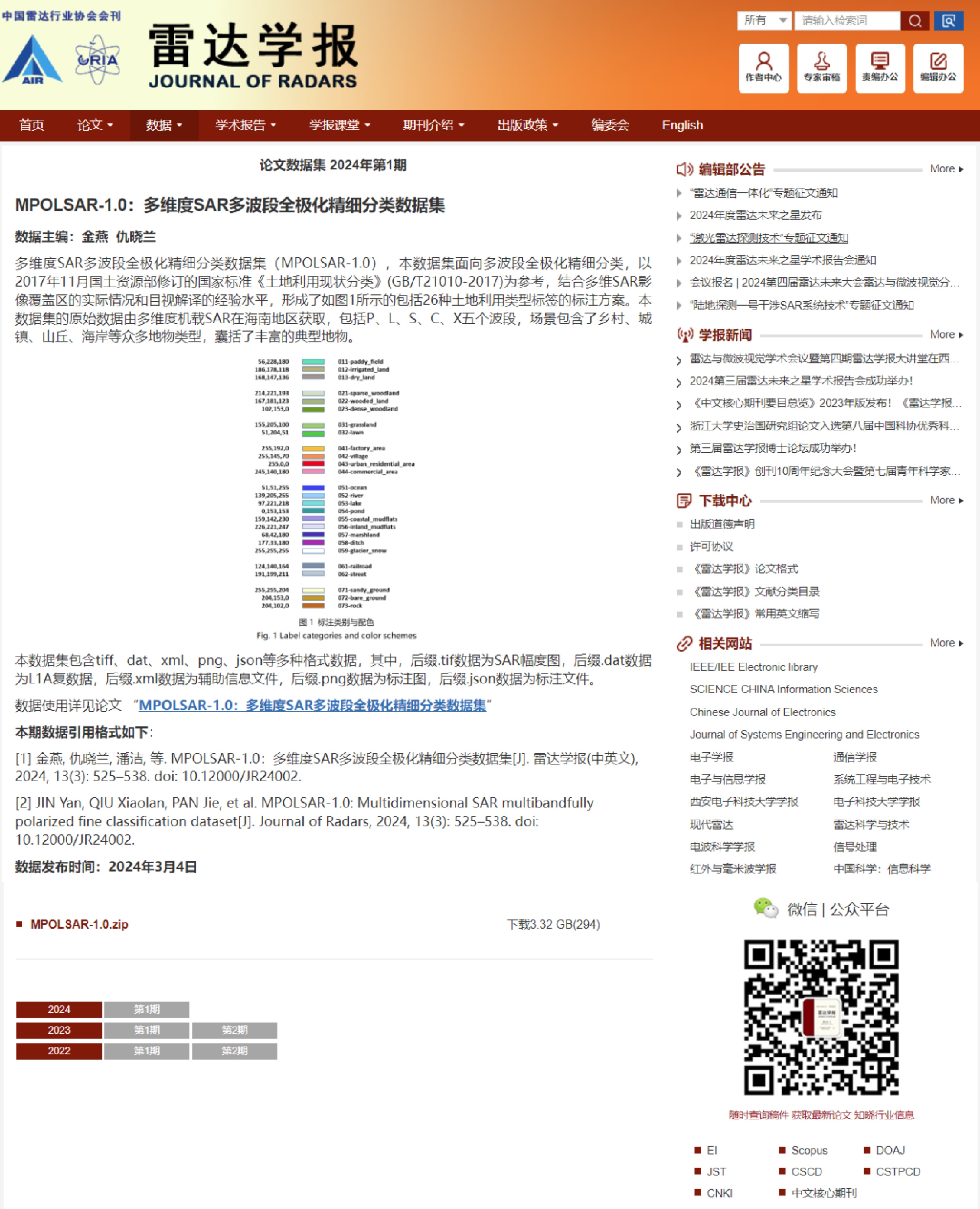 地物精细分类是合成孔径雷达(SAR)的主要应用方向之一。在多波段全极化SAR工作模式下,可充分获取目标不同波段信息和极化响应特征,有望提高目标分类精度。然而国内外现有的数据集仅有个别波段、少数地区、少量样本的低分辨率全极化分类数据。为推动多波段全极化SAR分类应用的发展,在高分航空观测系统应用校飞与验证项目支持下,利用多维度SAR在海南的校飞数据构建了一个样本量充分大、地物类别较为丰富、分类可靠性较高的多波段全极化精细分类数据集。该文概述了该数据集的构成,给出了发布数据(MPOLSAR-1.0)的信息描述方式、数据集制作流程和方法,并分别基于极化特征分类方法和经典机器学习分类方法给出了初步的分类实验结果,为该数据集的共享和应用提供支撑。 地物精细分类是合成孔径雷达(SAR)的主要应用方向之一。在多波段全极化SAR工作模式下,可充分获取目标不同波段信息和极化响应特征,有望提高目标分类精度。然而国内外现有的数据集仅有个别波段、少数地区、少量样本的低分辨率全极化分类数据。为推动多波段全极化SAR分类应用的发展,在高分航空观测系统应用校飞与验证项目支持下,利用多维度SAR在海南的校飞数据构建了一个样本量充分大、地物类别较为丰富、分类可靠性较高的多波段全极化精细分类数据集。该文概述了该数据集的构成,给出了发布数据(MPOLSAR-1.0)的信息描述方式、数据集制作流程和方法,并分别基于极化特征分类方法和经典机器学习分类方法给出了初步的分类实验结果,为该数据集的共享和应用提供支撑。