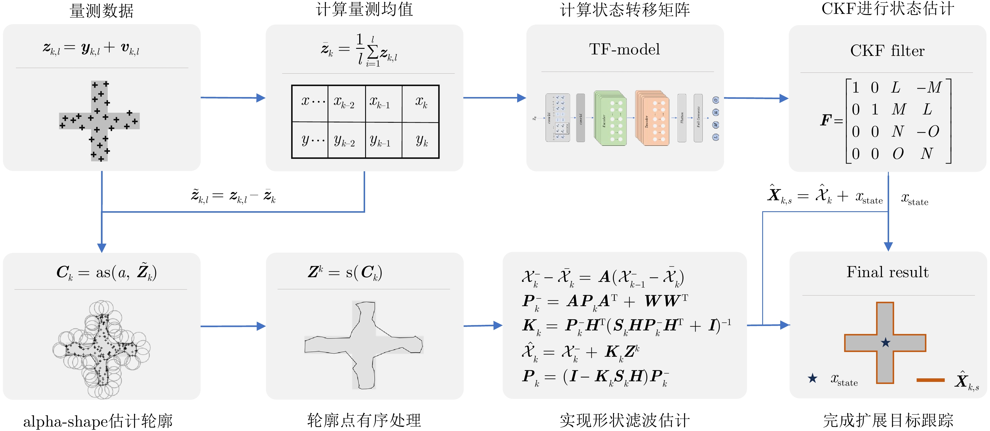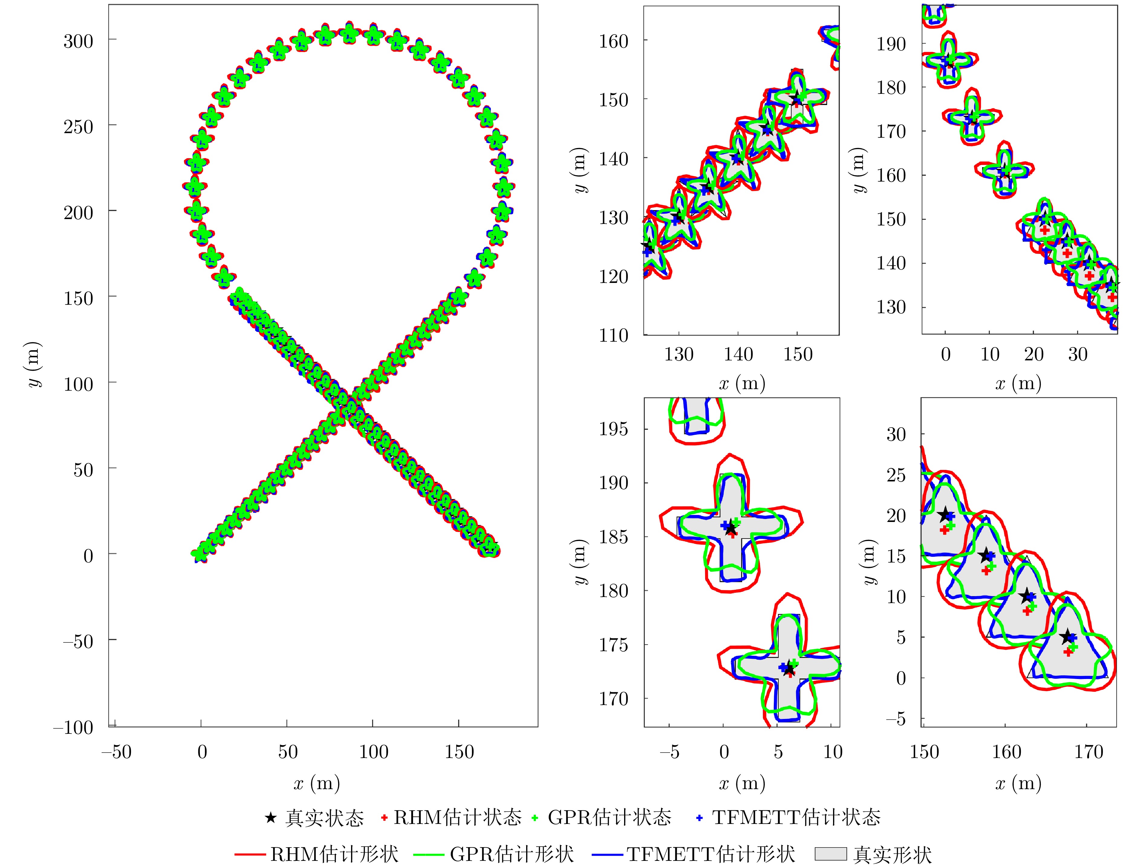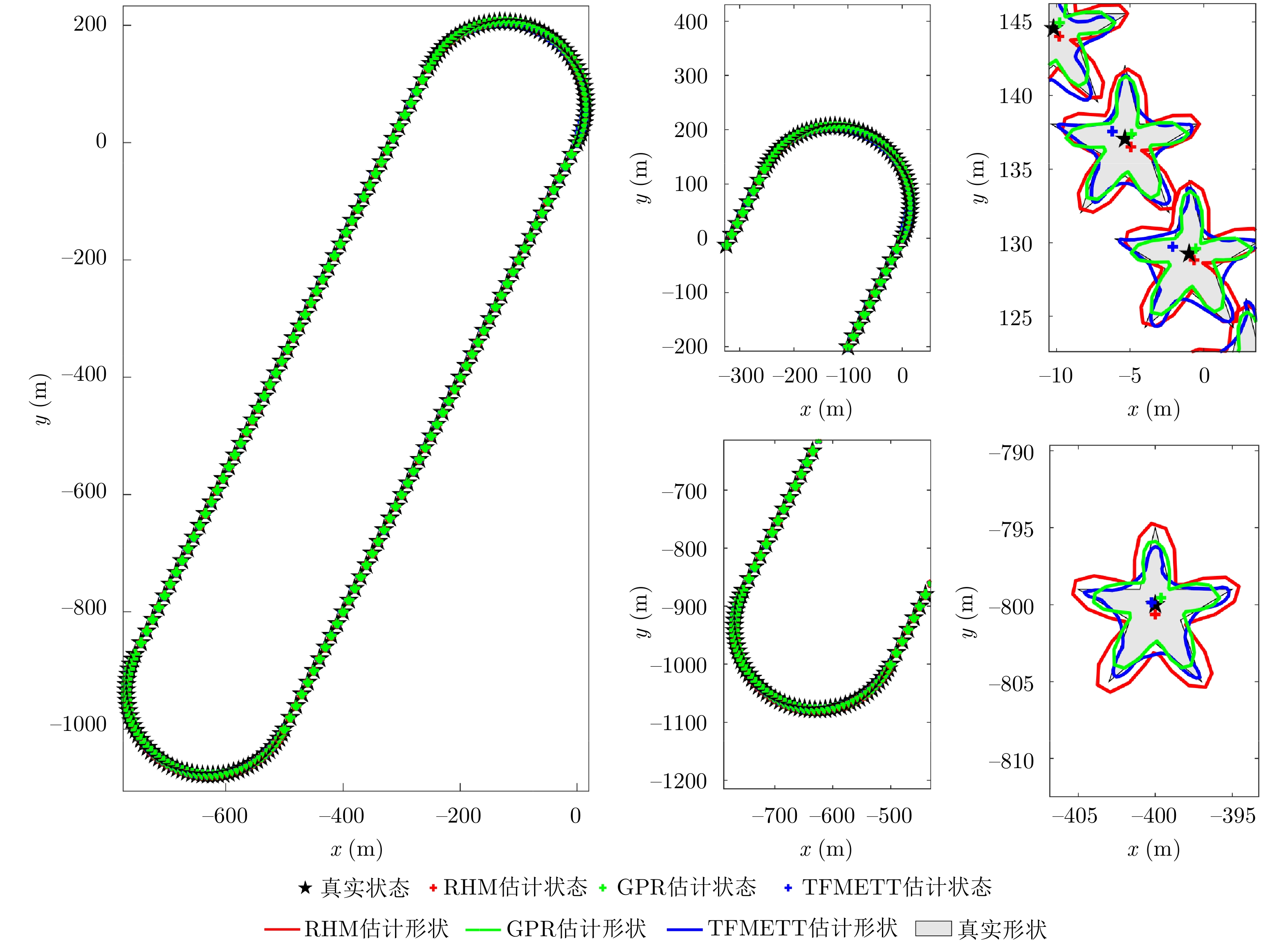 针对复杂的机动扩展目标跟踪问题,利用Transformer网络设计了一种有效的星凸不规则形状机动扩展目标跟踪方法。首先,该文研究利用alpha-shape算法建立了星凸形状的变化模型,实现了静态场景下的星凸形扩展目标的形状估计。然后,通过对目标状态转移矩阵进行重新设计,结合Transformer网络对机动扩展目标运动状态转移矩阵进行实时估计,实现了对复杂机动目标运动过程的精准跟踪。进一步地,将估计得到的形状轮廓与运动状态进行融合,最终实现了对星凸形机动扩展目标的实时跟踪。最后,通过构造复杂的机动扩展目标跟踪场景,利用多重性能指标测试算法对形状和运动状态的综合估计性能,验证了算法的有效性。 针对复杂的机动扩展目标跟踪问题,利用Transformer网络设计了一种有效的星凸不规则形状机动扩展目标跟踪方法。首先,该文研究利用alpha-shape算法建立了星凸形状的变化模型,实现了静态场景下的星凸形扩展目标的形状估计。然后,通过对目标状态转移矩阵进行重新设计,结合Transformer网络对机动扩展目标运动状态转移矩阵进行实时估计,实现了对复杂机动目标运动过程的精准跟踪。进一步地,将估计得到的形状轮廓与运动状态进行融合,最终实现了对星凸形机动扩展目标的实时跟踪。最后,通过构造复杂的机动扩展目标跟踪场景,利用多重性能指标测试算法对形状和运动状态的综合估计性能,验证了算法的有效性。
