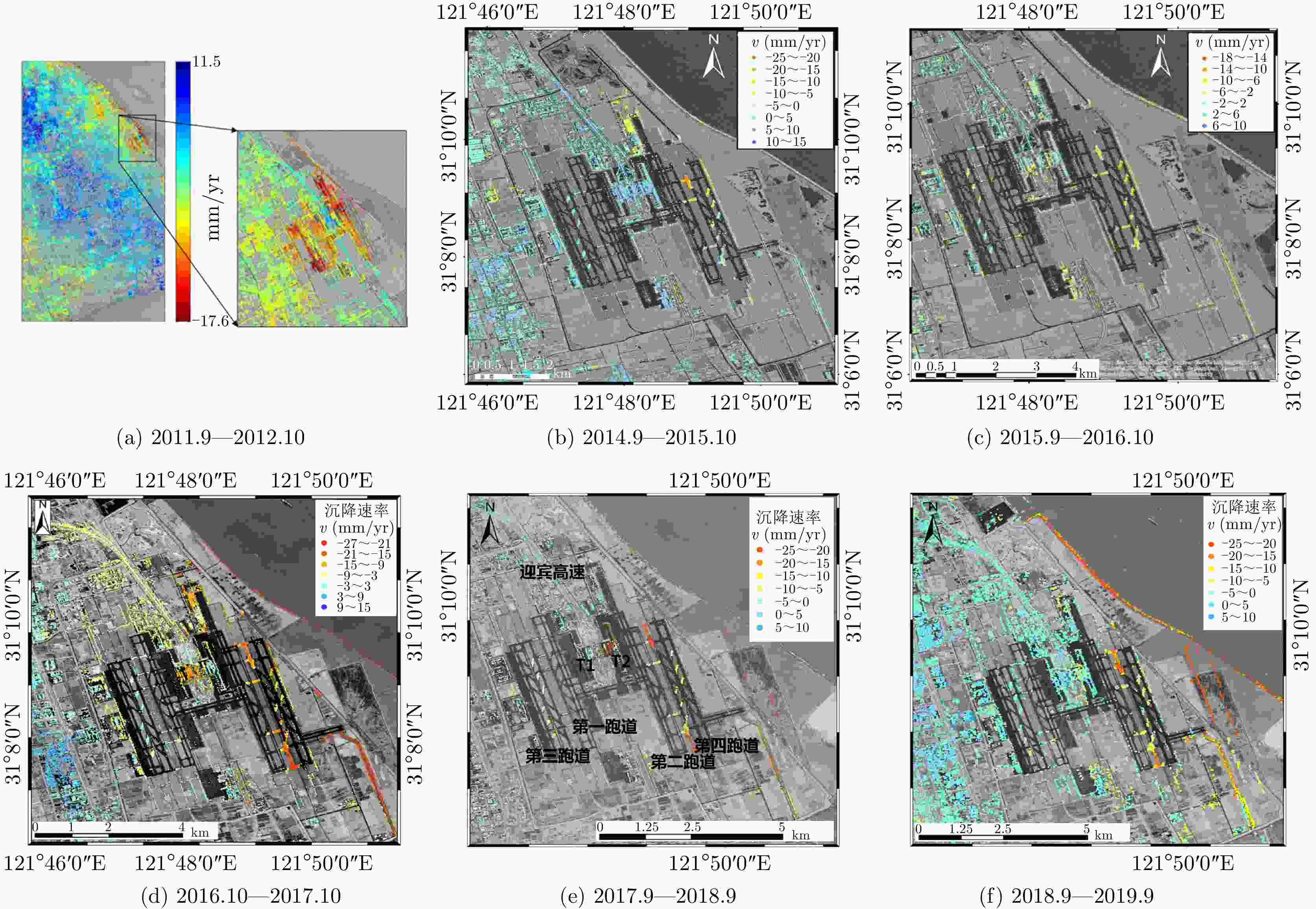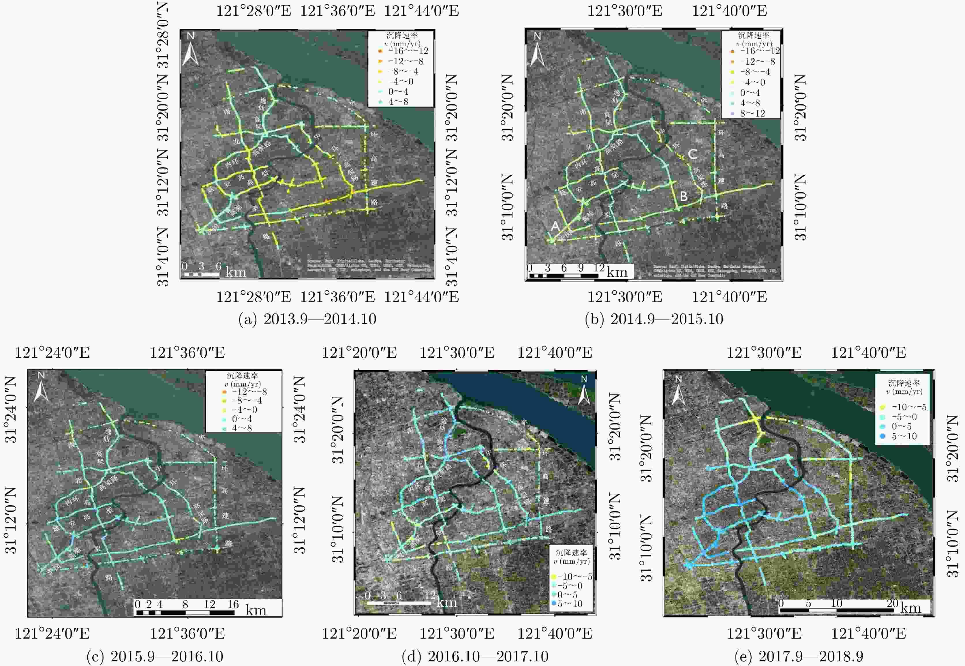 年份 沉降速率范围(mm/yr) 沉降相干点百分比(%) 沉降点平均速率(mm/yr) 回弹点平均速率(mm/yr) 2013.9—2014.10 –14~8 55.46 –2.651 1.028 2014.9—2015.10 –15~11 46.31 –2.433 0.928 2015.9—2016.10 –14~10 39.54 –1.953 1.039 2016.10—2017.10 –10~10 49.97 –2.932 2.602 2017.9—2018.9 –10~10 29.00 –2.164 2.548 -