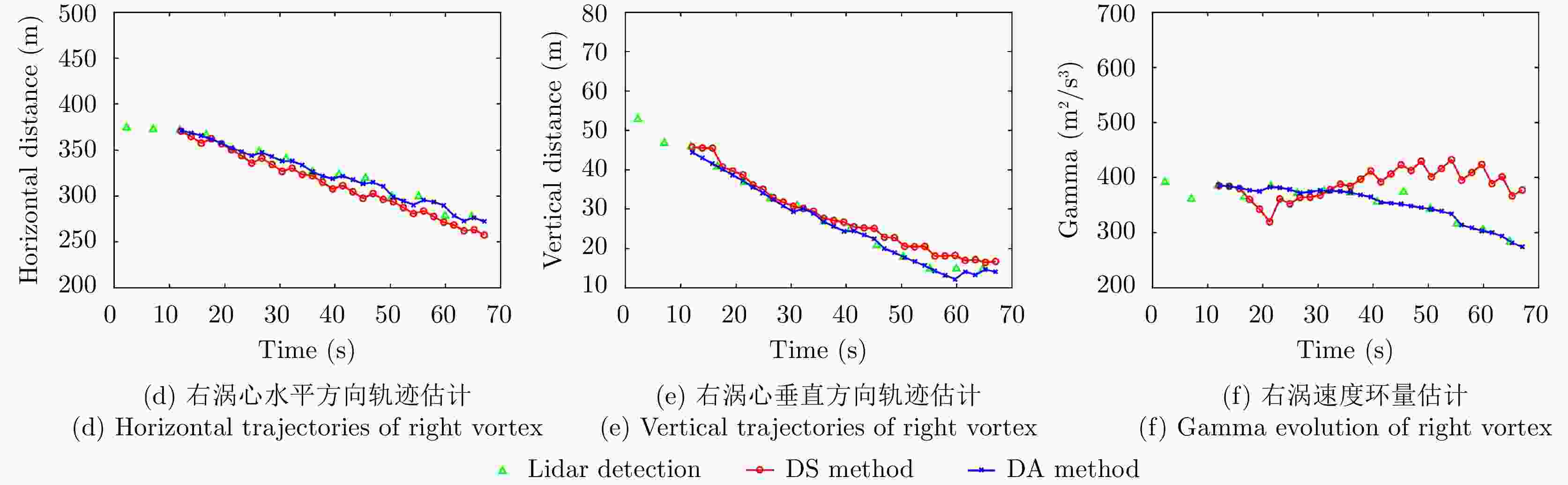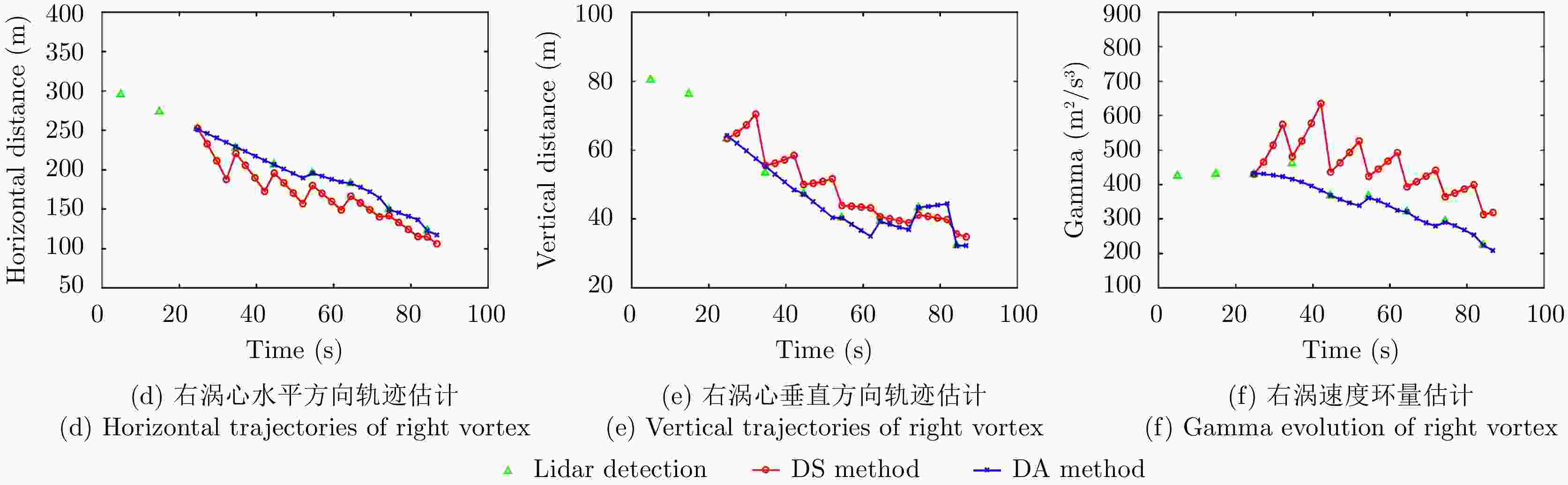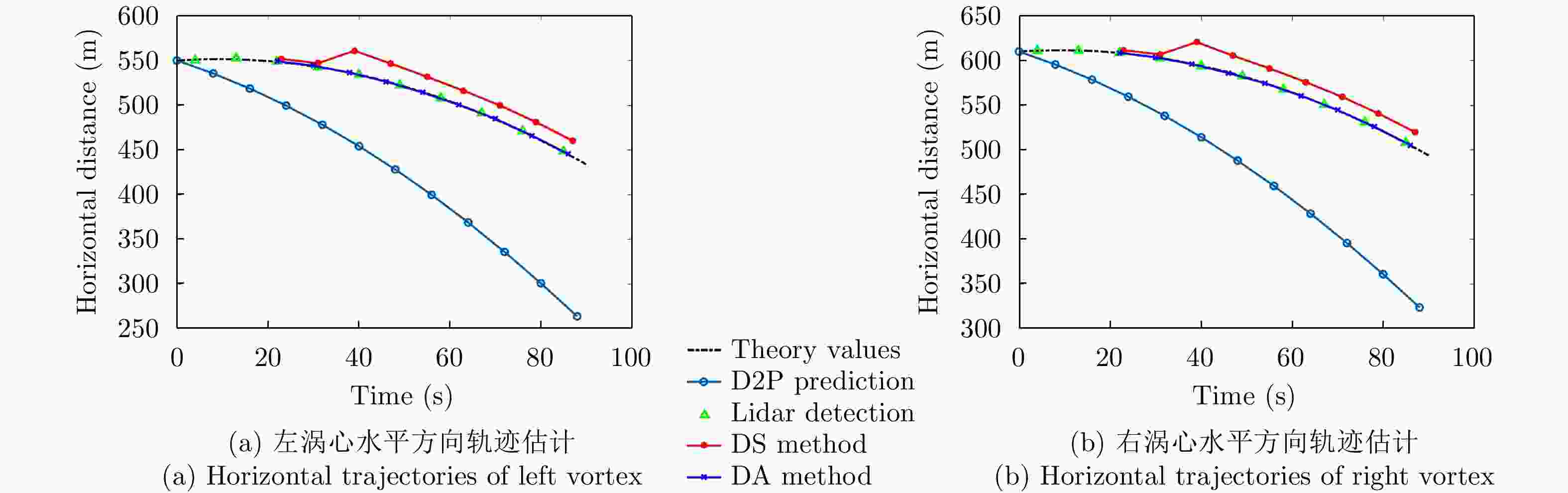 表 1 激光雷达探测参数设置 Table 1. Detection parameters of the Lidar 主要参数 量值 雷达波长 1.55 μm 脉冲宽度 170 ns 时间窗长度 120 ns 距离门宽度 21 m 采样率 50 MHz 脉冲积累数 1500 信号噪声比 –5 dB 扫描速度 2°/s 扫描范围 0~15° 表 2 飞机尾流预测位置相对误差 Table 2. Relative error of predict trajectories 主要参数 DS method (%) DA method (%) 横向风