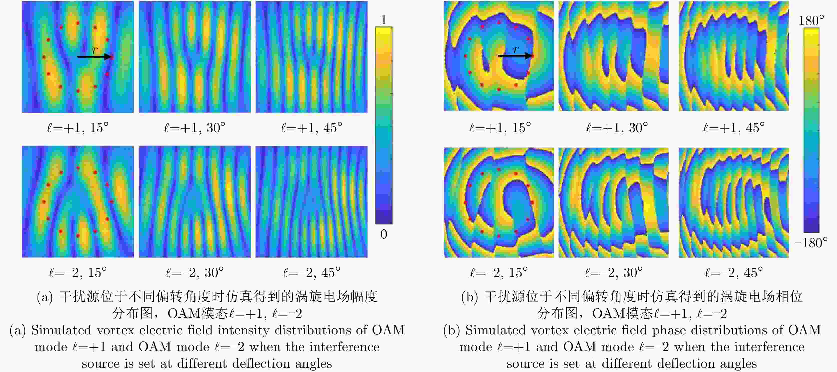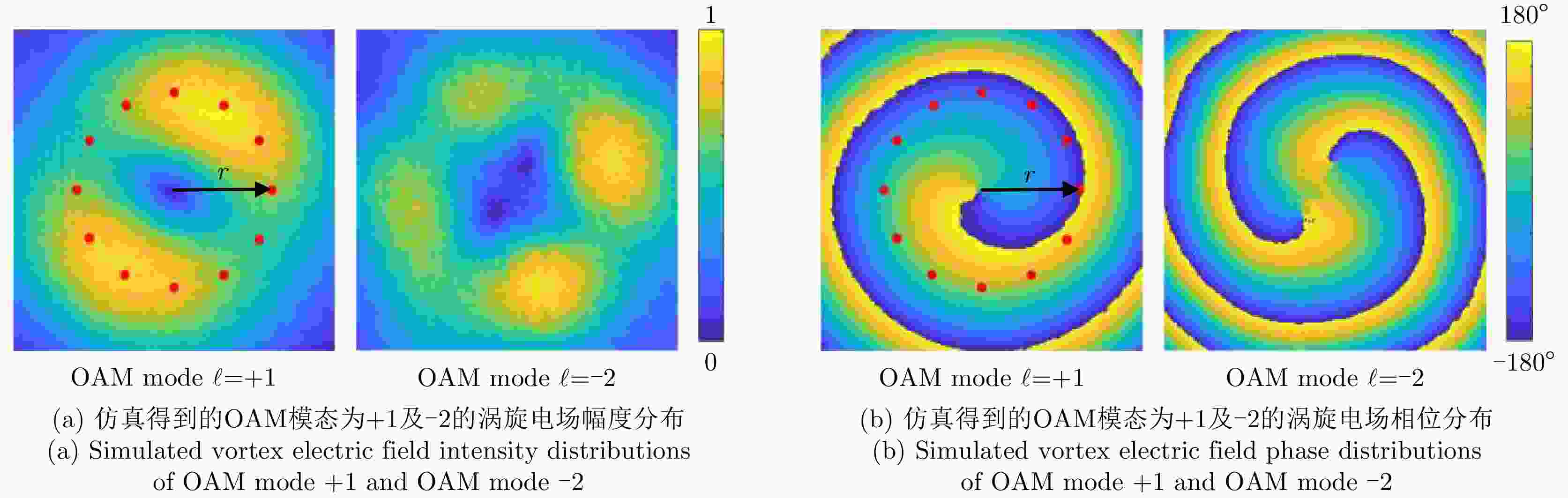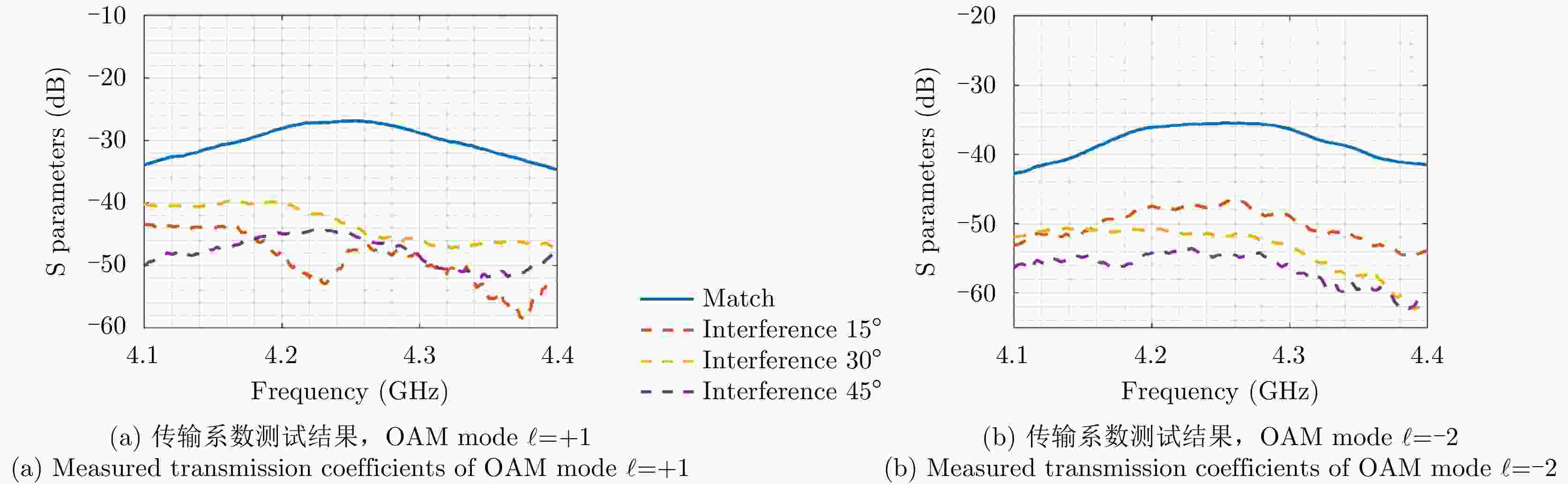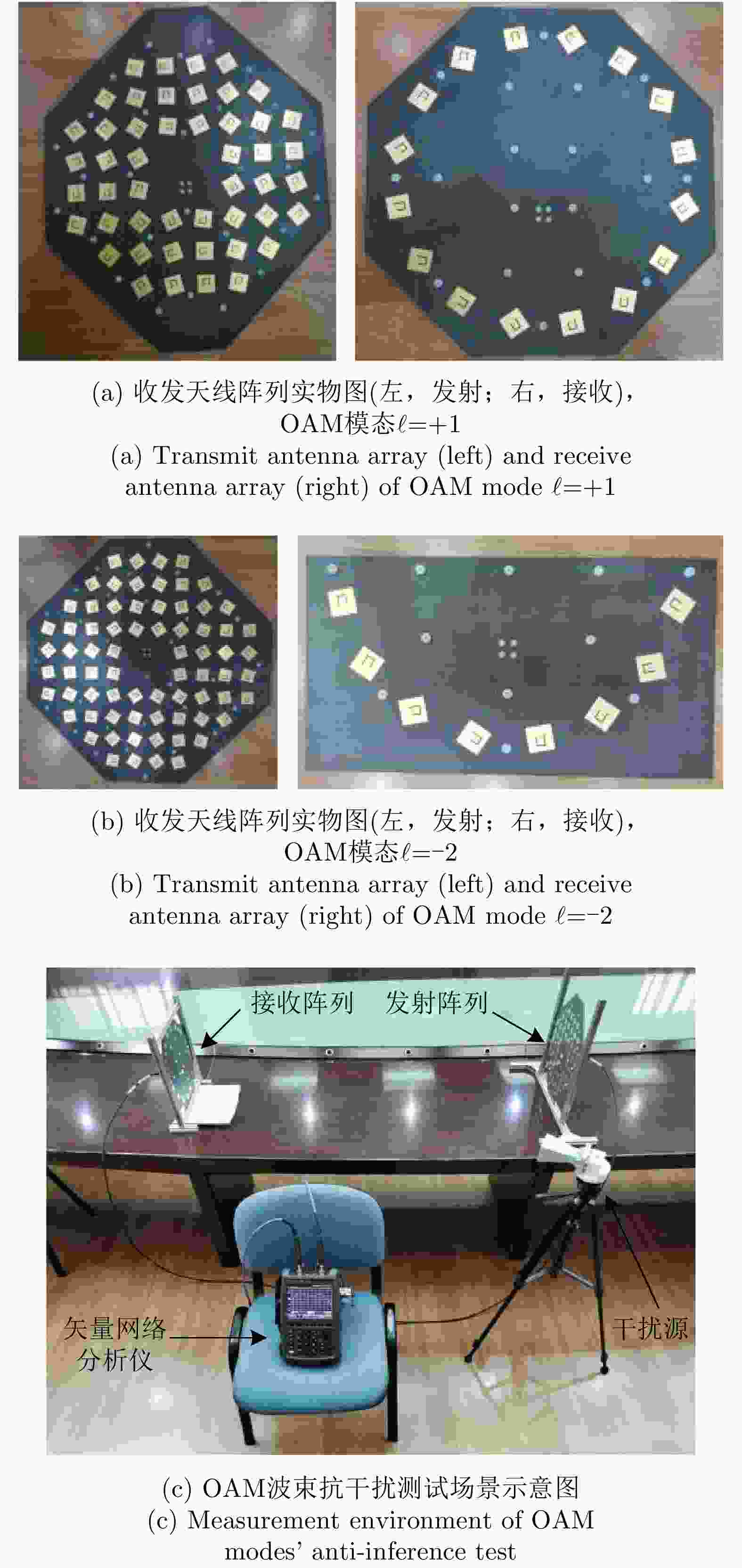 $\ell = + 1$ 和$\ell = - 2$ 的涡旋电磁波束,并建立起涡旋电磁波的射频收发链路。通过引入一个喇叭天线作为干扰源,以相应涡旋电磁波束的OAM模态谱分布以及OAM模态正交性作为主要的分析依据,在不同干扰场景下抗干扰性对涡旋电磁波的收发射频链路的OAM模态性能进行仿真和分析。该文对设计的天线模型进行加工和测试,对涡旋电磁波射频收发链路中OAM模态抗干扰性能的分析,可以为涡旋电磁波在无线通信及雷达探测与成像等有关研究领域提供一些前瞻性的探索和设计上的指导。Abstract: The electromagnetic vortex wave has demonstrated excellent research value with potential applications in the fields of wireless communication and radar detection and imaging due to its unusual electromagnetic field distribution and theoretically infinite orthogonal Orbital Angular Momentum (OAM) modes. This study analyzes the anti-interference performance of OAM modes in the electromagnetic vortex Radio Frequency (RF) transceiver link primarily from the perspective of the electromagnetic vortex field distributions in space and the OAM modes orthogonality. Planar antenna arrays are designed to generate the electromagnetic vortex beams with respective OAM modes of and in the C band, and the corresponding RF transceiver links are established. The OAM modes’ anti-interference properties under different interference situations are analyzed in the electromagnetic vortex RF transceiver link by using a horn antenna as the interference source. Meanwhile, the corresponding OAM mode spectrum and the OAM modes’ orthogonality are employed as the primary methods in our analysis. Finally, the designed antenna models are fabricated, and the electromagnetic vortex RF transceiver links are measured. The corresponding analyses and conclusions are presented in this study. The OAM modes’ anti-interference performance analysis in the vortex electromagnetic wave’s RF transceiver link can provide a reference for exploring and designing a vortex electromagnetic wave in wireless communication and radar detection and imaging research. -