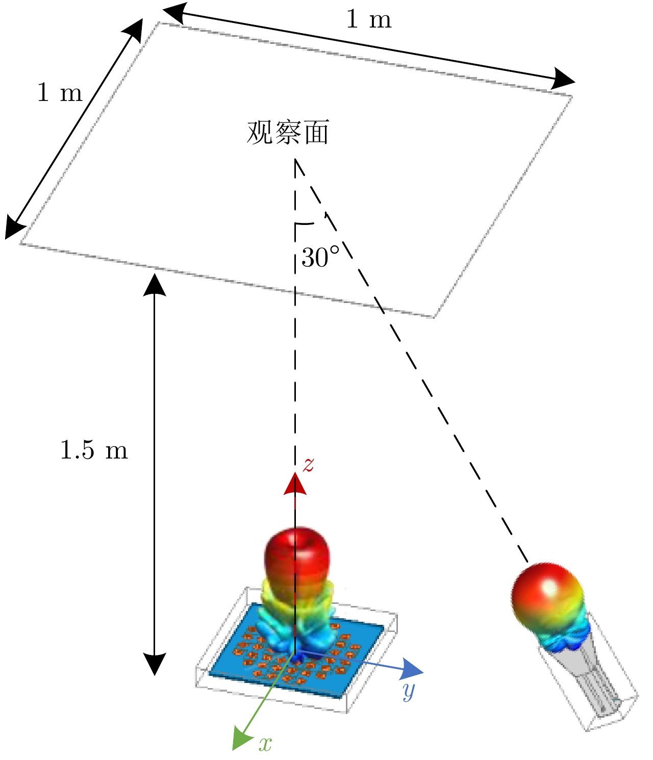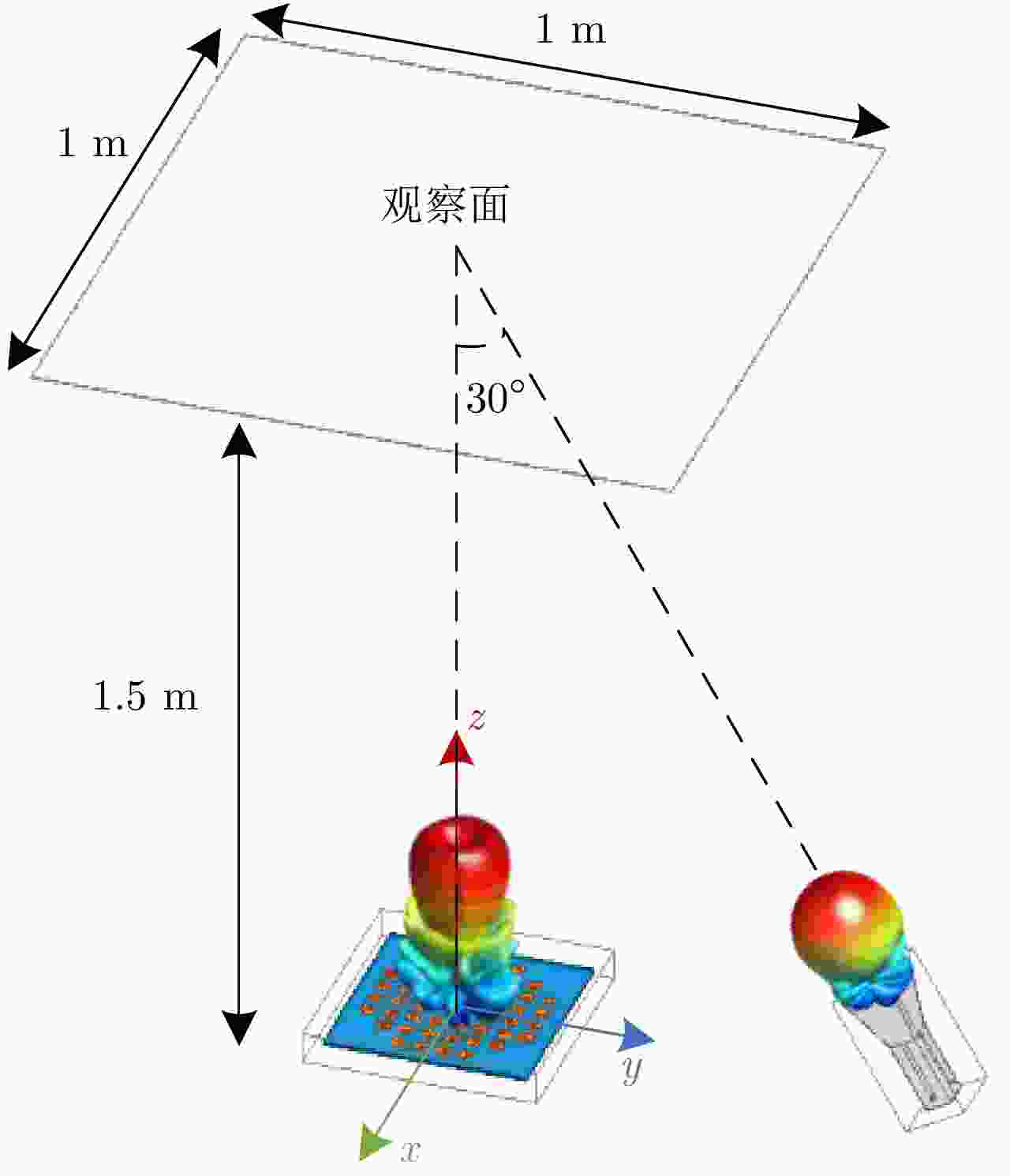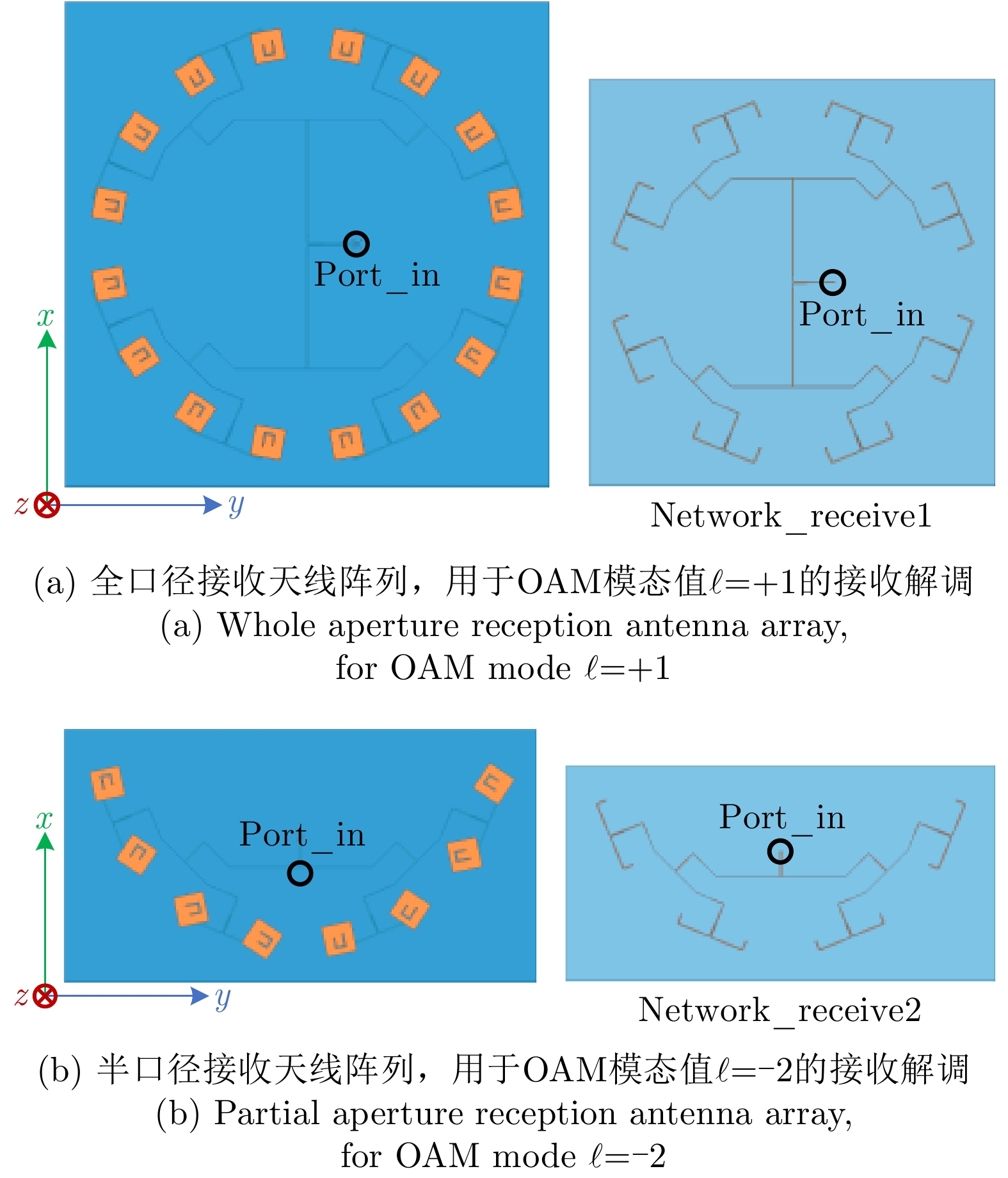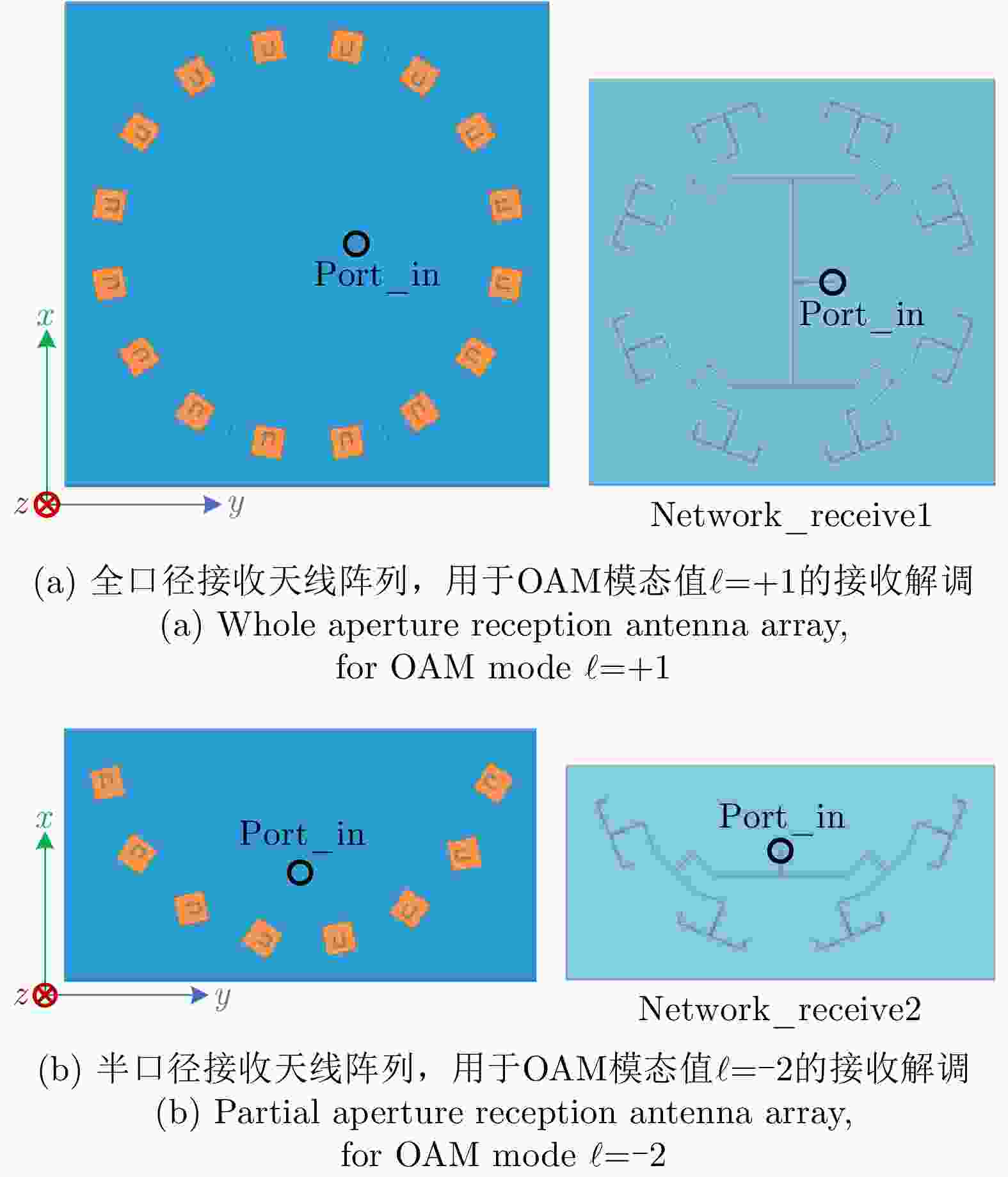 $\ell = + 1$ 和$\ell = - 2$ 的涡旋电磁波束,并建立起涡旋电磁波的射频收发链路。通过引入一个喇叭天线作为干扰源,以相应涡旋电磁波束的OAM模态谱分布以及OAM模态正交性作为主要的分析依据,在不同干扰场景下抗干扰性对涡旋电磁波的收发射频链路的OAM模态性能进行仿真和分析。该文对设计的天线模型进行加工和测试,对涡旋电磁波射频收发链路中OAM模态抗干扰性能的分析,可以为涡旋电磁波在无线通信及雷达探测与成像等有关研究领域提供一些前瞻性的探索和设计上的指导。Abstract: The electromagnetic vortex wave has demonstrated excellent research value with potential applications in the fields of wireless communication and radar detection and imaging due to its unusual electromagnetic field distribution and theoretically infinite orthogonal Orbital Angular Momentum (OAM) modes. This study analyzes the anti-interference performance of OAM modes in the electromagnetic vortex Radio Frequency (RF) transceiver link primarily from the perspective of the electromagnetic vortex field distributions in space and the OAM modes orthogonality. Planar antenna arrays are designed to generate the electromagnetic vortex beams with respective OAM modes of and in the C band, and the corresponding RF transceiver links are established. The OAM modes’ anti-interference properties under different interference situations are analyzed in the electromagnetic vortex RF transceiver link by using a horn antenna as the interference source. Meanwhile, the corresponding OAM mode spectrum and the OAM modes’ orthogonality are employed as the primary methods in our analysis. Finally, the designed antenna models are fabricated, and the electromagnetic vortex RF transceiver links are measured. The corresponding analyses and conclusions are presented in this study. The OAM modes’ anti-interference performance analysis in the vortex electromagnetic wave’s RF transceiver link can provide a reference for exploring and designing a vortex electromagnetic wave in wireless communication and radar detection and imaging research. -
