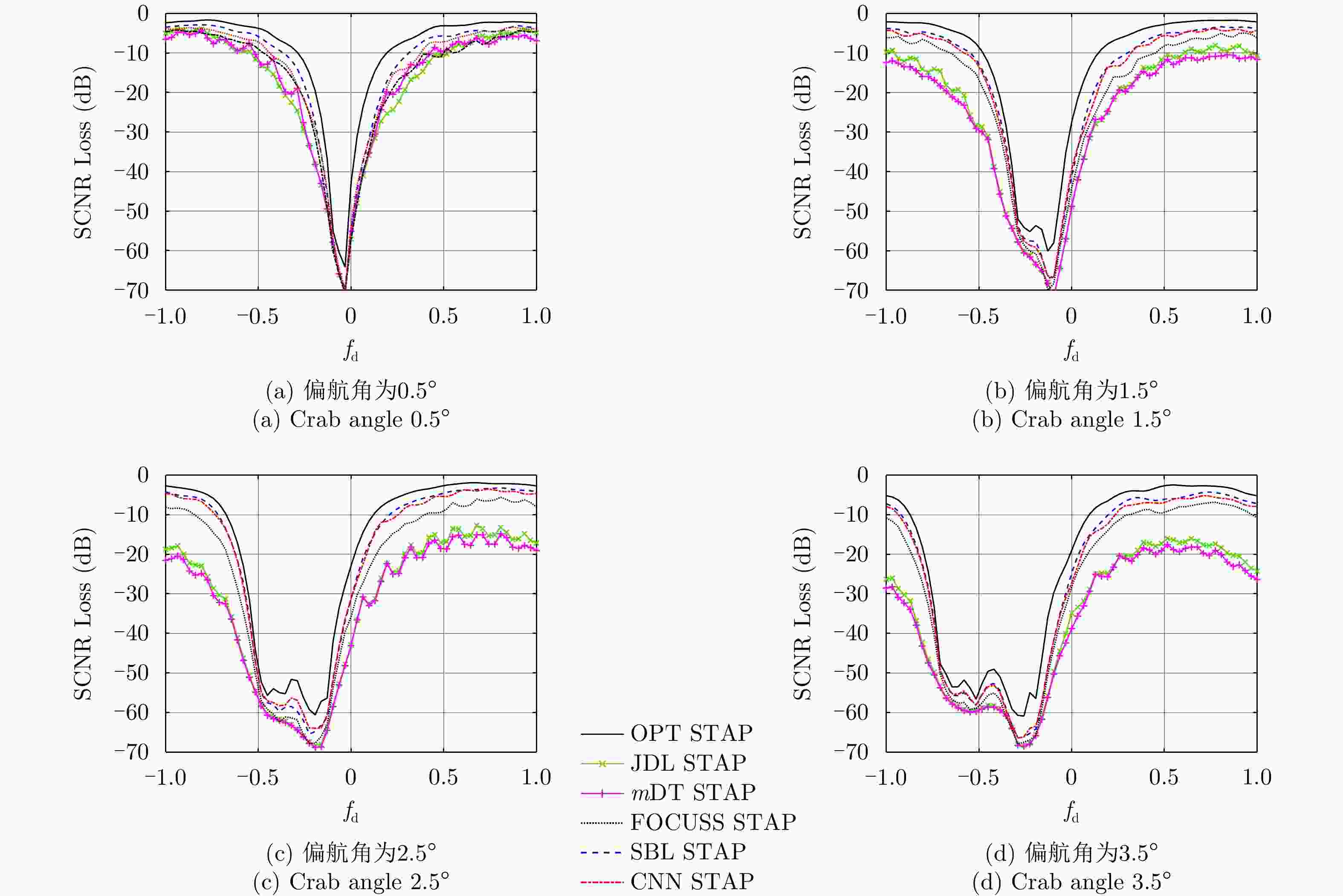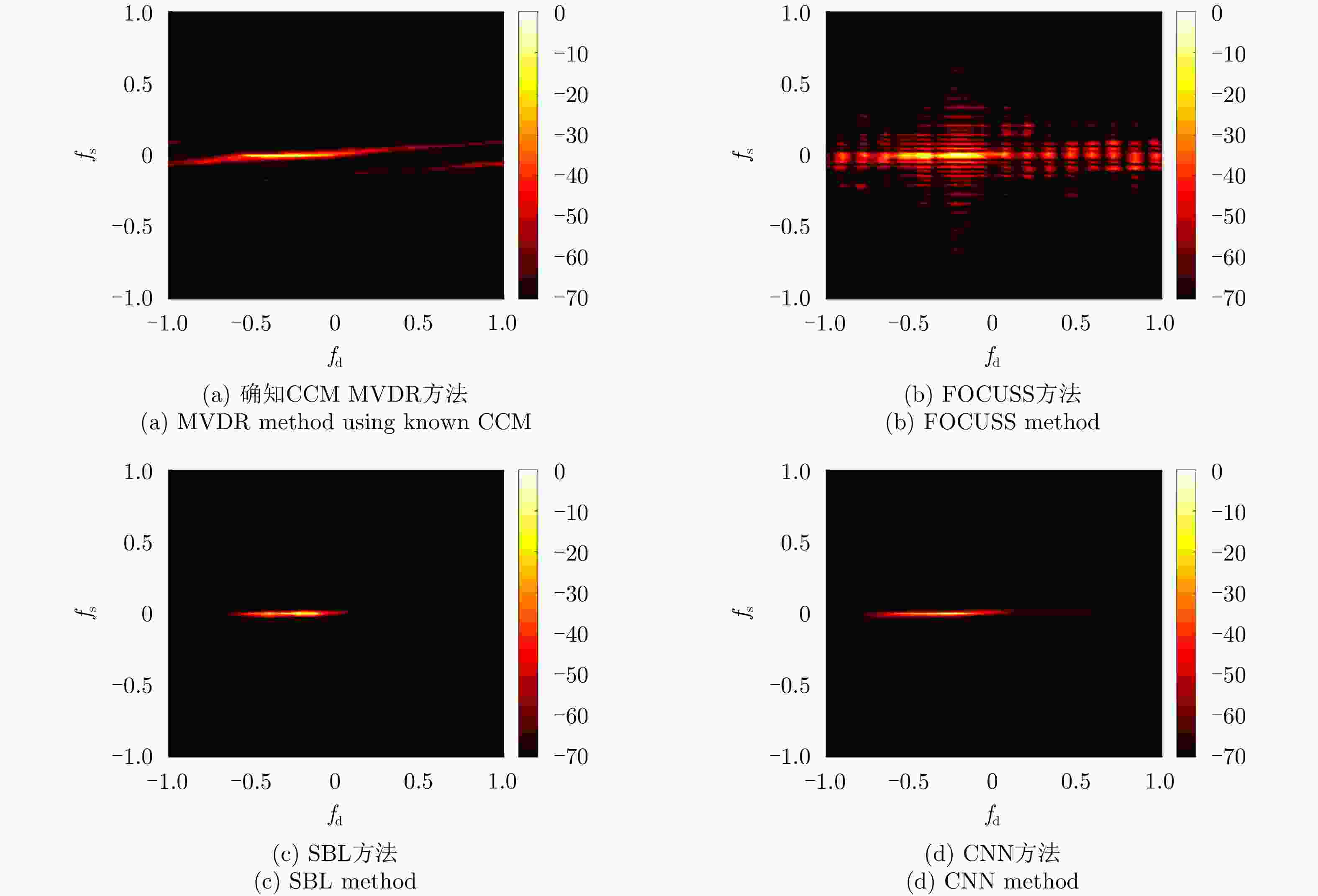 方法 运算复杂度 FOCUSS STAP $\begin{aligned} & {O}\left(\left(NM{N}_{\mathrm{s} }{N}_{\mathrm{d} }+{\left(NM\right)}^{3}+2{\left(NM\right)}^{2}{N}_{\mathrm{s} }{N}_{\mathrm{d} }\right.\right.\\& \left.\left.+NM{\left({N}_{\mathrm{s} }{N}_{\mathrm{d} }\right)}^{2}\right){k}_{\mathrm{F}\mathrm{O}\mathrm{C} }\right)\end{aligned}$ SBL STAP $\begin{aligned} & {O}\left(\left(NM{N}_{\mathrm{s} }{N}_{\mathrm{d} }+{\left(NM\right)}^{3}+3{\left(NM\right)}^{3}{N}_{\mathrm{s} }{N}_{\mathrm{d} }\right.\right.\\& \left.\left.+2NM{\left({N}_{\mathrm{s} }{N}_{\mathrm{d} }\right)}^{2}\right){k}_{\mathrm{S}\mathrm{B}\mathrm{L} }\right)\end{aligned}$ CNN STAP ${O}\left(28777{N}_{\mathrm{s} }{N}_{\mathrm{d} }\right)$ 表 4 运行时间比较
