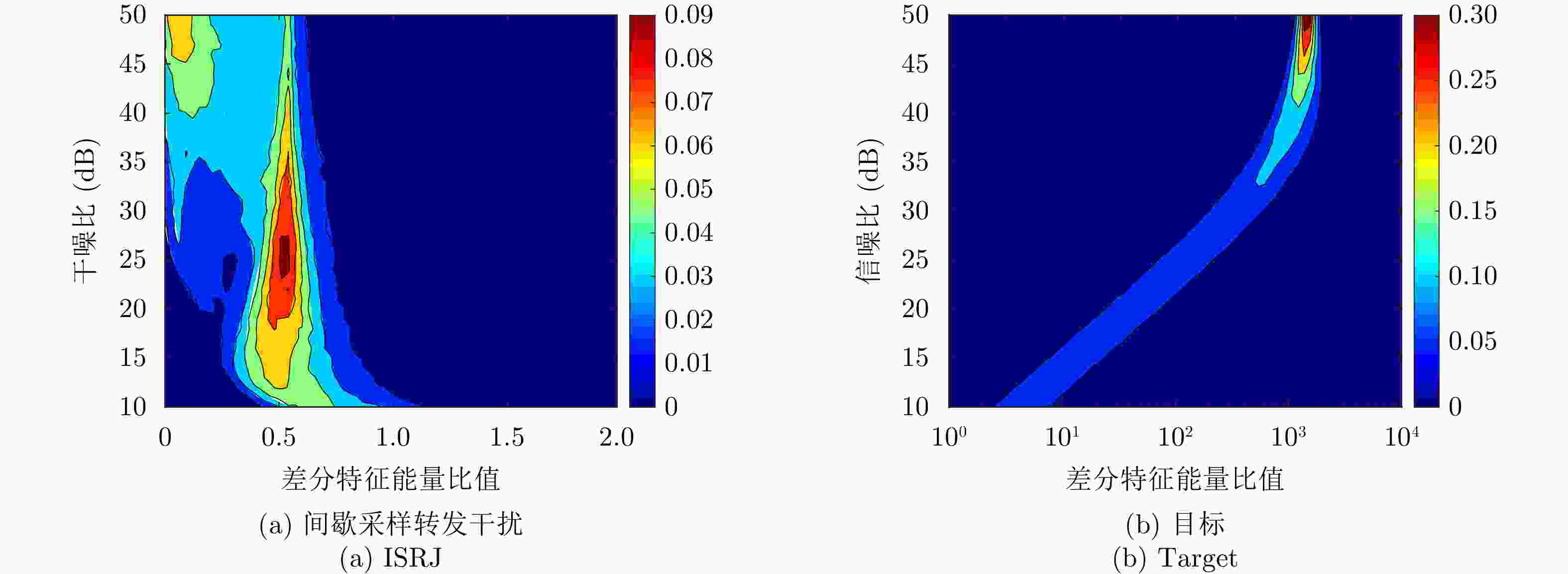 信源 波形参数 脉压后信(干)噪比 目标 脉宽100 μs,带宽5 MHz 10~50 dB,间隔1 dB 干扰1 切片宽度16.67 μs,切片1次重复转发5次 10~50 dB,间隔1 dB 干扰2 切片宽度10 μs,切片1次立即重复转发2次,共切片3次 10~50 dB,间隔1 dB 表 3 仿真参数