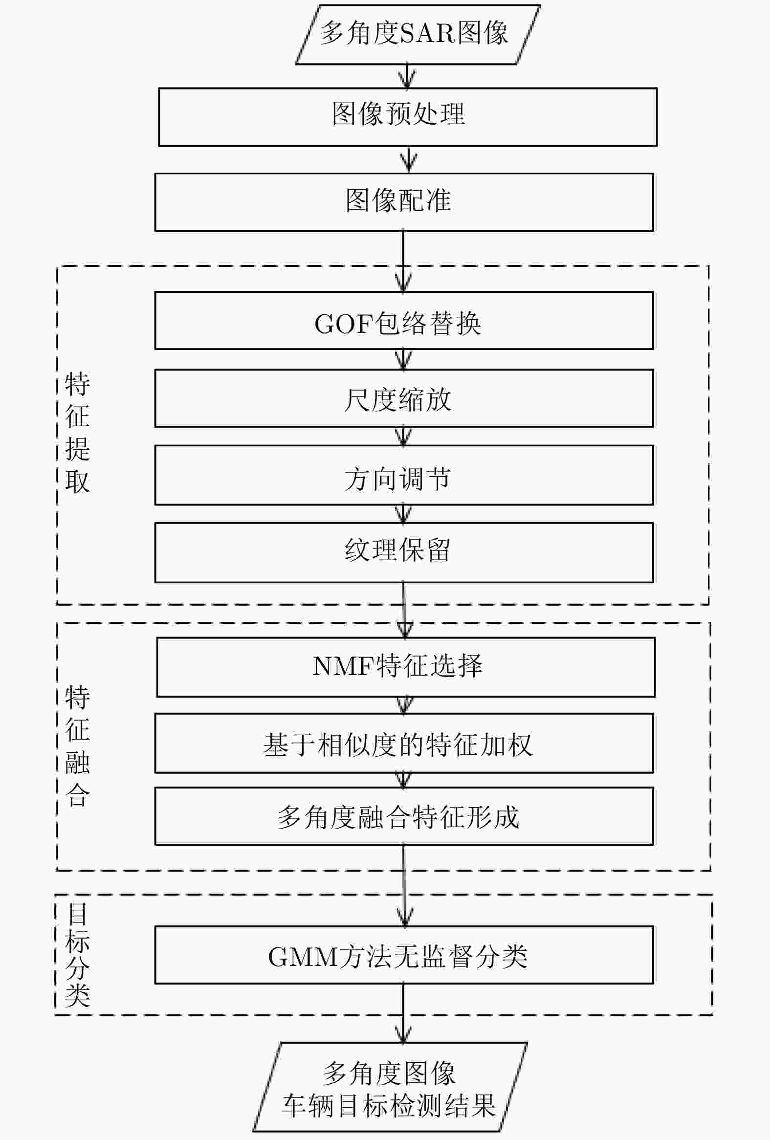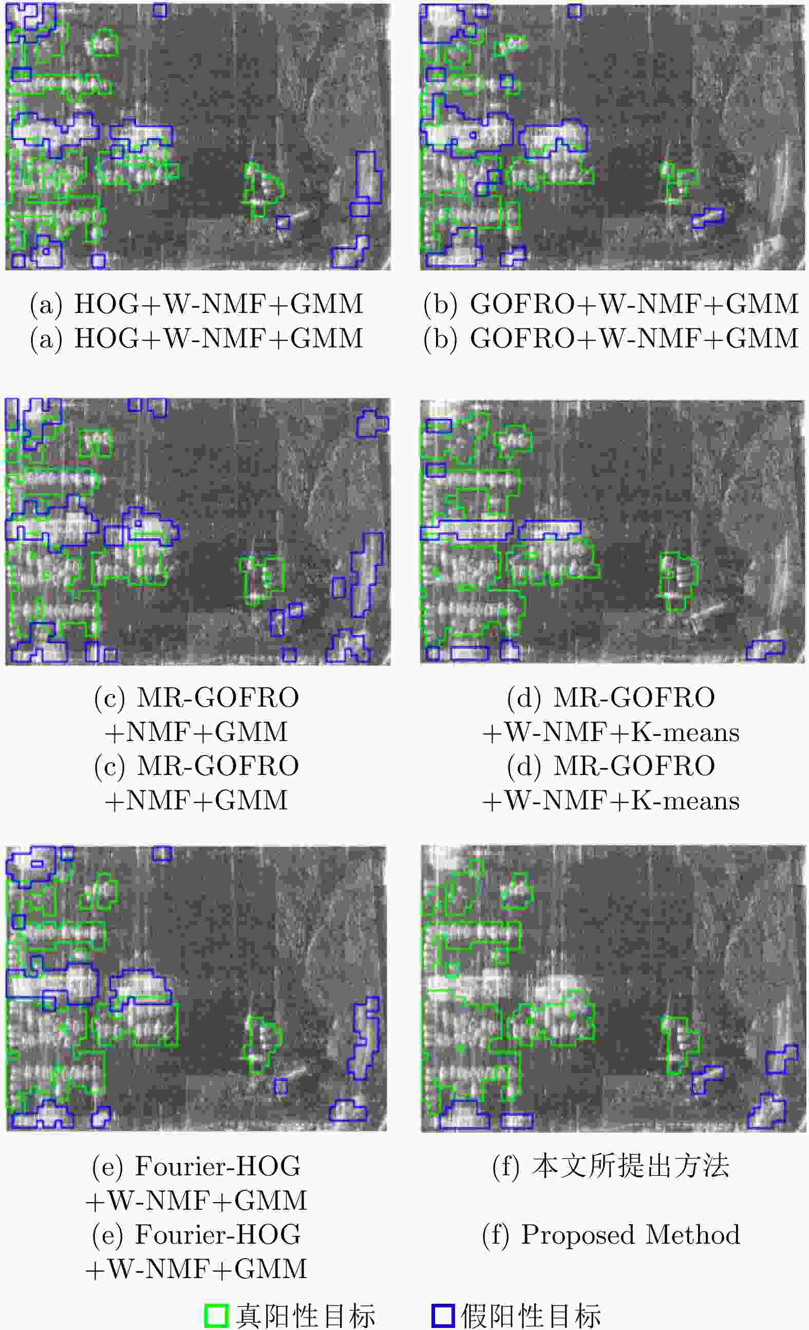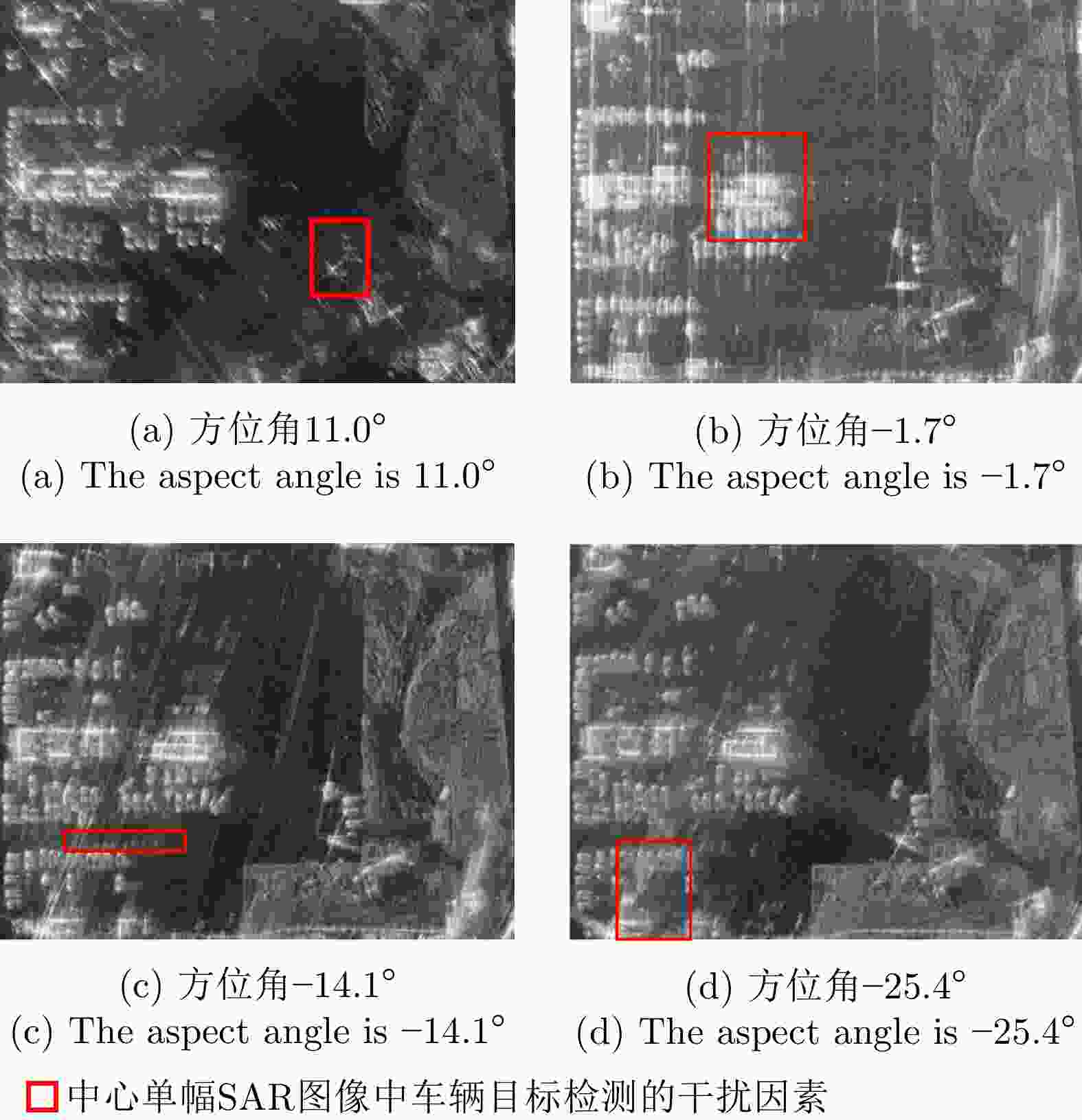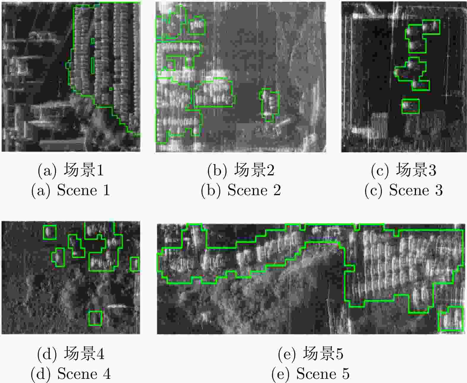 摘要: 针对城市场景中车辆目标分布状态随机,在检测过程中容易受到环境因素干扰等问题,提出一种将多角度合成孔径雷达(SAR)图像用于静止车辆目标提取的检测算法。在特征提取阶段,设计了一种适用于多角度图像上车辆目标的多尺度旋转不变的Gabor滤波器奇分量比例算子(MR-GOFRO)特征提取方法,对原有的GOFRO特征进行了滤波形式、特征尺度、特征方向、特征层次等4个方面的扩展,使其能够适应车辆目标在方向、尺度、形态等方面可能发生的变化。在图像融合阶段,设计了加权的非负矩阵分解(W-NMF)方法,根据特征质量调整来源于不同图像的特征权重,减少由于不同角度间相互干扰造成融合特征质量下降的现象。将该文所提出方法在不同的机载多角度图像数据集上进行验证,实验结果表明,该文提出的特征提取方法与同类方法相比,检测精度平均提升了3.69%;该文提出的特征融合方法与同类方法相比,检测精度提升了4.67%。Abstract: Vehicle targets in urban scenes have the characteristics of random distribution and can be easily disturbed by environmental factors during the detection process. Given the above issues, this paper proposes a detection method that utilizes multi-aspect Synthetic Aperture Radar (SAR) images for stationary vehicle target extraction. In the feature extraction stage, a novel feature extraction method called Multiscale Rotational Gabor Odd Filter-based Ratio Operator (MR-GOFRO) is designed for vehicle targets in multi-aspect SAR images, where the original GOFRO features are improved from four aspects—filter form, feature scale, feature direction and feature level. The improvement allows MR-GOFRO to adapt to possible variations in the target direction, scale, morphology, etc. In the image fusion stage, a Weighted-Non-negative Matrix Factorization (W-NMF) method is developed to adjust the feature weights from various images according to the feature quality. This method can reduce the quality degradation of the fusion features due to mutual interference between different aspects. The proposed method is verified on various airborne multi-aspect image datasets. The experimental results revealed that the feature extraction and feature fusion methods proposed in this paper enhance the detection accuracy by an average of 3.69% and 4.67%, respectively, compared with similar methods.