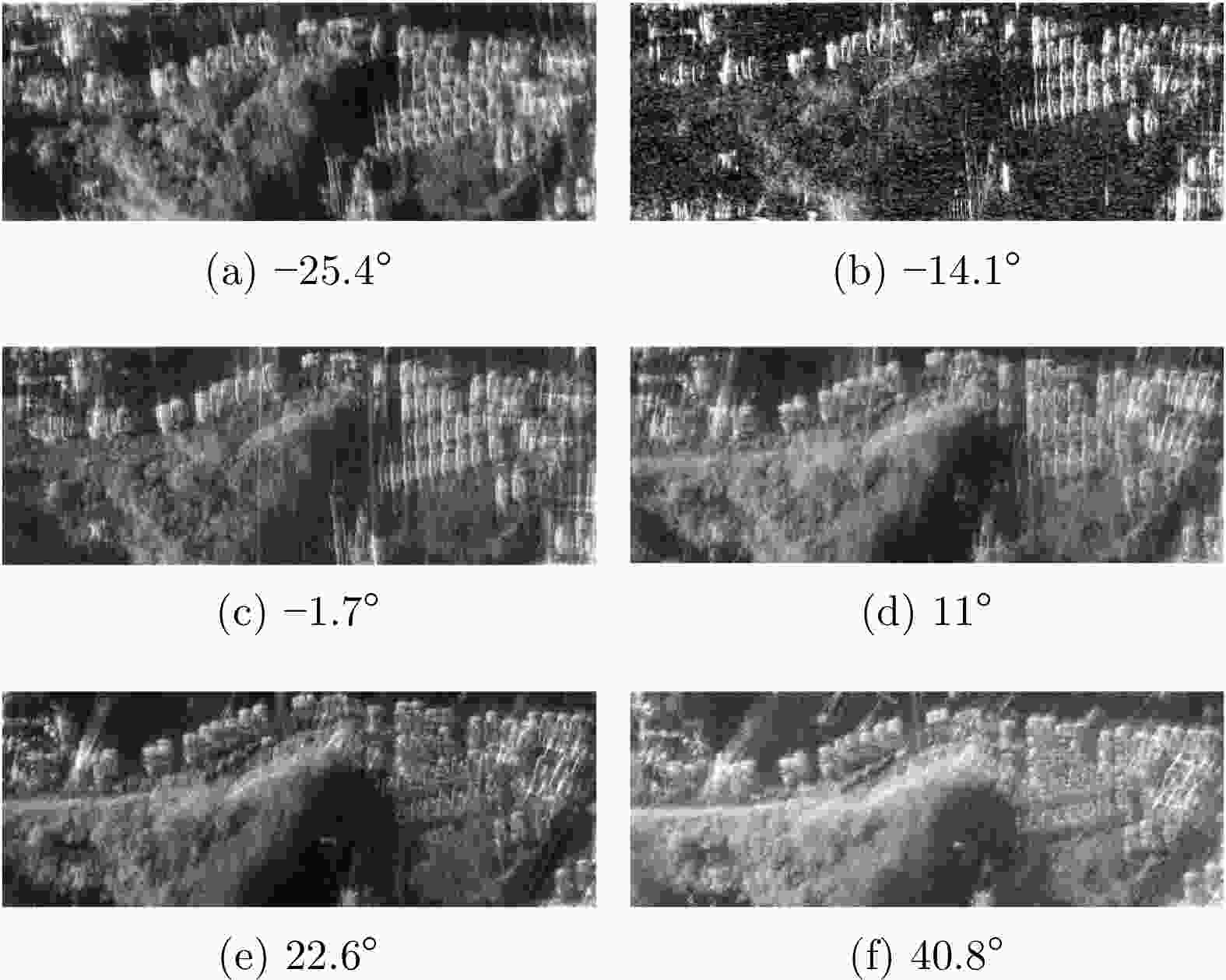 实验参数 参数值 中心频率 9.6 GHz 带宽 3600 MHz 脉宽 15 μs 采样频率 4400 MHz 脉冲重复频率 3000 Hz 中心角度 65.5° 平台速度 83.04 m/s 平台高度 3605.44 m 场景中心纬度 21.88° 场景中心经度 111.97° 图像分辨率 1 m 表 2 阳江飞行实验多角度图像方位角度参数