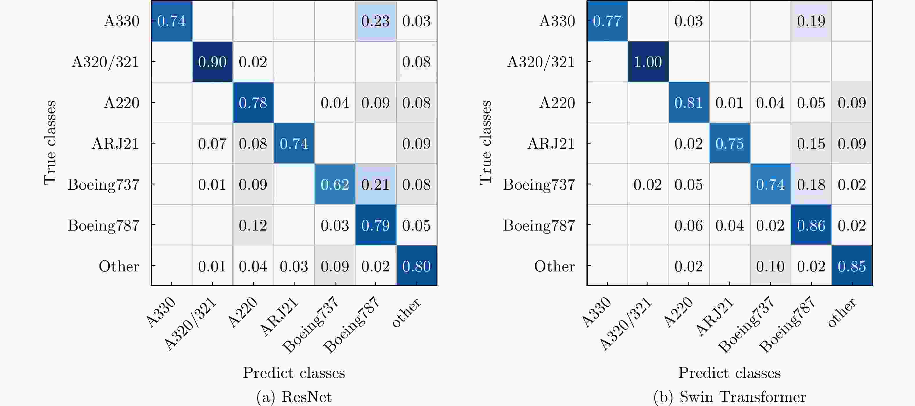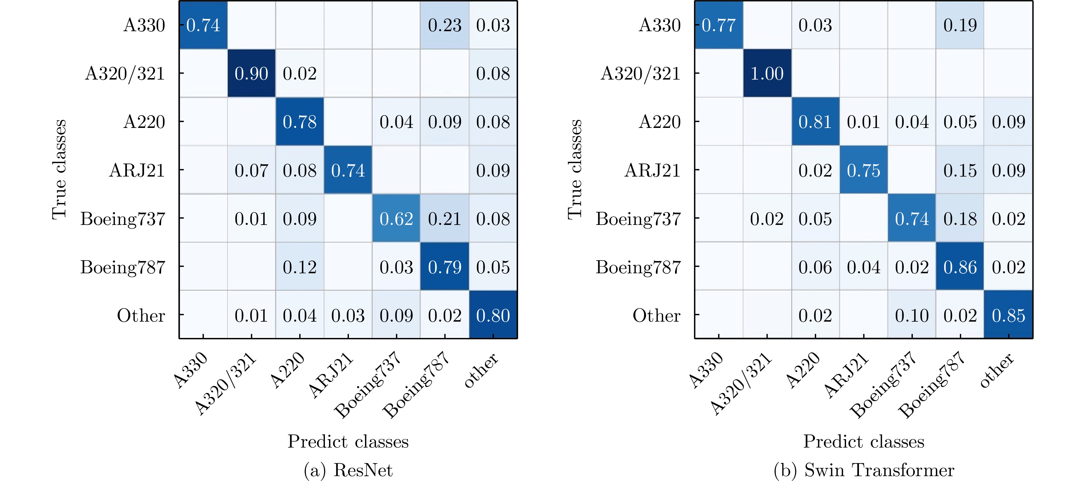 Methods Acc (top-1/top-3) A330 A320/321 A220 ARJ21 Boeing737 Boeing787 Other ResNet-50 75.59/89.19 74.19 90.38 78.04 73.76 61.64 78.63 80.50 ResNet-101 78.58/90.37 93.55 98.08 76.96 73.76 71.82 74.67 84.82 ResNeXt-50 80.61/89.46 83.87 94.23 78.91 74.86 73.27 83.04 85.40 ResNeXt-101 82.20/91.83 87.10 100 80.87 79.83 71.09 83.92 87.70 Swin Trarsformer 81.29/ 92.51 77.42 100 80.87 74.59 73.82 86.12 84.82 表 5 The performance of the algorithms based on deep learning (IoU=0.5)