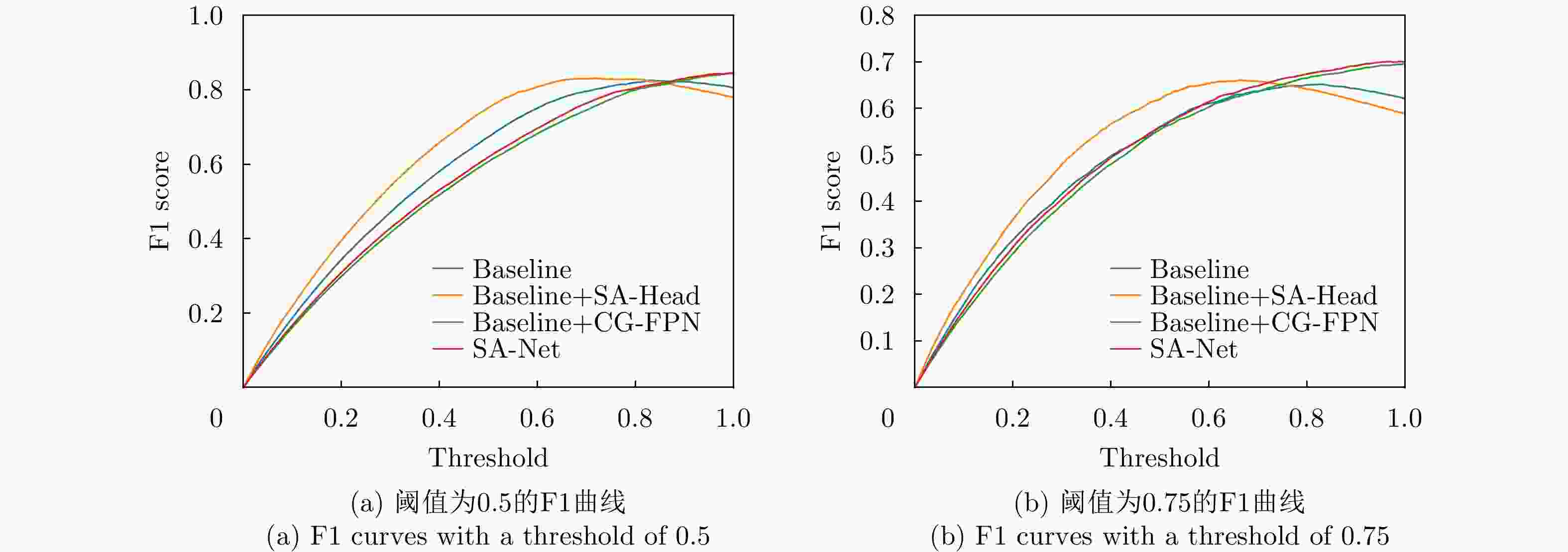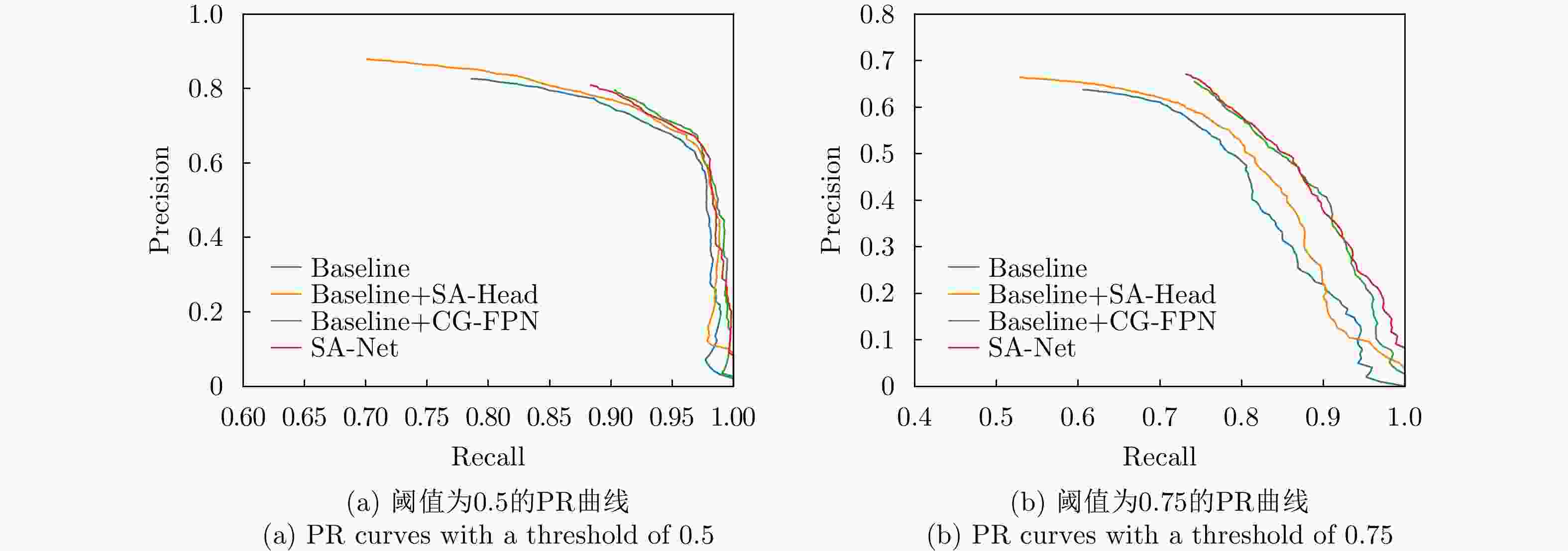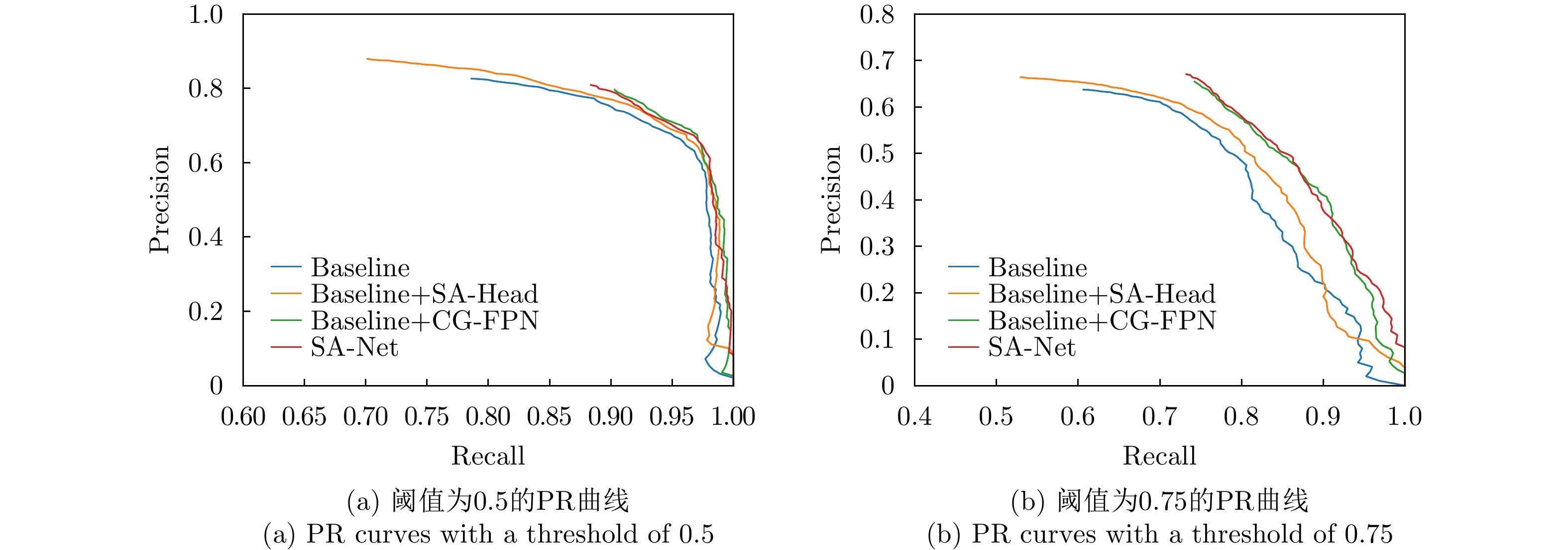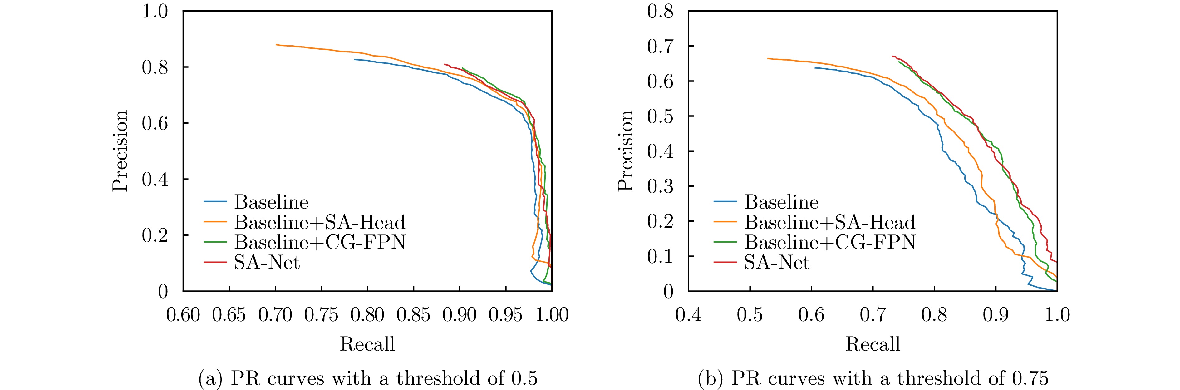 Methods P R F1 AP 0.5 AP 0.75 Baseline 88.1 81.2 84.5 79.6 60.7 Baseline+SA-Head 88.2 82.1 85.0 80.3 60.8 Baseline+CG-FPN 88.6 81.9 85.1 80.4 60.4 SA-Net 87.5 82.2 84.8 80.4 61.4 -