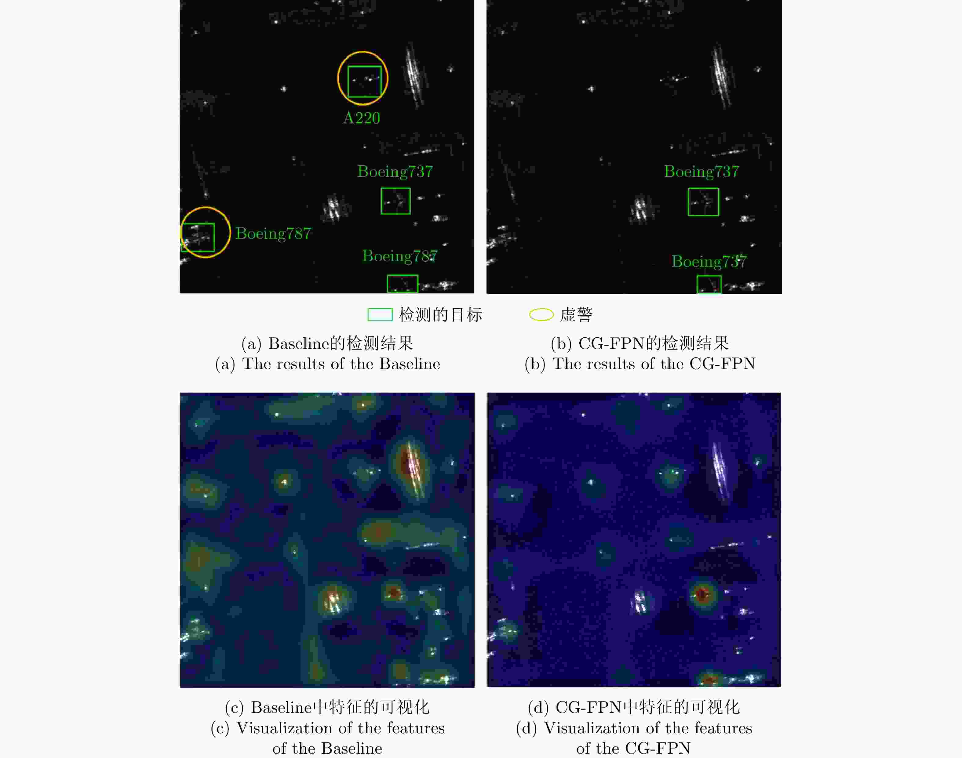 方法 P R F1 AP0.5 AP0.75 Baseline 88.1 81.2 84.5 79.6 60.7 Baseline+SA-Head 88.2 82.1 85.0 80.3 60.8 Baseline+CG-FPN 88.6 81.9 85.1 80.4 60.4 SA-Net 87.5 82.2 84.8 80.4 61.4 表 1 Comparison between the SAR-AIRcraft-1.0 dataset and other SAR object detection datasets