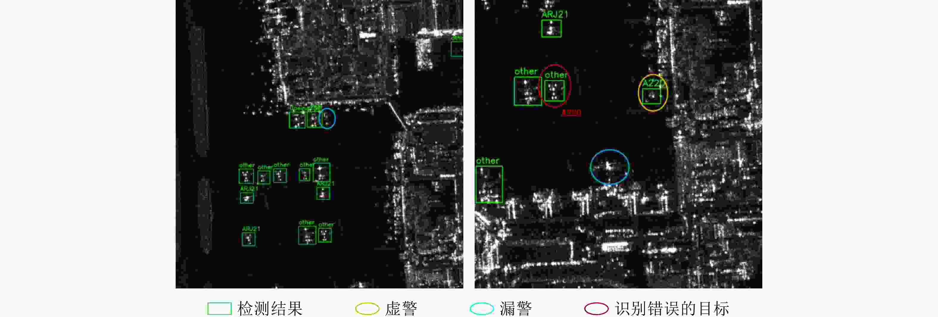 名称 类别 实例数量 图片数量 大小 发布年份 任务 MSTAR 10 5,950 5,950 128×128 1998 车辆识别 OpenSARShip 17 11,346 11,346 256×256 2017 舰船检测识别 SSDD 1 2,456 1,160 190~668 2017 舰船检测 SAR-Ship-Dataset 1 59,535 43,819 256×256 2019 舰船检测 AIR-SARShip-1.0 1 461 31 3000 ×3000 2019 舰船检测 HRSID 1 16,951 5,604 800×800 2020 舰船检测和实例分割 FUSAR-Ship 15 16,144 16,144 512×512 2020 舰船检测识别 SADD 1 7,835 2,966 224×224 2022 飞机检测 MSAR-1.0 4 60,396 28,449 256~2048 2022 飞机、油罐、桥梁、舰船检测 SAR-AIRcraft-1.0 7 16,463 4,368 800~ 1500 2023 飞机检测识别 表 2 不同方法的检测结果(%)