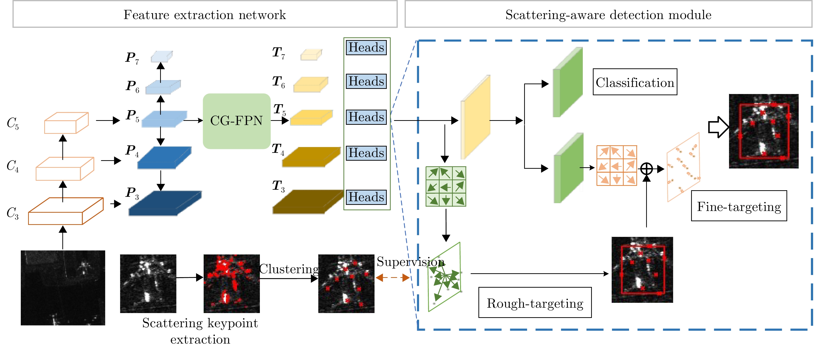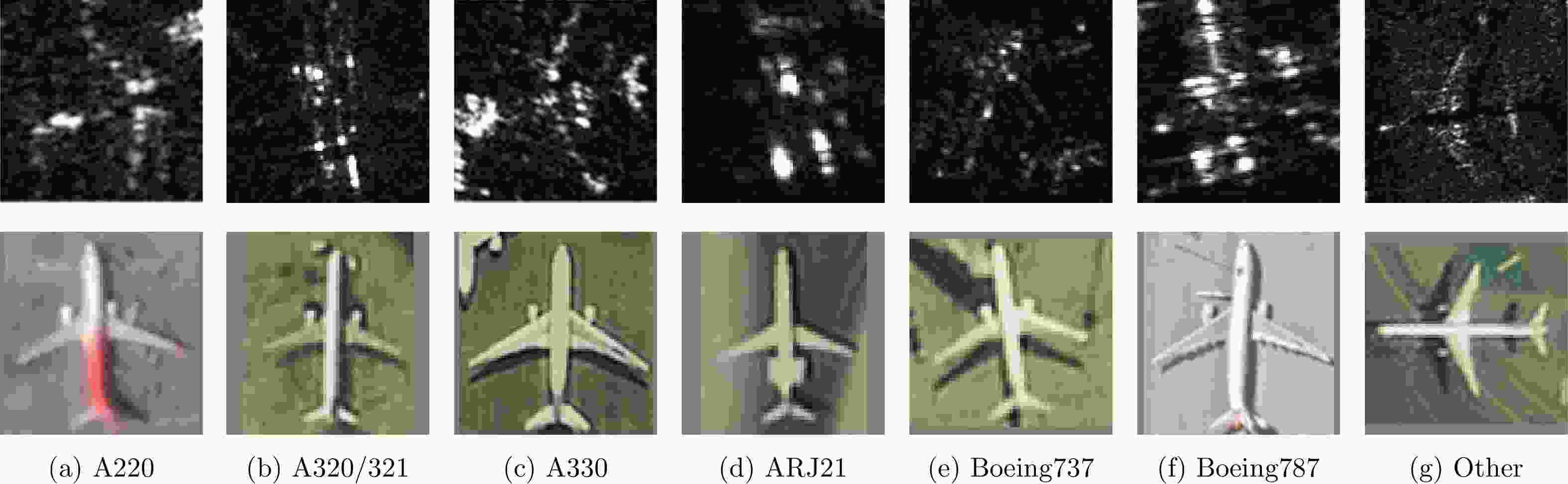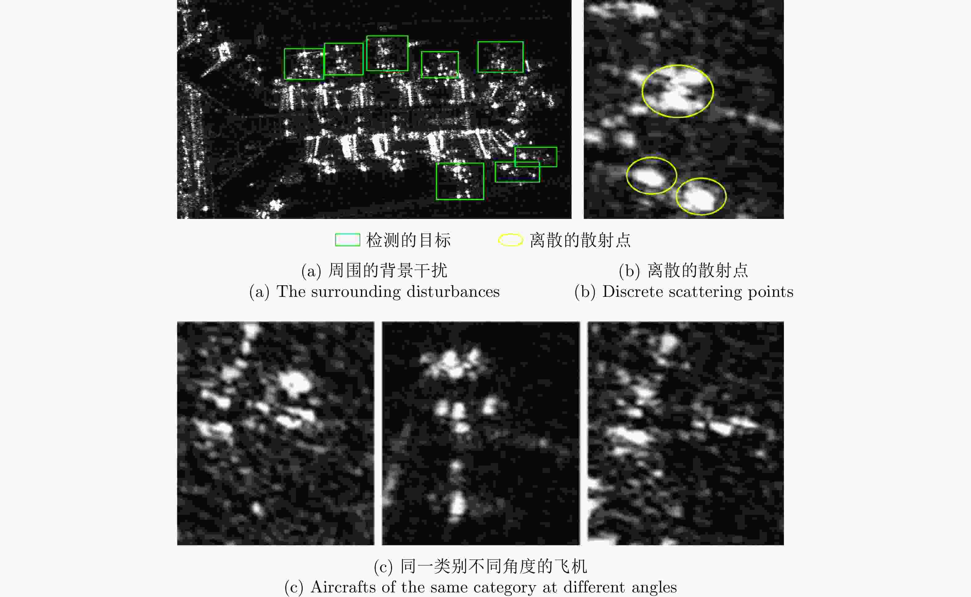 摘要: 针对合成孔径雷达(SAR)图像中飞机散射点离散以及背景强干扰造成虚警的问题,该文提出了一种结合散射感知的SAR飞机检测识别方法。一方面,通过上下文引导的特征金字塔模块来增强全局信息,减弱复杂场景中强干扰的影响,提高检测识别的准确率。另一方面,利用散射关键点对目标进行定位,设计散射感知检测模块实现对回归框的细化校正,增强目标的定位精度。为了验证方法有效性、同时促进SAR飞机检测识别领域的研究发展,该文制作并公开了一个高分辨率SAR-AIRcraft-1.0数据集。该数据集图像来自高分三号卫星,包含4,368张图片和16,463个飞机目标实例,涵盖A220, A320/321, A330, ARJ21, Boeing737, Boeing787和other共7个类别。该文将提出的方法和常见深度学习算法在构建的数据集上进行实验,实验结果证明了散射感知方法的优异性能,并且形成了该数据集在SAR飞机检测、细粒度识别、检测识别一体化等不同任务中性能指标的基准。Abstract: This study proposes a Synthetic Aperture Radar (SAR) aircraft detection and recognition method combined with scattering perception to address the problem of target discreteness and false alarms caused by strong background interference in SAR images. The global information is enhanced through a context-guided feature pyramid module, which suppresses strong disturbances in complex images and improves the accuracy of detection and recognition. Additionally, scatter key points are used to locate targets, and a scatter-aware detection module is designed to realize the fine correction of the regression boxes to improve target localization accuracy. This study generates and presents a high-resolution SAR-AIRcraft-1.0 dataset to verify the effectiveness of the proposed method and promote the research on SAR aircraft detection and recognition. The images in this dataset are obtained from the satellite Gaofen-3, which contains 4,368 images and 16,463 aircraft instances, covering seven aircraft categories, namely A220, A320/321, A330, ARJ21, Boeing737, Boeing787, and other. We apply the proposed method and common deep learning algorithms to the constructed dataset. The experimental results demonstrate the excellent effectiveness of our method combined with scattering perception. Furthermore, we establish benchmarks for the performance indicators of the dataset in different tasks such as SAR aircraft detection, recognition, and integrated detection and recognition.
