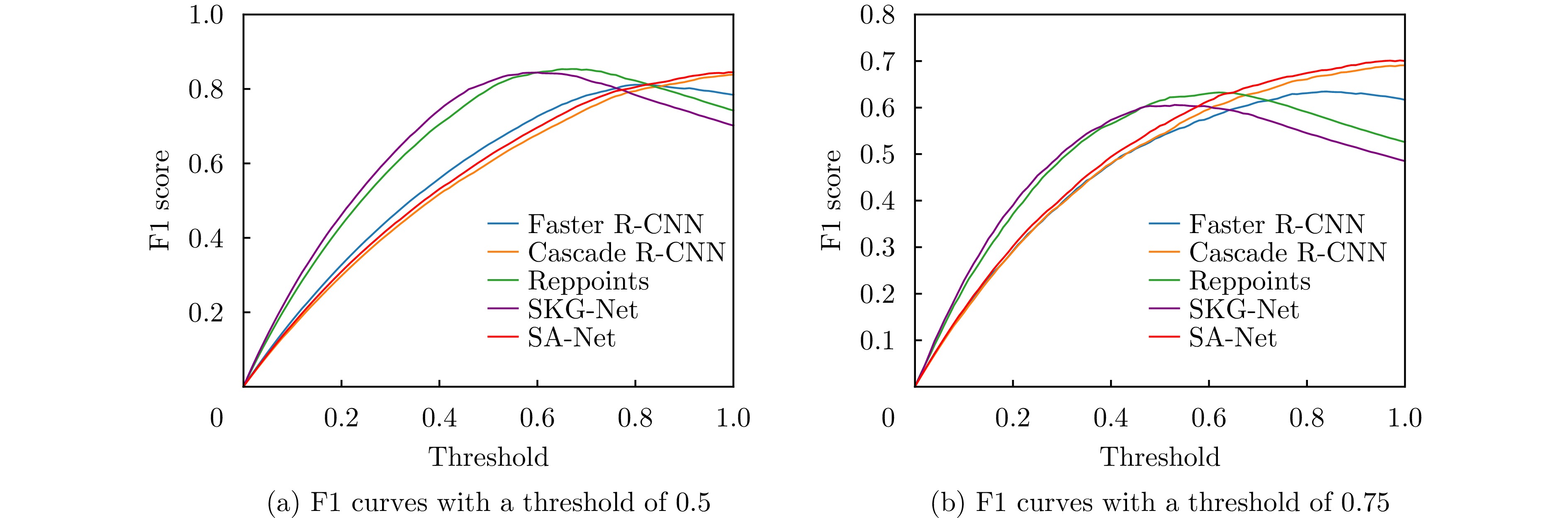 Detection methods P R F1 AP 0.5 AP 0.75 Faster R-CNN 77.6 78.1 77.8 71.6 53.6 Cascade R-CNN 89.0 79.5 84.0 77.8 59.1 RepPoints 62.7 88.7 81.2 80.3 52.9 SKG-Net 57.6 88.8 69.9 79.8 51.0 SA-Net 87.5 82.2 84.8 80.4 61.4 表 3 The number of instance targets of different categories