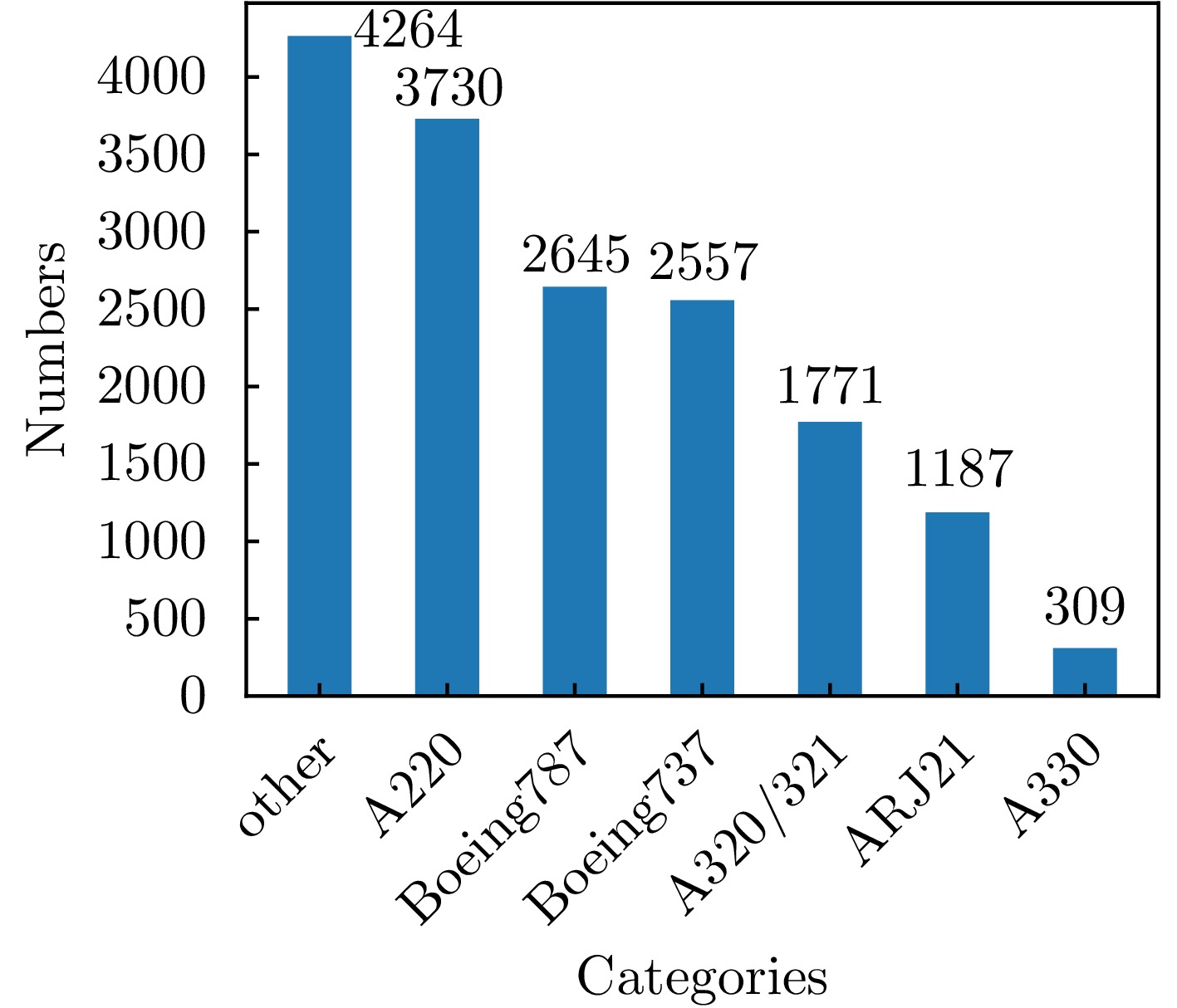 Category Training set number Test set number Total A330 278 31 309 A320/321 1719 52 1771 A220 3270 460 3730 ARJ21 825 362 1187 Boeing737 2007 550 2557 Boeing787 2191 454 2645 other 3223 1041 4264 Total 13513 2950 16463 表 4 Fine-grained recognition results (%)