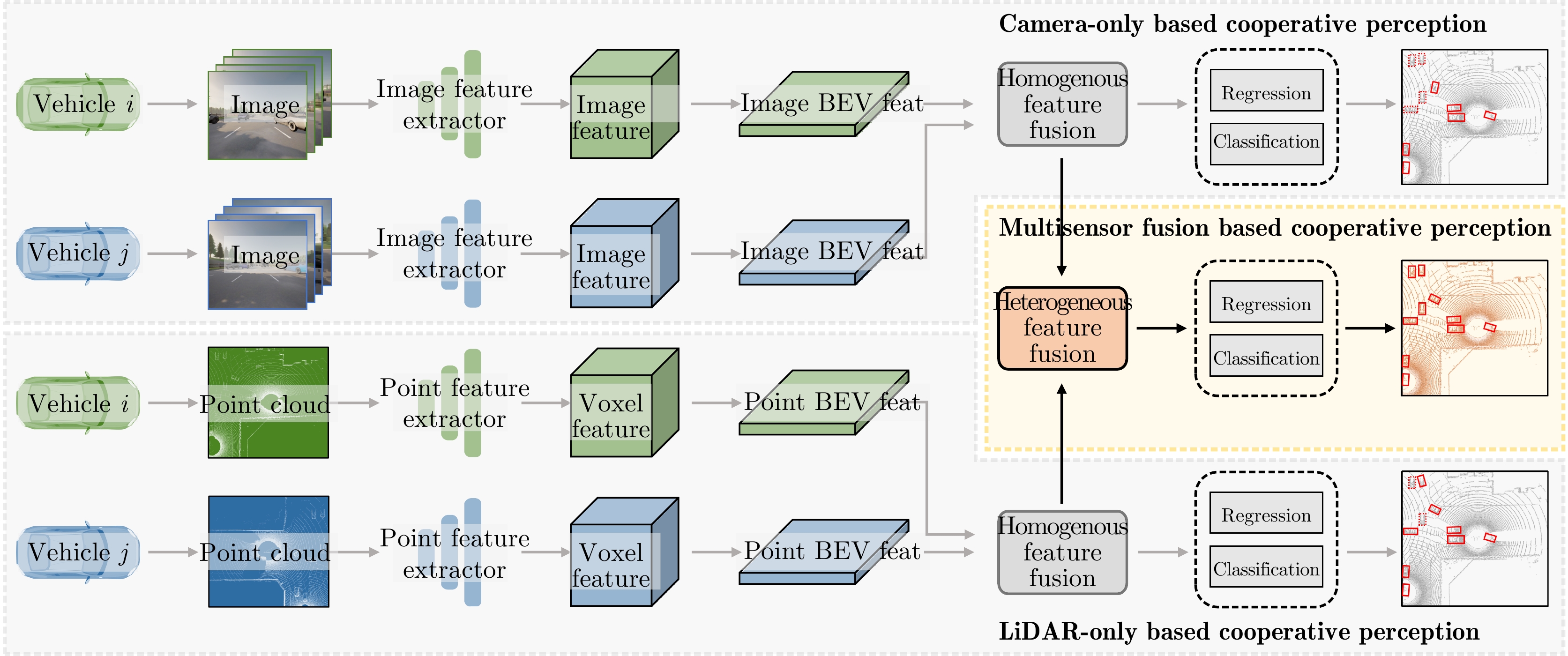 [1] LIU Si, GAO Chen, CHEN Yuan, et al. Towards vehicle-to-everything autonomous driving: A survey on collaborative perception[EB/OL]. https://arxiv:abs/2308.16714, 2023. [2] HAN Yushan, ZHANG Hui, LI Huifang, et al. Collaborative perception in autonomous driving: Methods, datasets, and challenges[J]. IEEE Intelligent Transportation Systems Magazine, 2023, 15(6): 131–151. doi: 10.1109/MITS.2023.3298534. [3] REN Shunli, CHEN Siheng, and ZHANG Wenjun. Collaborative perception for autonomous driving: Current status and future trend[C]. 2021 5th Chinese Conference on Swarm Intelligence and Cooperative Control, Singapore, Singapore, 2023: 682–692. doi: 10.1007/978-981-19-3998-3_65. [4] 上官伟, 李鑫, 柴琳果, 等. 车路协同环境下混合交通群体智能仿真与测试研究综述[J]. 交通运输工程学报, 2022, 22(3): 19–40. doi: 10.19818/j.cnki.1671-1637.2022.03.002.SHANGGUAN Wei, LI Xin, CHAI Linguo, et al. Research review on simulation and test of mixed traffic swarm in vehicle-infrastructure cooperative environment[J]. Journal of Traffic and Transportation Engineering, 2022, 22(3): 19–40. doi: 10.19818/j.cnki.1671-1637.2022.03.002. [5] CHEN Qi, TANG Sihai, YANG Qing, et al. Cooper: Cooperative perception for connected autonomous vehicles based on 3D point clouds[C]. 2019 IEEE 39th International Conference on Distributed Computing Systems (ICDCS), Dallas, USA, 2019: 514–524. doi: 10.1109/ICDCS.2019.00058. [6] CHEN Qi, MA Xu, TANG Sihai, et al. F-cooper: Feature based cooperative perception for autonomous vehicle edge computing system using 3D point clouds[C]. 4th ACM/IEEE Symposium on Edge Computing, Arlington, USA, 2019: 88–100. doi: 10.1145/3318216.3363300. [7] WANG T H, MANIVASAGAM S, LIANG Ming, et al. V2VNet: Vehicle-to-vehicle communication for joint perception and prediction[C]. 16th European Conference on Computer Vision, Glasgow, UK, 2020: 605–621. doi: 10.1007/978-3-030-58536-5_36. [8] XU Runsheng, XIANG Hao, XIA Xin, et al. OPV2V: An open benchmark dataset and fusion pipeline for perception with vehicle-to-vehicle communication[C]. 2022 International Conference on Robotics and Automation (ICRA), Philadelphia, USA, 2022: 2583–2589. doi: 10.1109/ICRA46639.2022.9812038. [9] XU Runsheng, XIANG Hao, TU Zhengzhong, et al. V2x-ViT: Vehicle-to-everything cooperative perception with vision transformer[C]. 17th European Conference on Computer Vision, Tel Aviv, Israel, 2022: 107–124. doi: 10.1007/978-3-031-19842-7_7. [10] LI Yiming, REN Shunli, WU Pengxiang, et al. Learning distilled collaboration graph for multi-agent perception[C]. 34th International Conference on Neural Information Processing Systems, Virtual Online, 2021: 29541–29552. [11] LI Yiming, ZHANG Juexiao, MA Dekun, et al. Multi-robot scene completion: Towards task-agnostic collaborative perception[C]. 6th Conference on Robot Learning, Auckland, New Zealand, 2023: 2062–2072. [12] QIAO Donghao and ZULKERNINE F. Adaptive feature fusion for cooperative perception using LiDAR point clouds[C]. 2023 IEEE/CVF Winter Conference on Applications of Computer Vision, Waikoloa, USA, 2023: 1186–1195. doi: 10.1109/WACV56688.2023.00124. [13] ZHANG Zijian, WANG Shuai, HONG Yuncong, et al. Distributed dynamic map fusion via federated learning for intelligent networked vehicles[C]. 2021 IEEE International Conference on Robotics and Automation (ICRA), Xi’an, China, 2021: 953–959. doi: 10.1109/ICRA48506.2021.9561612. [14] WANG Binglu, ZHANG Lei, WANG Zhaozhong, et al. CORE: Cooperative reconstruction for multi-agent perception[C]. IEEE/CVF International Conference on Computer Vision, Paris, France, 2023: 8710–8720. [15] XU Runsheng, TU Zhengzhong, XIANG Hao, et al. CoBEVT: Cooperative bird’s eye view semantic segmentation with sparse transformers[C]. 6th Conference on Robot Learning, Auckland, New Zealand, 2022: 989–1000. [16] HU Yue, LU Yifan, XU Runsheng, et al. Collaboration helps camera overtake LiDAR in 3D detection[C]. 2023 IEEE/CVF Conference on Computer Vision and Pattern Recognition, Vancouver, Canada, 2023: 9243–9252. doi: 10.1109/CVPR52729.2023.00892. [17] 党相卫, 秦斐, 卜祥玺, 等. 一种面向智能驾驶的毫米波雷达与激光雷达融合的鲁棒感知算法[J]. 雷达学报, 2021, 10(4): 622–631. doi: 10.12000/JR21036.DANG Xiangwei, QIN Fei, BU Xiangxi, et al. A robust perception algorithm based on a radar and LiDAR for intelligent driving[J]. Journal of Radars, 2021, 10(4): 622–631. doi: 10.12000/JR21036. [18] CHEN Xiaozhi, MA Huimin, WAN Ji, et al. Multi-view 3D object detection network for autonomous driving[C]. 2017 IEEE Conference on Computer Vision and Pattern Recognition, Honolulu, USA, 2017: 6526–6534. doi: 10.1109/CVPR.2017.691. [19] VORA S, LANG A H, HELOU B, et al. PointPainting: Sequential fusion for 3d object detection[C]. 2020 IEEE/CVF Conference on Computer Vision and Pattern Recognition, Seattle, USA, 2020: 4603–4611. doi: 10.1109/CVPR42600.2020.00466. [20] LIANG Tingting, XIE Hongwei, YU Kaicheng, et al. BEVFusion: A simple and robust LiDAR-camera fusion framework[C]. 36th International Conference on Neural Information Processing Systems, New Orleans, USA, 2022: 10421–10434. [21] LIU Zhijian, TANG Haotian, AMINI A, et al. BEVFusion: Multi-task multi-sensor fusion with unified bird’s-eye view representation[C]. 2023 IEEE International Conference on Robotics and Automation (ICRA), London, UK, 2023: 2774–2781. doi: 10.1109/ICRA48891.2023.10160968. [22] JIAO Yang, JIE Zequn, CHEN Shaoxiang, et al. MSMDFusion: Fusing LiDAR and camera at multiple scales with multi-depth seeds for 3D object detection[C]. 2023 IEEE/CVF Conference on Computer Vision and Pattern Recognition, Vancouver, Canada, 2023: 21643–21652. doi: 10.1109/CVPR52729.2023.02073. [23] PRAKASH A, CHITTA K, and GEIGER A. Multi-modal fusion transformer for end-to-end autonomous driving[C]. 2021 IEEE/CVF Conference on Computer Vision and Pattern Recognition, Nashville, USA, 2021: 707