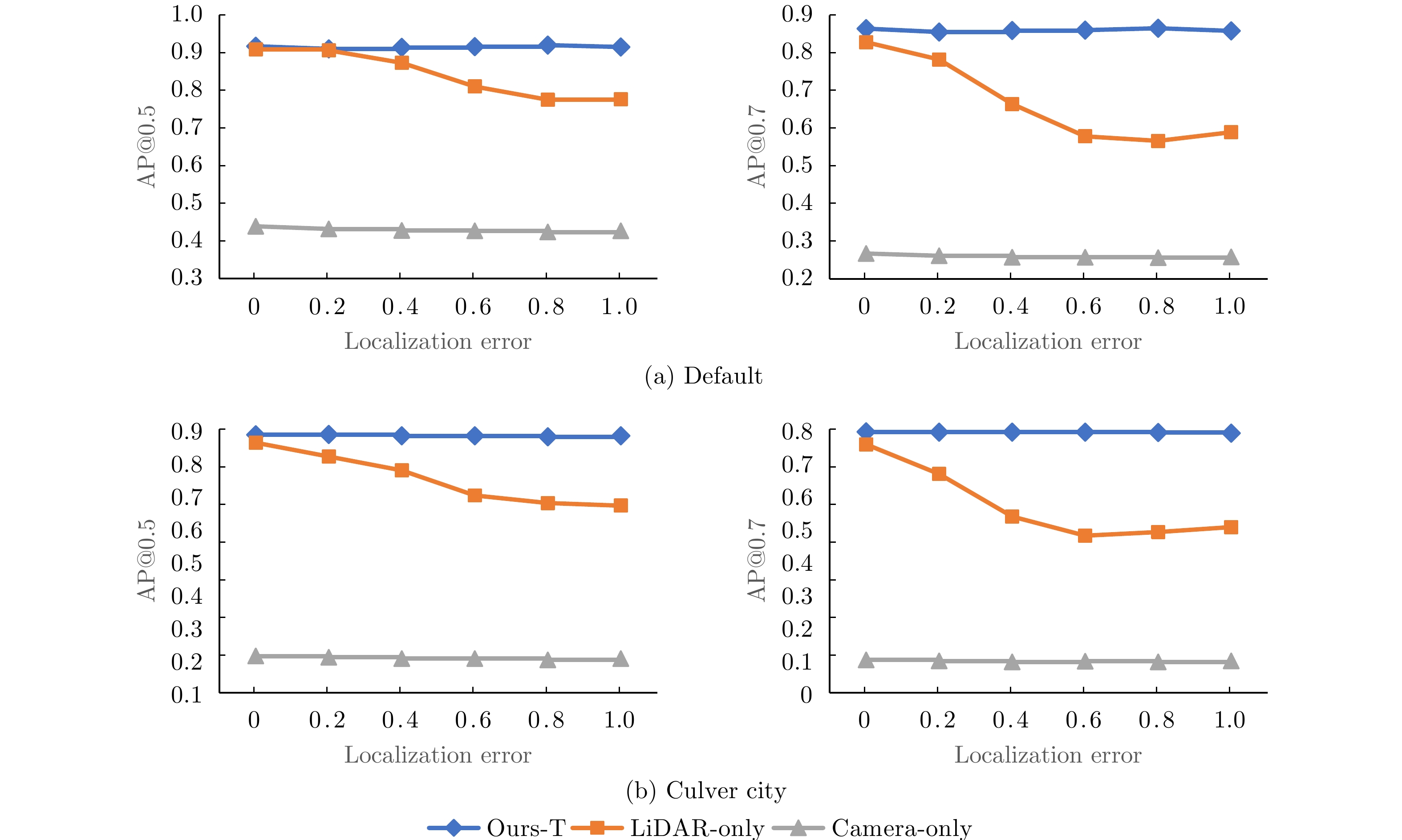 算法 Default Culver city AP@0.5 AP@0.7 AP@0.5 AP@0.7 Camera-only 43.9 28.1 19.0 8.6 LiDAR-only 90.9 82.9 85.9 75.4 Hybrid-C 70.7 58.1 58.9 44.5 Hybrid-L 87.8 78.6 76.6 63.6 表 1 Comprehensive performance comparison with SOTA algorithms (%)