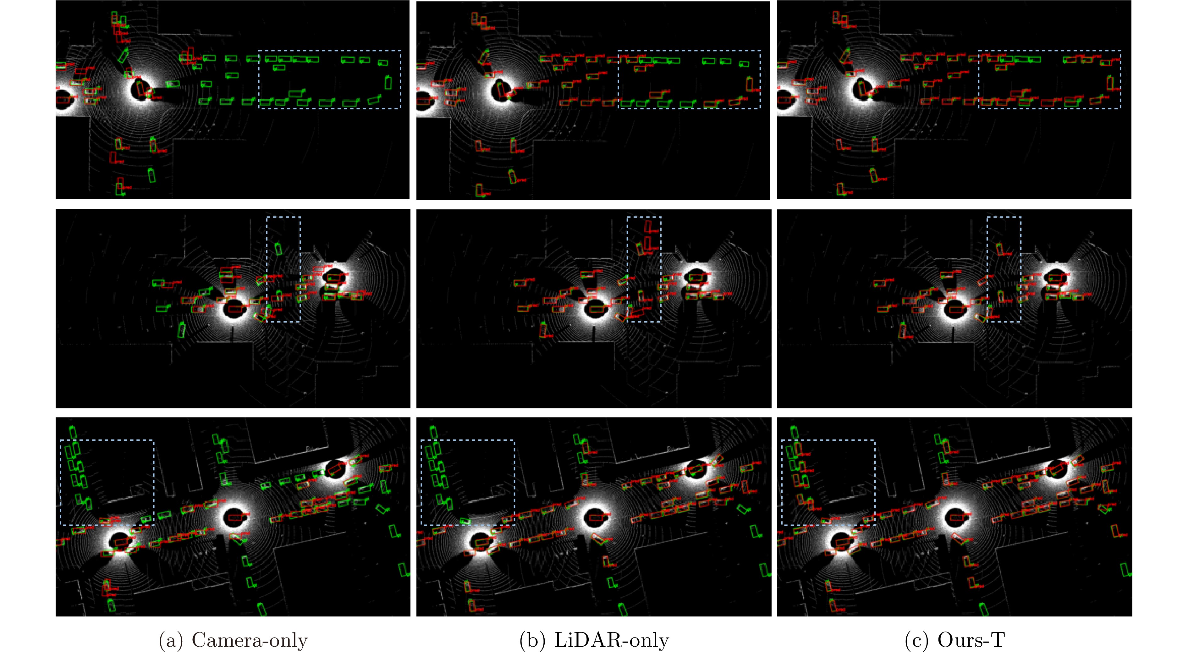 Method Default Culver City AP@0.5 AP@0.7 AP@0.5 AP@0.7 No Fusion 67.9 60.2 55.7 47.1 Early Fusion 89.1 80.0 82.9 69.6 Late Fusion 85.8 78.1 79.9 66.8 V2VNet [ 7] 89.7 82.2 86.8 73.3 Cooper [ 5] 89.1 80.0 82.9 69.6 F-Cooper [ 6] 88.7 79.1 84.5 72.9 AttFuse [ 8] 89.9 81.1 85.4 73.6 CoBEVT [ 15] 91.4 86.2 85.9 77.3 Ours-S 89.5 82.6 86.7 76.4 Ours-C 91.1 85.0 87.0 78.1 Ours-T 91.4 85.2 88.6 78.8 表 2 Performance comparison of the proposed algorithm under different heterogeneous modal scenarios (%)