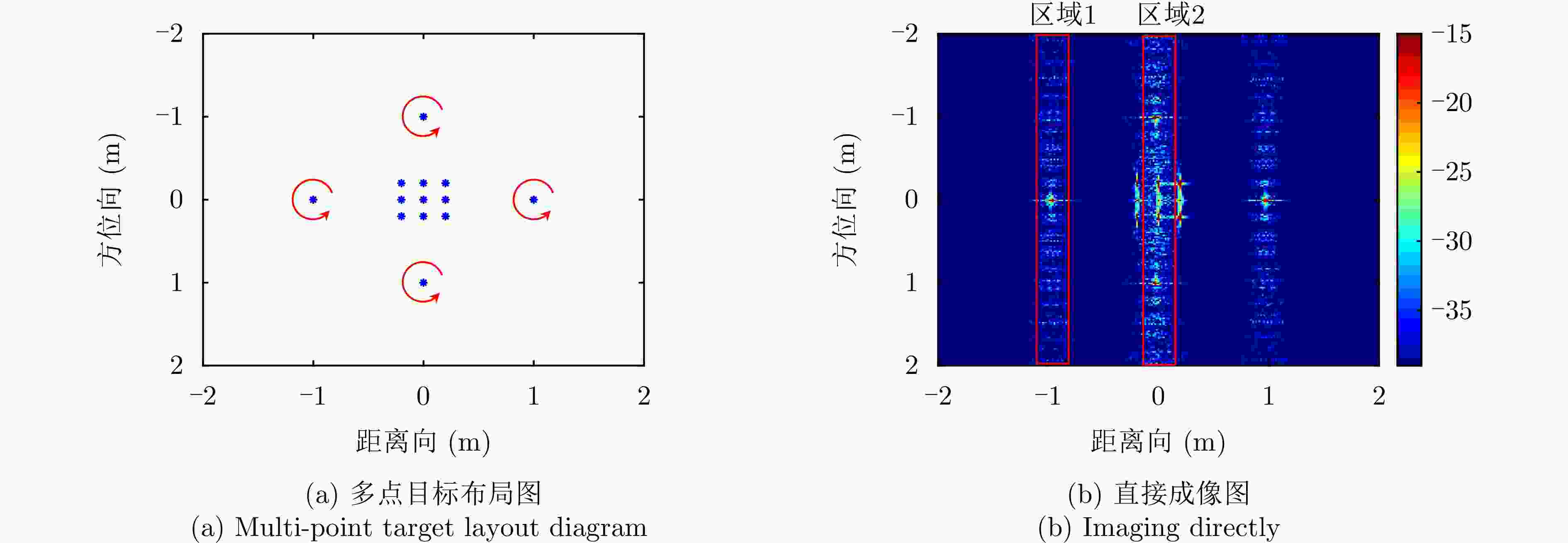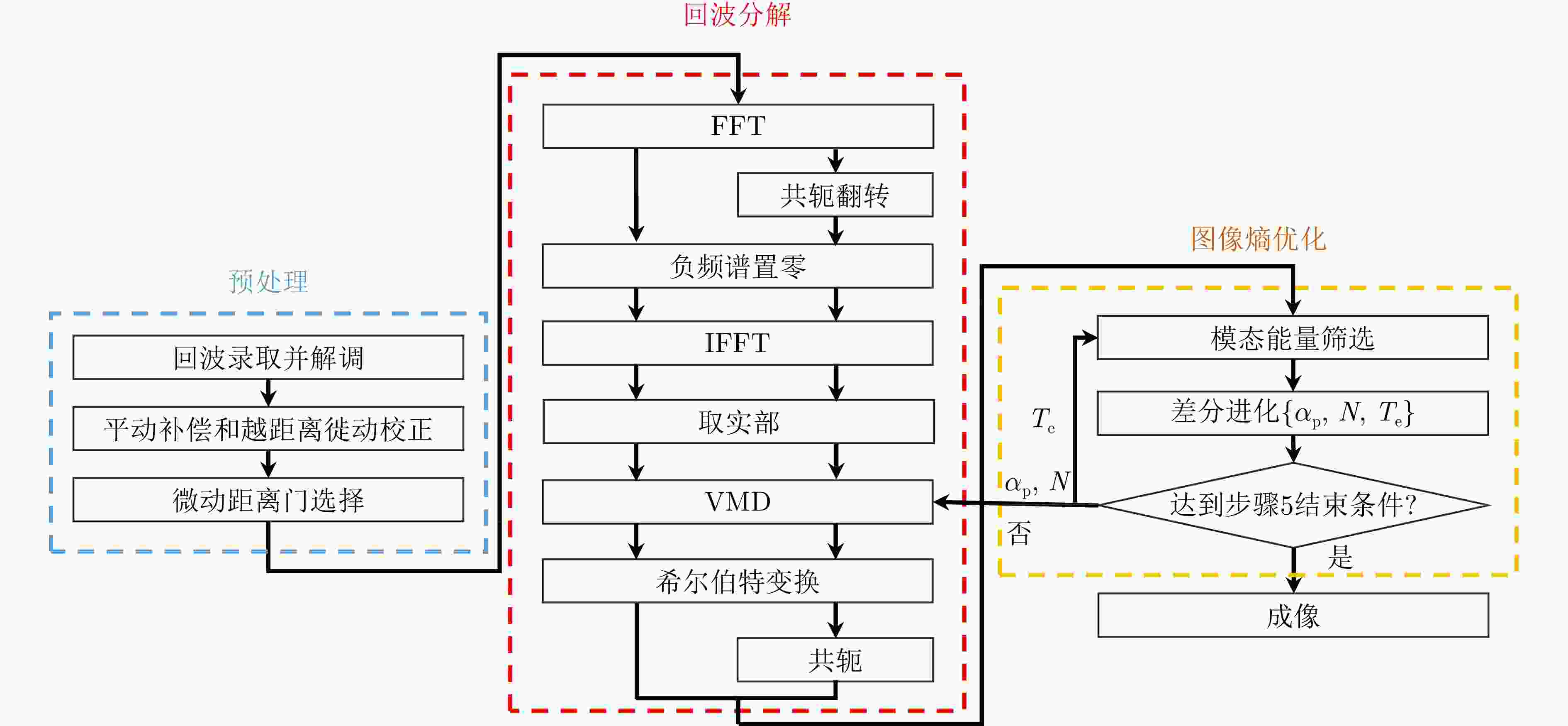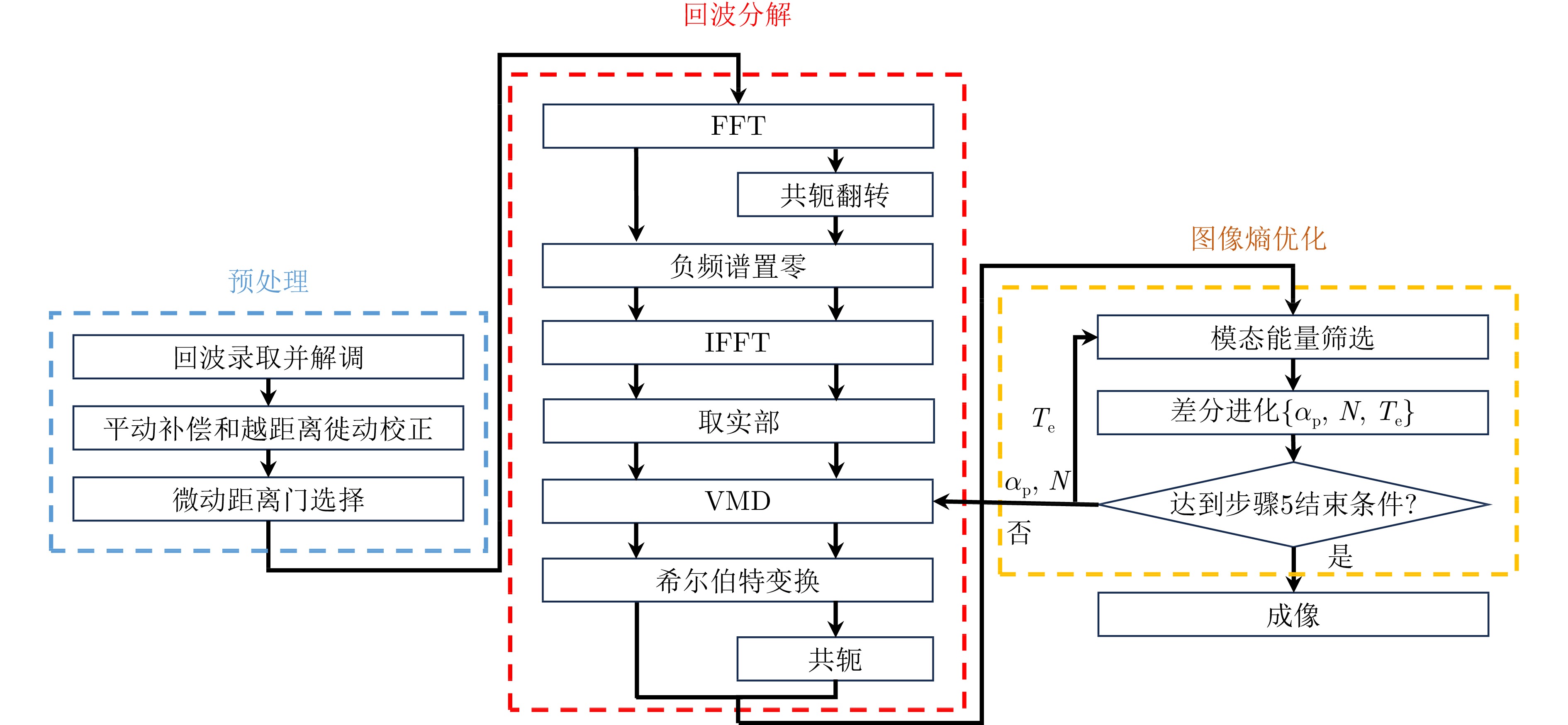 摘要: 逆合成孔径雷达(ISAR)在对空中目标成像时,目标自身的转动、振动等局部微动将产生微多普勒效应,回波将附加额外的多普勒调制,造成频谱展宽。在超高分辨条件下,这一微动特性将会影响主体散射点的聚焦,导致目标图像局部散焦模糊,严重影响成像质量。并且,微多普勒相位还具有时变非平稳特性,难以从ISAR目标回波中准确估计或分离出微多普勒。为了解决上述问题,该文利用目标主体回波和微多普勒分量的时频分布差异,提出一种基于变分模态分解(VMD)与优选的非参数化方法抑制了回波中的微多普勒分量,消除了微多普勒对成像的影响,获得超高分辨率的无人机ISAR成像结果。该文首先引入VMD算法并将其扩展到复数域,将ISAR目标回波数据沿方位向分解为若干个中心频率均匀分布于多普勒采样带宽中的模函数,在此基础上利用图像熵指标优化分解参数和筛选成像模态,以保证微多普勒的良好抑制和主体回波的较完整保留。与现有基于经验模态分解(EMD)和局部均值分解(LMD)的方法相比,所提方法在超大带宽条件下对旋翼微动引起的微多普勒干扰有着更为出色的抑制效果,而且对机身部分的保留更为完整。最后,通过仿真对比和超宽带微波光子ISAR无人机实测数据处理,证明了该文所提方法的有效性和优势。Abstract: The imaging of aerial targets using Inverse Synthetic Aperture Radar (ISAR) is affected by micro-Doppler effects resulting from localized micromotions, such as rotation and vibration. These effects introduce additional Doppler frequency modulation into the echo, leading to spectral broadening. Under ultrahigh-resolution conditions, these micromotions interfere with the focusing process of subject scatterers, resulting in images with poor focus showing significantly reduced quality. Furthermore, micro-Doppler signals exhibit temporal variability and nonstationary characteristics, posing difficulties in their estimation and differentiation from the echo. To address these challenges, this paper proposes a nonparametric method based on Variational Mode Decomposition (VMD) and mode optimization to separate the echo of the subject from micro-Doppler components. This separation is achieved by utilizing differences in their respective time-frequency distributions. This methodology mitigates the effect of micro-Doppler signals on the echo and obtains imaging results of a drone with ultrahigh-resolution. The VMD algorithm is introduced and subsequently extended to the complex domain. The method entails the decomposition of the ISAR echo along the azimuth direction into several mode functions distributed uniformly across the Doppler sampling bandwidth. Subsequently, image entropy indices are employed to optimize the decomposition parameters and select the imaging modes. This ensures the effective suppression of micro-Doppler signals and preservation of the subject echo. Compared to existing methods based on Empirical Mode Decomposition (EMD) and Local Mean Decomposition (LMD), the proposed method exhibits superior performance in suppressing image blurring caused by micro-Doppler effects while ensuring complete retention of fuselage details. Furthermore, the effectiveness and advantages of the proposed method are validated through simulations and processing of ultrawideband microwave photonic data obtained from drone measurements.