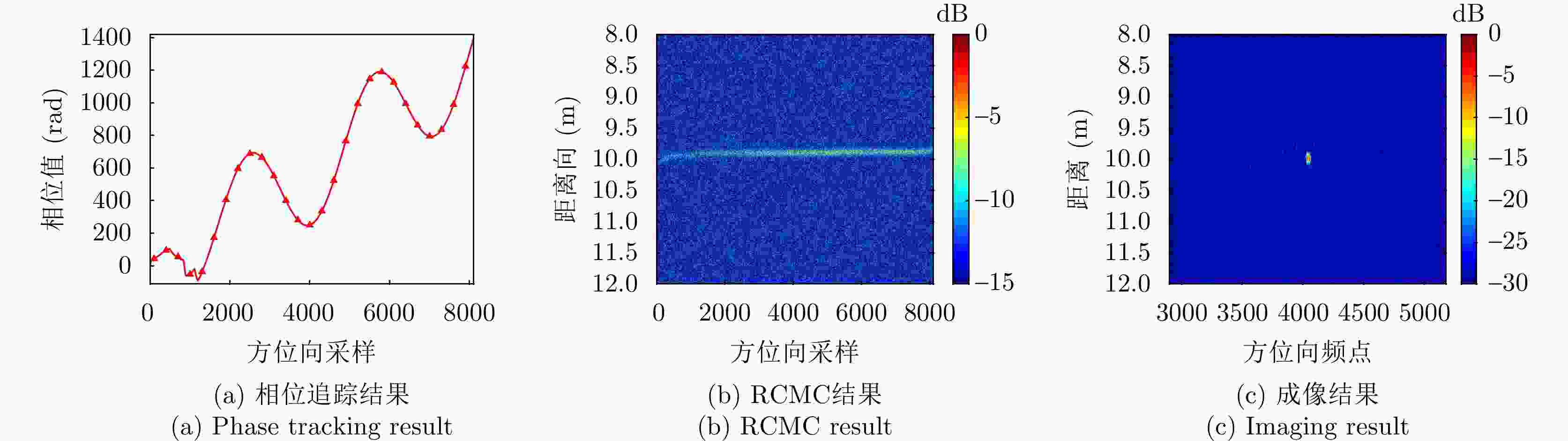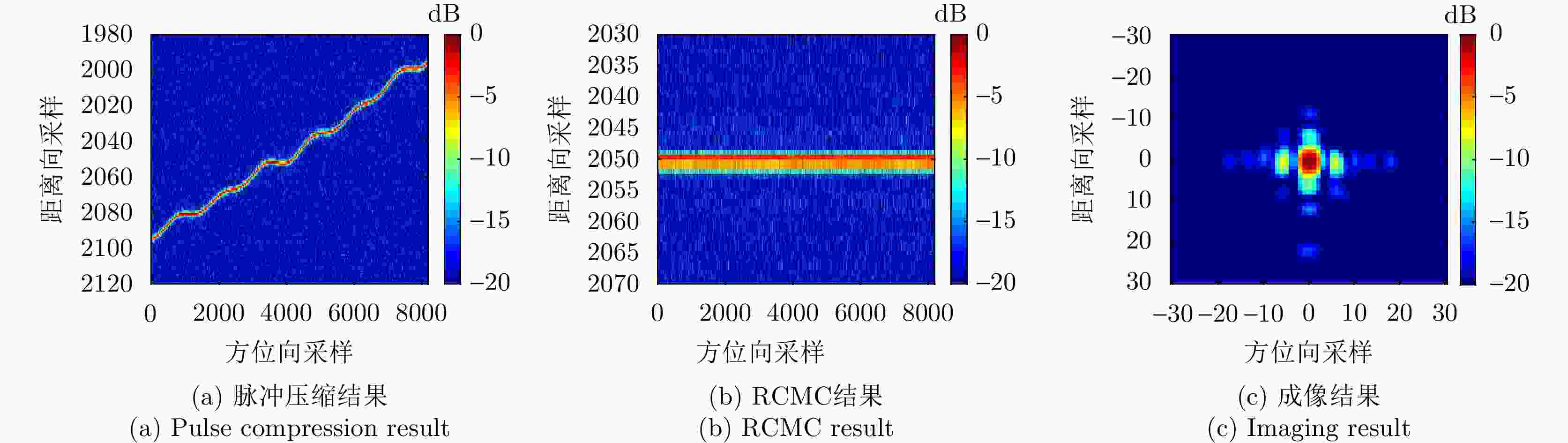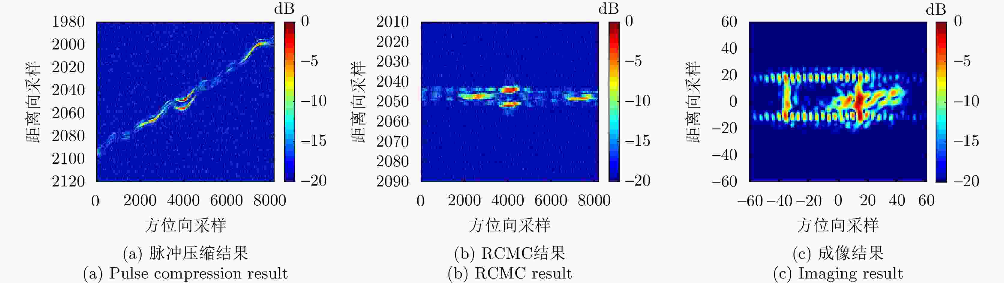 参数 数值 中心频率(GHz) 10 信号带宽(MHz) 300 距离向采样率(MHz) 360 信号脉宽(μs) 10 脉冲重复频率(Hz) 2000 中心斜距(km) 10 距离向采样点数 4096 方位向采样点数 8192 表 3 平台与目标运动参数