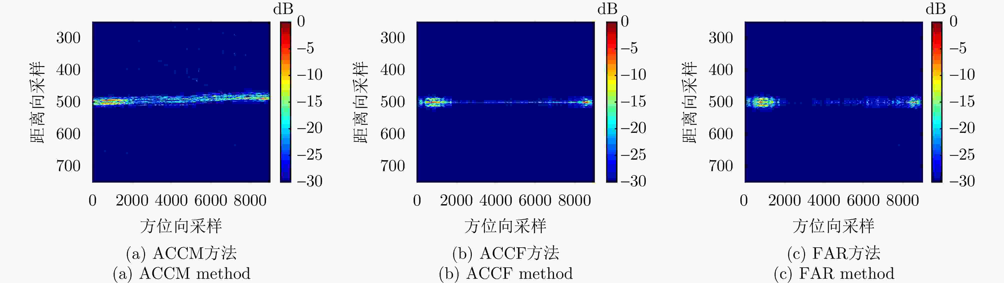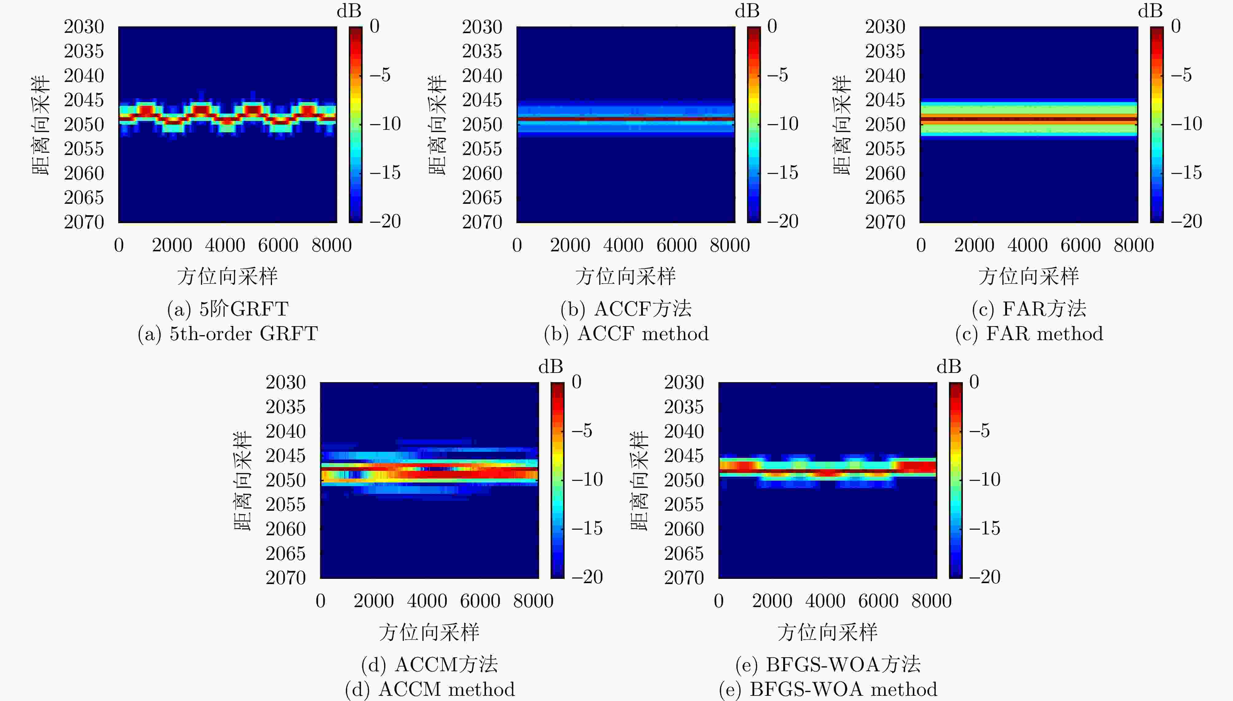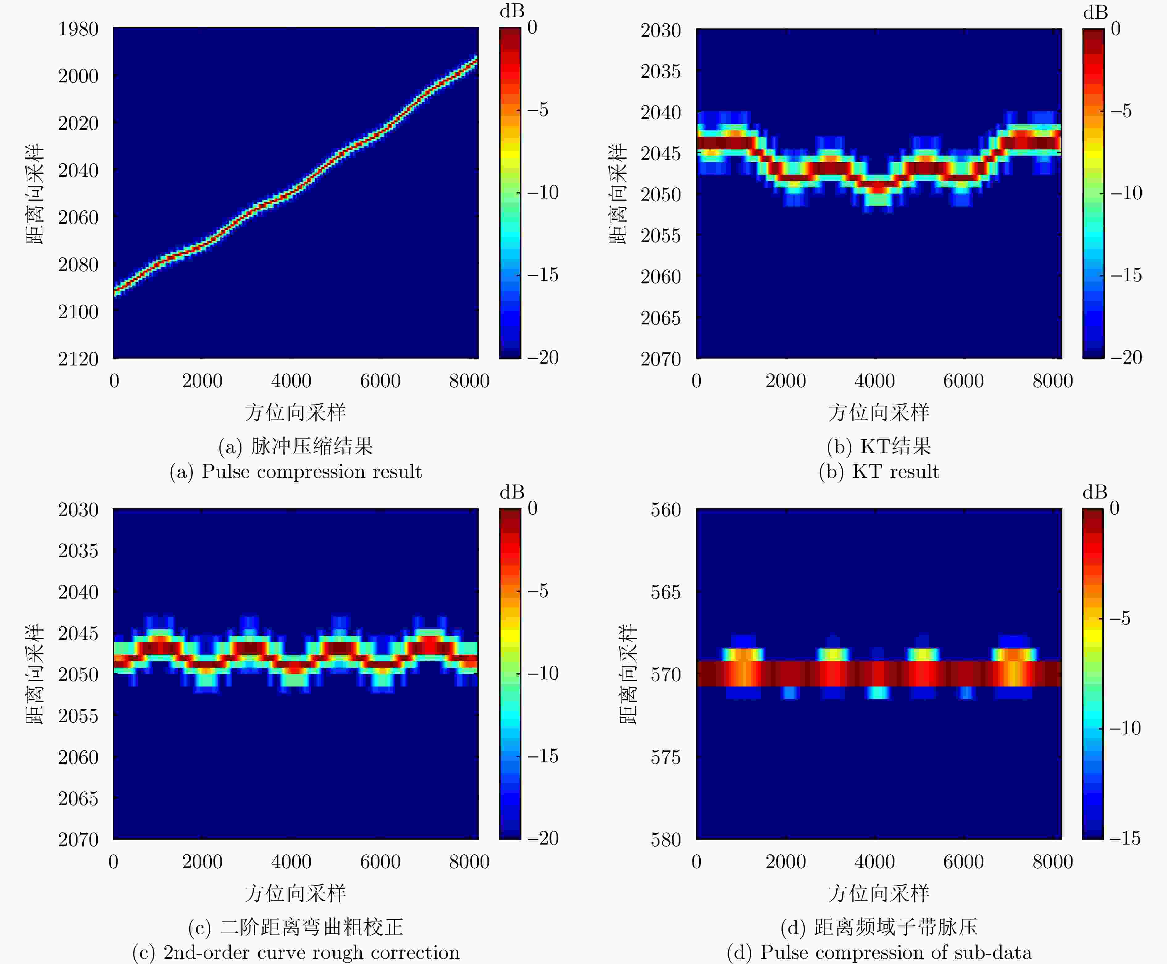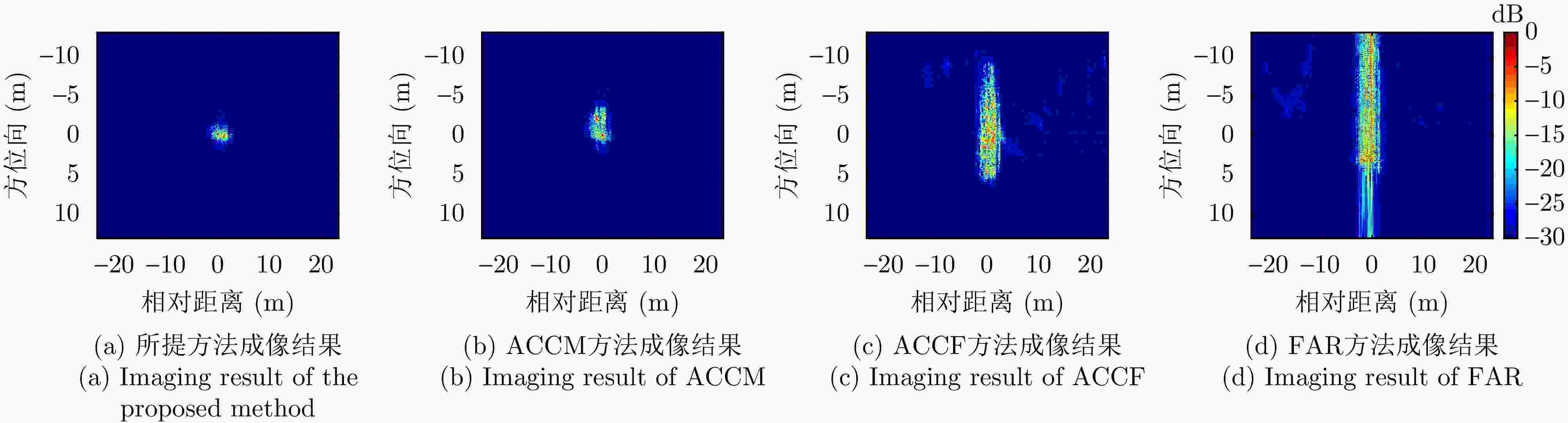 参数 数值 中心频率(GHz) 10 信号带宽(MHz) 300 距离向采样率(MHz) 360 信号脉宽(μs) 10 脉冲重复频率(Hz) 2000 中心斜距(km) 10 距离向采样点数 4096 方位向采样点数 8192 表 3 平台与目标运动参数