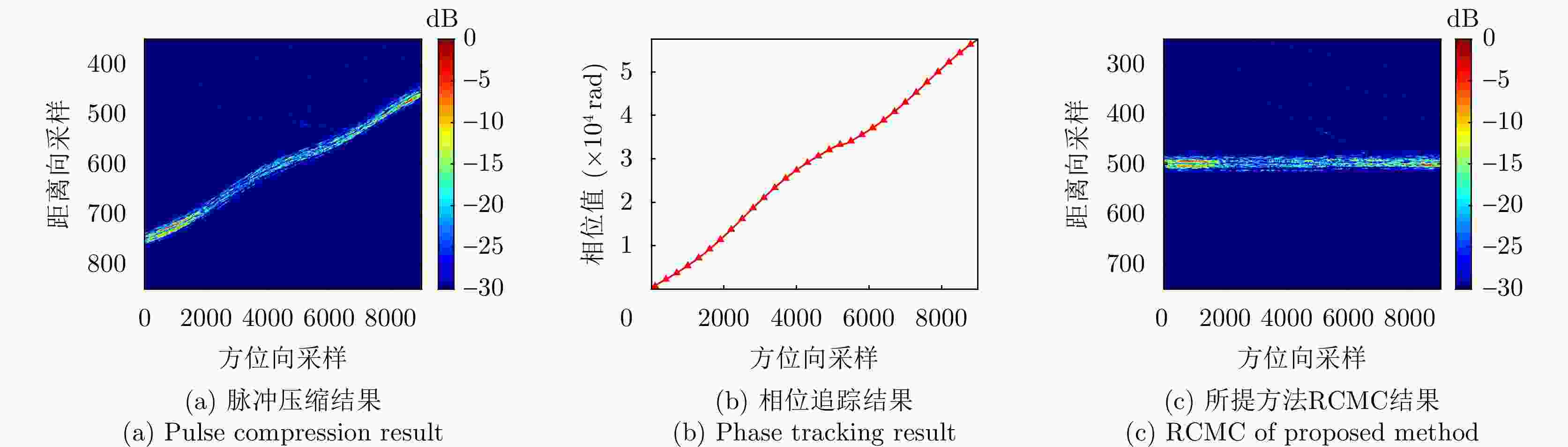 摘要: 距离徙动校正(RCMC)是合成孔径雷达(SAR)实现运动目标参数估计和聚焦成像的关键环节。当目标或平台运动复杂时,传统低阶RCMC方法将不再适用,而现有基于参数化的高阶RCMC方法易存在模型失配和计算复杂度高的问题、现有非参数化方法在低信噪比下性能也将大幅下降。对此,该文借助扩展卡尔曼滤波(EKF)对造成RCM的相位进行追踪,进而构建RCM补偿函数实现RCMC。所提方法不依赖于RCM的具体模型,追踪得到的相位包含高阶分量,因此可以实现SAR运动目标的高阶RCMC。此外,EKF在进行相位追踪的同时能对信号进行滤波处理,可有效降低所提方法的信噪比(SNR)门限。与传统方法相比,该方法适用性广,计算量适中,且能校正不可忽略的高阶残余距离徙动。该文详细阐释了所提方法的原理及数学模型,并通过多组仿真和实测数据处理验证了所提方法的有效性和优越性。Abstract: Range Cell Migration Correction (RCMC) represents an important advancement in the estimation of moving target parameters and imaging of targets in high-resolution Synthetic Aperture Radar (SAR) systems. When the motion of a target or platform becomes complex, the traditional low-order RCMC method may no longer be suitable. Meanwhile, the existing high-order RCMC method based on parameterization is susceptible to issues such as model mismatch and high computational complexity. Additionally, its performance may decrease significantly under a low Signal-to-Noise Ratio (SNR). This research utilizes Extended Kalman Filter (EKF) to track the phase responsible for RCM and develop a phase compensation function to achieve RCMC. The proposed approach is model-independent and can track high-order components in the phase, thereby enabling high-order RCMC of moving targets in SAR. In addition, EKF can filter signals during phase tracking to effectively lower the SNR threshold of the proposed method. Thus, this method offers broad applicability, moderate computational complexity, and the ability to correct non-negligible high-order residual range cell migrations, thereby distinguishing it from traditional methods. This study thoroughly explains the principles and mathematical model behind the proposed method, demonstrating its effectiveness and superiority through multiple sets of simulations and measured data processing.