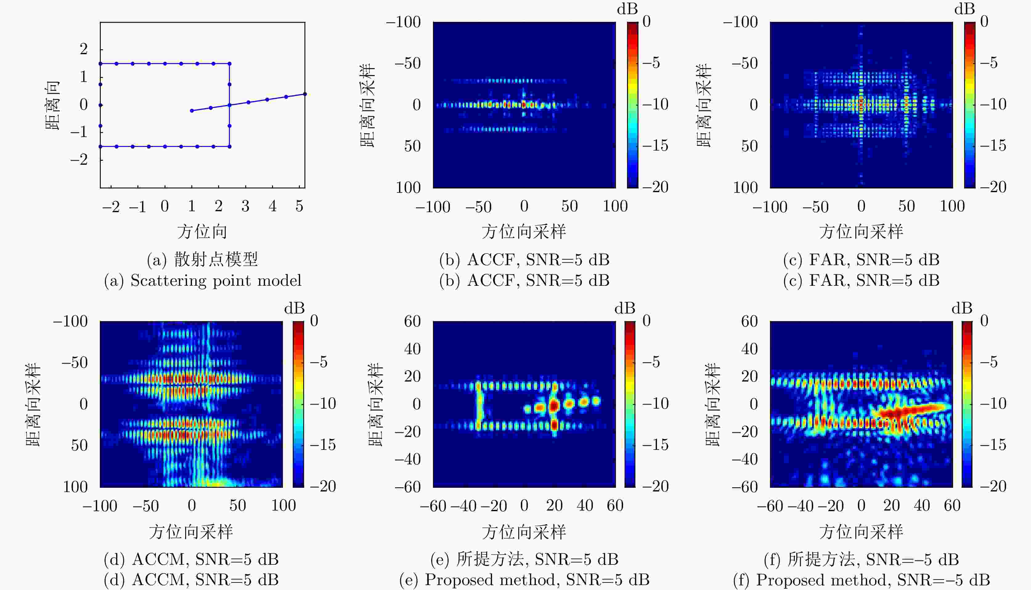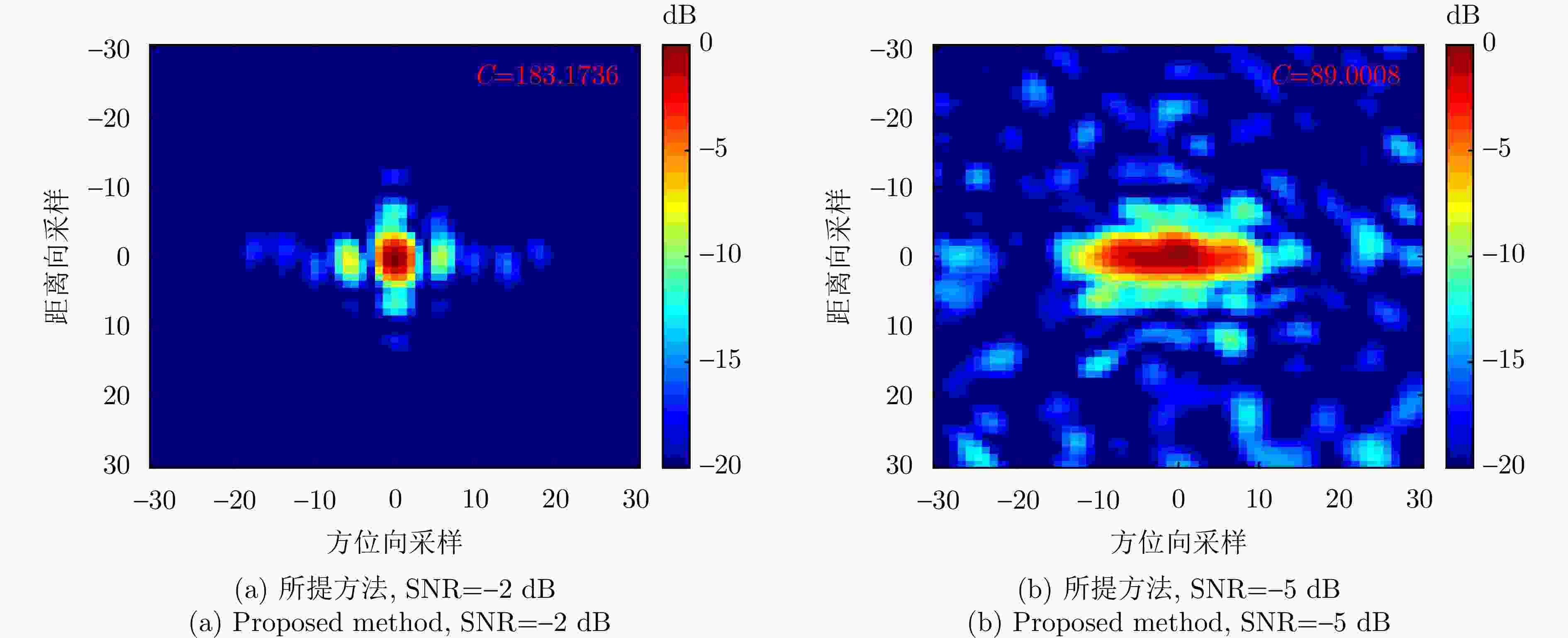 参数 数值 平台速度$ V $(m/s) 100 目标距离向速度$ v_{\rm r} $(m/s) –10 目标距离向加速度$ a_{\rm r} $(m/s2) –2 目标方位向速度$ v_{\rm a} $(m/s) 10 目标方位向加速度$ a_{\rm a} $(m/s2) 2 表 4 不同SNR下各方法的图像对比度