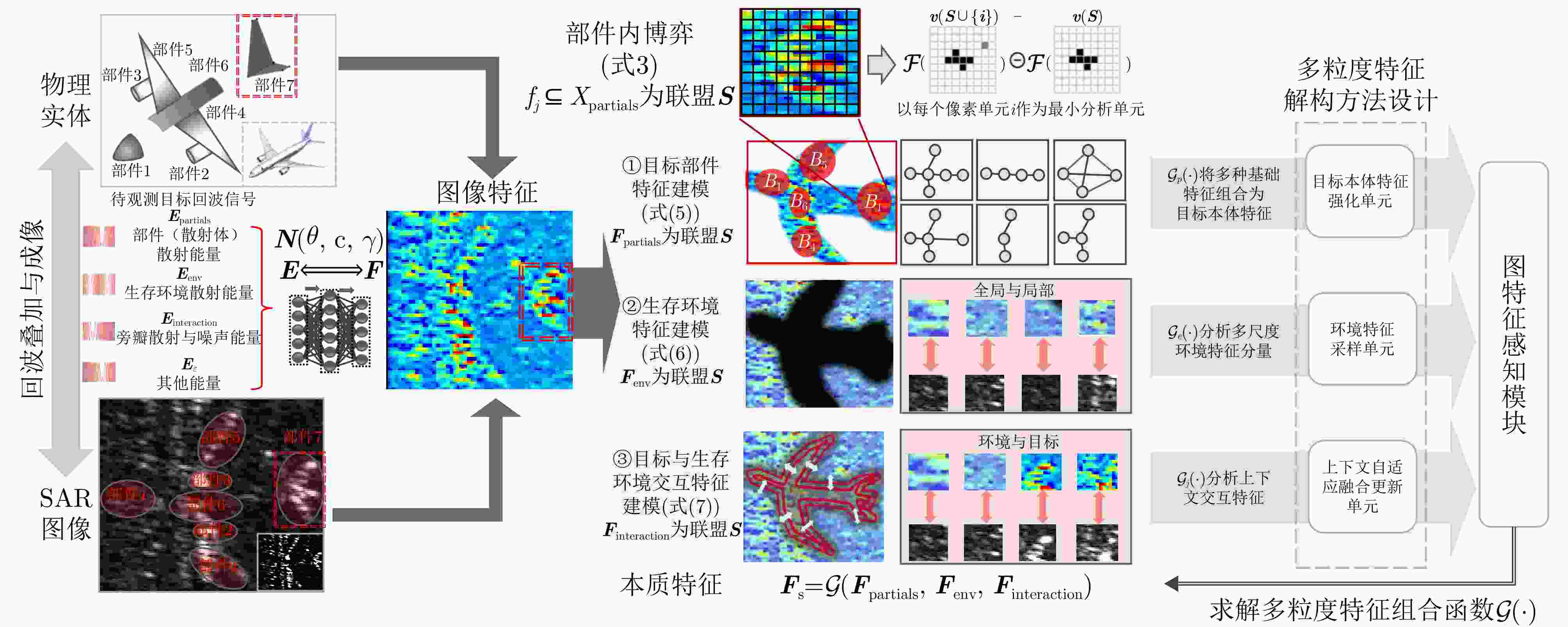 摘要: 基于深度学习的合成孔径雷达(SAR)图像目标识别技术日趋成熟。然而,受散射特性、噪声干扰等影响,同类目标的SAR成像结果存在差异。面向高精度目标识别需求,该文将目标实体、生存环境及其交互空间中不变性特征的组合抽象为目标本质特征,提出基于图网络与不变性特征感知的SAR图像目标识别方法。该方法用双分支网络处理多视角SAR图像,通过旋转可学习单元对齐双支特征并强化旋转免疫的不变性特征。为实现多粒度本质特征提取,设计目标本体特征强化单元、环境特征采样单元、上下文自适应融合更新单元,并基于图神经网络分析其融合结果,构建本质特征拓扑,输出目标类别向量。该文使用t-SNE方法定性评估算法的类别辨识能力,基于准确率等指标定量分析关键单元及整体网络,采用类激活图可视化方法验证各阶段、各分支网络的不变性特征提取能力。该文所提方法在MSTAR车辆、SAR-ACD飞机、OpenSARShip船只数据集上的平均识别准确率分别达到了98.56%, 94.11%, 86.20%。实验结果表明,该算法具备在SAR图像目标识别任务中目标本质特征提取能力,在多类别目标识别方面展现出较高的稳健性。-