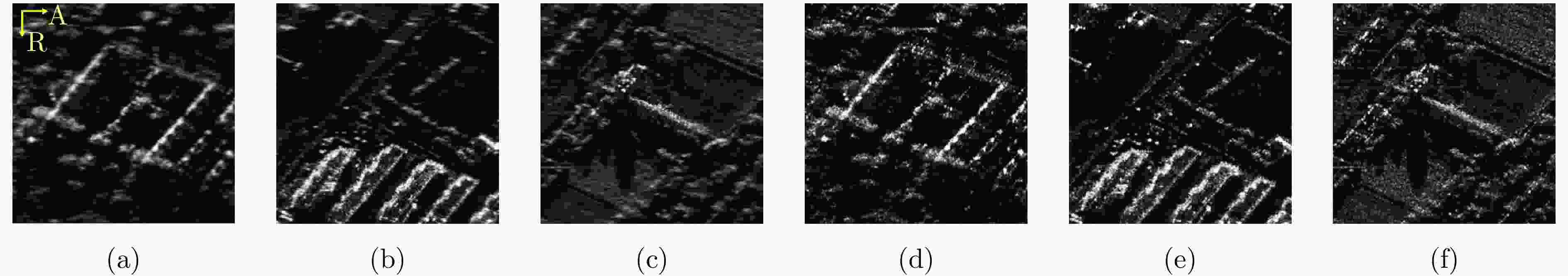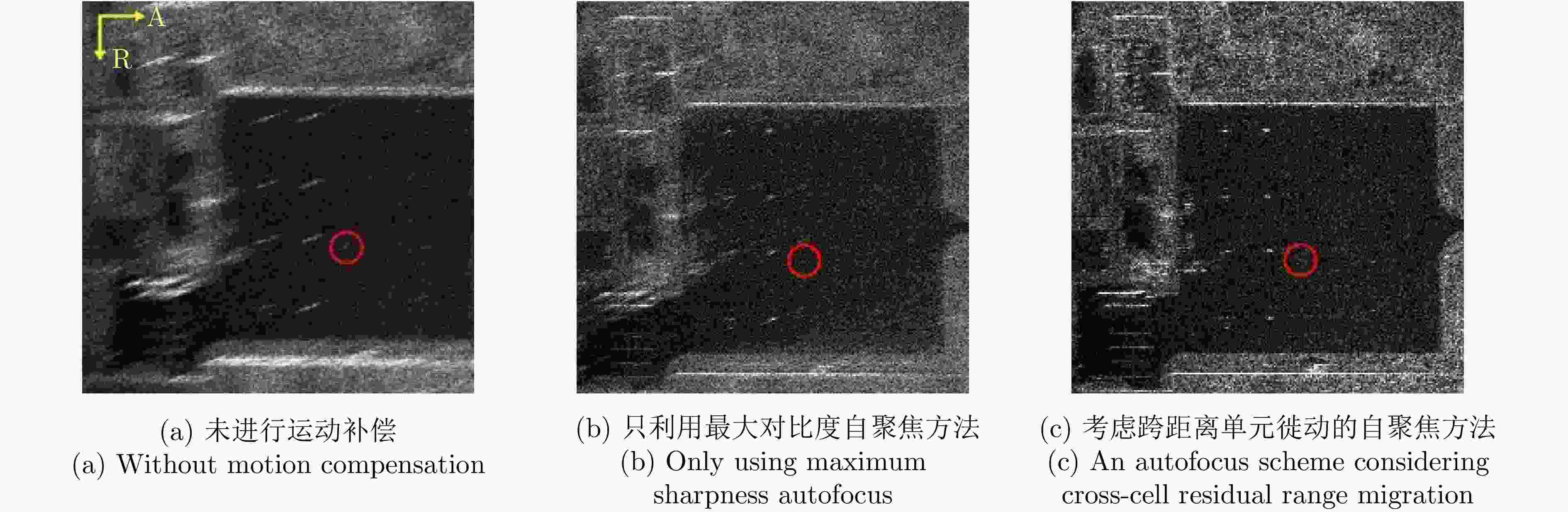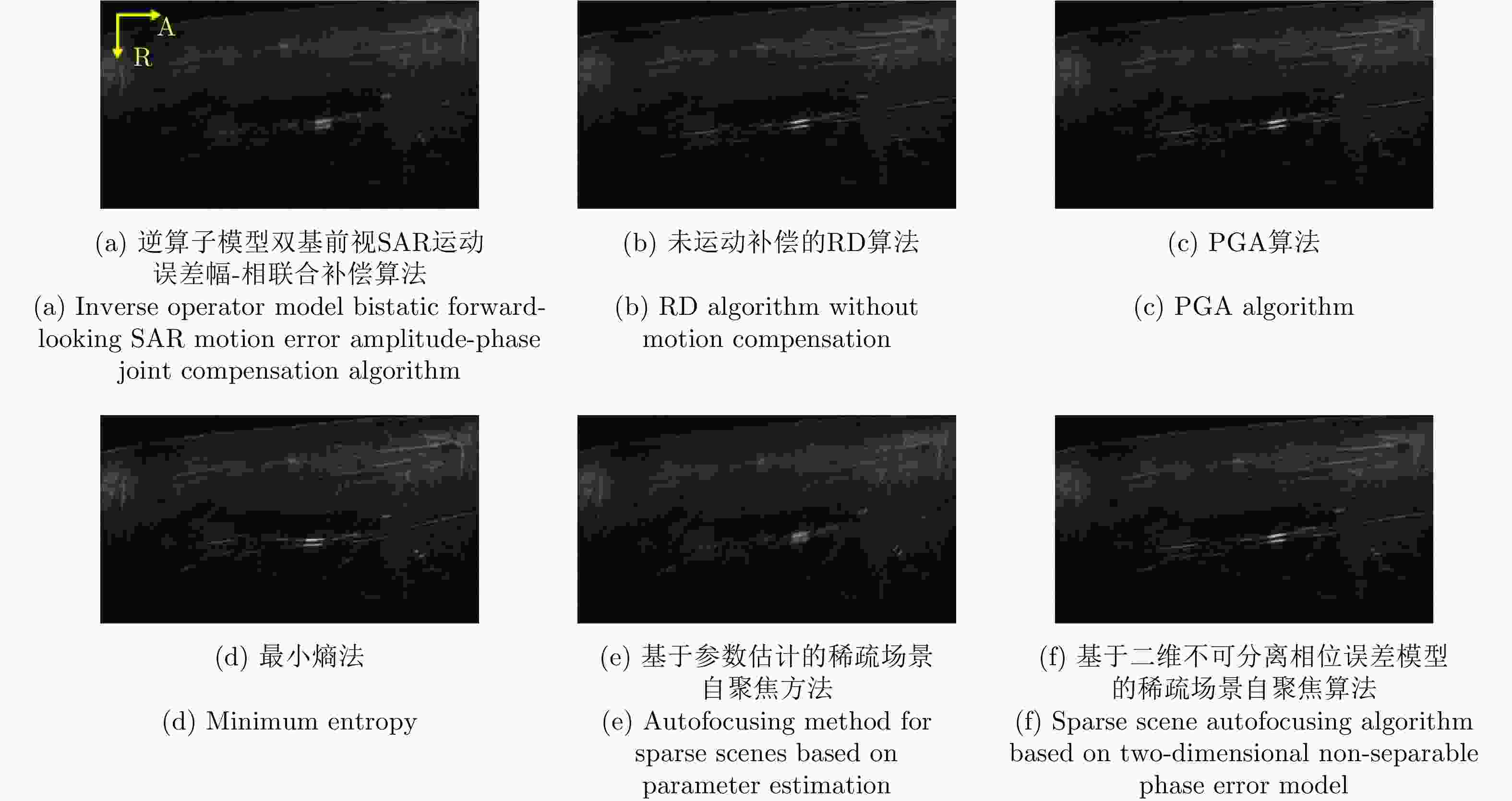 图 28 结合多子孔径MD算法的FFBP算法对(a) 场景1、(b) 场景2和(c) 场景3的成像结果和基于图像最大对比度的FFBP轨迹估计算法对(d) 场景1、(e) 场景2和(f) 场景3的成像结果