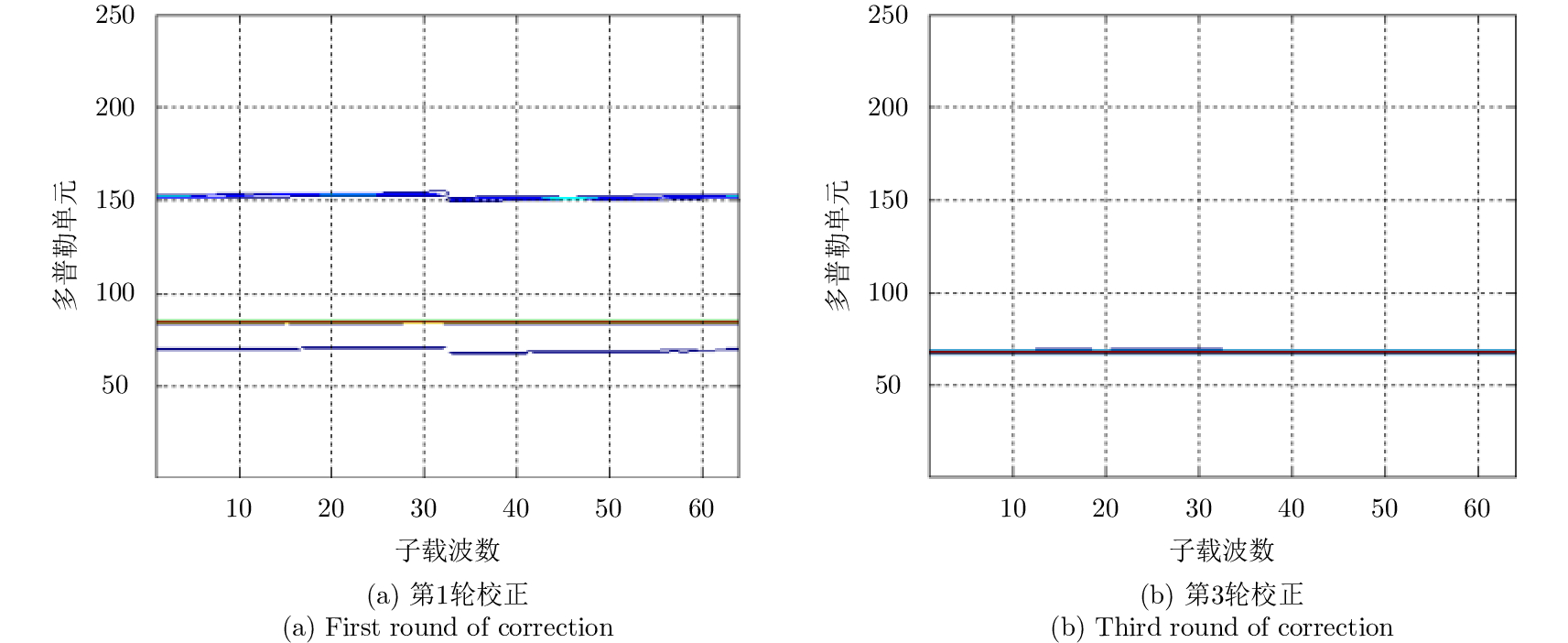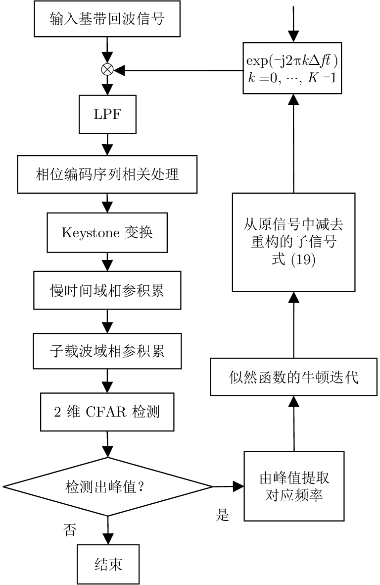 To detect multiple targets on a phase-coded Orthogonal Frequency Division Multiplexing (OFDM) radar, this paper proposes a parameter estimation method based on channel separation and maximum likelihood principle. First, the multi-channel signals were separated because of the orthogonality of the OFDM system, and then the separated signals were correlated with the phase-coded reference signal in the fast time domain to acquire a 1-D range profile from each channel. Subsequently, Keystone transform was used to correct the effect of the coupling between Doppler shift of the subcarrier and the slow time domain. Simultaneously, coherent accumulation was conducted jointly in the slow time and subcarrier domains to obtain a 2-D range-Doppler spectrum. Using CLEAN technique, the peaks of this spectrum were examined to obtain the range cells and velocities of each target. Using these parameters as the initial values, the likelihood function was maximized using Newton’s iterative algorithm to yield an approximate maximum likelihood estimator of the motion parameters. Simulation results demonstrate that the proposed algorithm outperforms the traditional Keystone-based estimation algorithm both in computational complexity and parameter estimation accuracy. The algorithm improved the input SNR by approximately 4 dB under the same root mean square error, and the mean square error approached the Cramer-Rao lower bound.