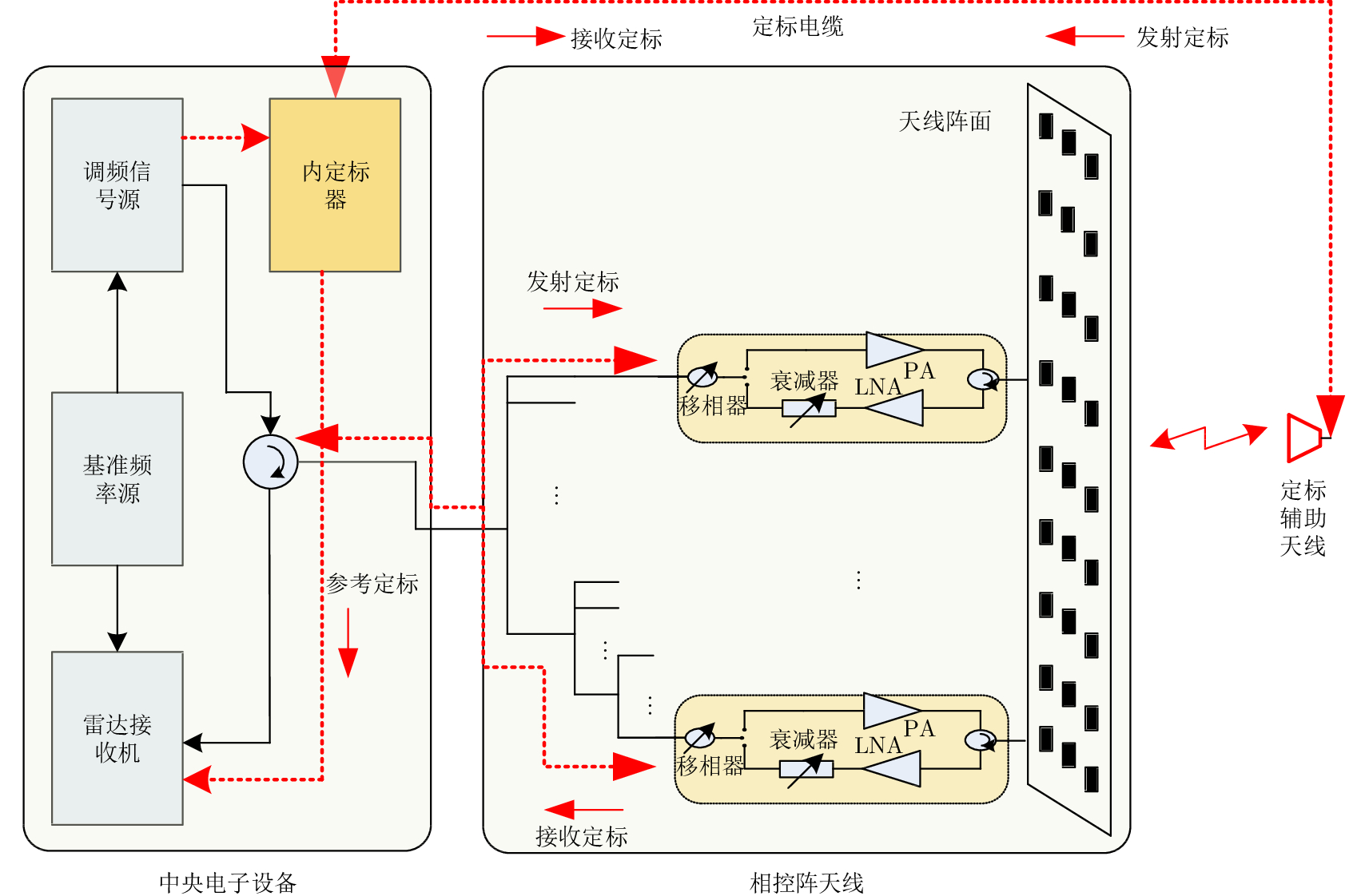 Internal calibration measures the changes in amplitude and phase of a system during imaging via the calibration loop built in Synthetic Aperture Radar (SAR). Internal calibration is also an important factor to improve the radiation accuracy of the radar. In this study, a novel wireless internal calibration method with auxiliary antenna is presented, considering that the traditional scheme is inefficient, as the calibration loop cannot cover the path from the TR (Transmitter-Receiver) output to the antenna radiator. The calibration loop also results in a complicated and heavy network. The principle and model of the new method is given, and the TR performance and system transfer function calibration approach are deduced. In addition, error analysis is conducted. The simulation results show that TR amplitude calibration errors caused by the rod of auxiliary antenna are at a 10–3 dB level, and phase calibration errors are obtained from the simulation curve in the paper; transfer function amplitude calibration errors are less than 0.1 dB, and phase calibration errors are not sensitive to the bias of the rod. Finally, the simulation results based on typical parameters of spaceborne SAR and the individual TR calibration experiments confirm the availability and feasibility of this novel method.