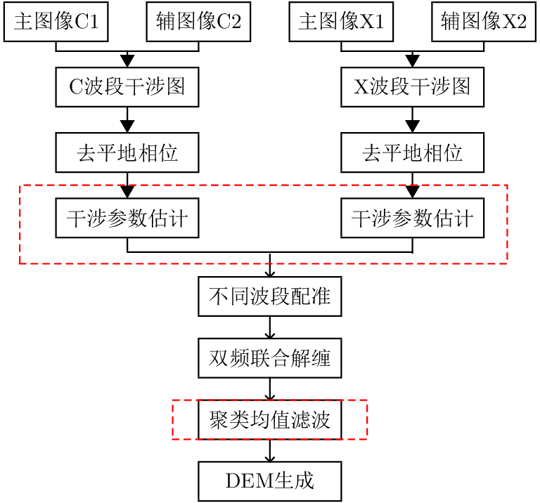 Dual-frequency joint phase unwrapping does not need to satisfy the Iton hypothesis, so dual-frequency interferometry can effectively extract elevation information from large terrain undulation areas. This paper presents an effective method for Dual-Frequency Interferometry (DFI) SAR terrain elevation reconstruction, aiming at the low precision of elevation reconstruction in DFI processing. This method improves the key steps in the conventional process. Firstly, Nonlocal Interferogram Estimation (NL-InSAR) technique is used to accurately estimate amplitude map, coherence coefficient, and Interferometric phase before the registration in different bands. After filtering, the filtered amplitude information of each band is used to realize the registration of Interferometric phase in different bands. Then clustering analysis technique is used to mark the effective points and noise points of unwrapping phase, and these effective points are used to filter the mean value of joint phase unwrapping. The airborne measured data used in the experiment include the complex data of C band and X band main and auxiliary SAR images of the same scene. In view of the measured data processing, the proposed method provides better results of elevation reconstruction.