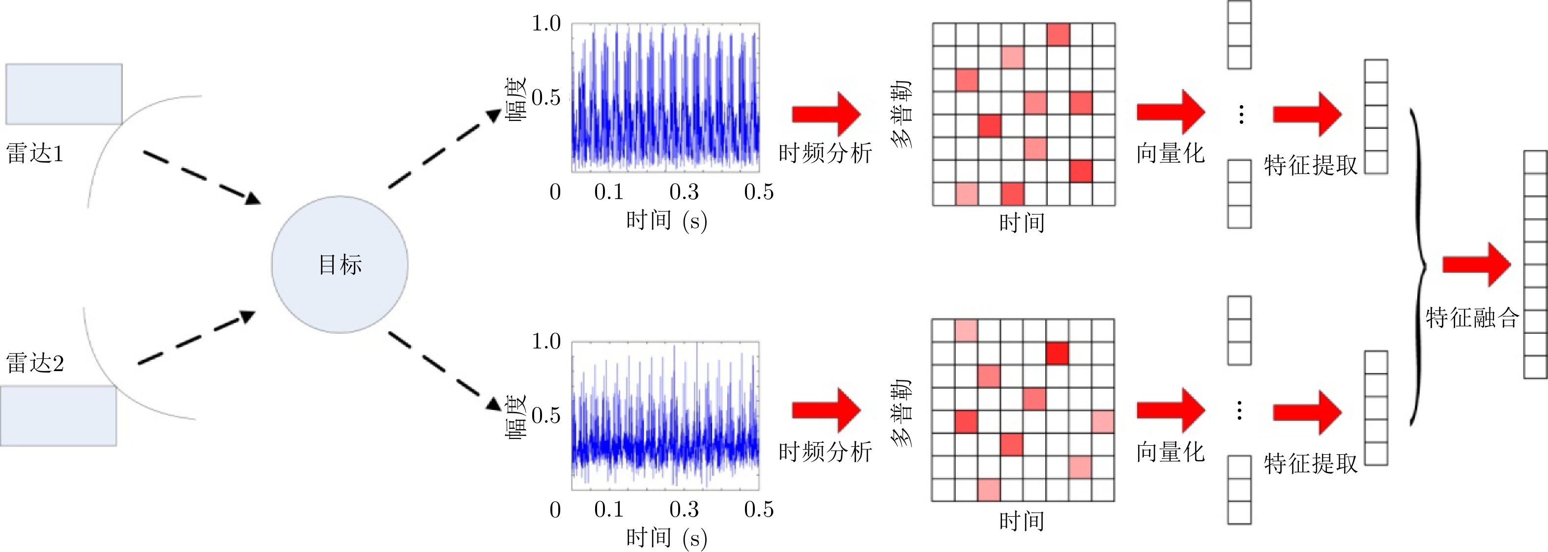 The micro-motion feature is one of the important characteristic information of spatial target recognition. However, the existing multifunctional Multi-Input Multi-Output (MIMO) radar usually has to allocate a large number of continuous time resources for target micro-motion feature extraction after target searching and tracking, which leads to a low real-time performance of target recognition and poor overall performance of radar system. To solve this problem, this paper presents a multi-target micro-motion feature extraction method for MIMO radar based on tracking pulses. First, according to the azimuth information of each target, the MIMO radar transmitting waveform is designed, and the tracking pulses are transmitted simultaneously for targets with different directions. On this basis, by considering the micro-motion feature extraction performance and the target tracking performance synthetically, the transmission time series of the tracking pulses are optimized. Finally, the narrowband tracking pulses are directly used to simultaneously extract the micro-motion features of the targets in different directions, which makes it no longer necessary to allocate additional radar resources for target feature extraction. Consequently, the real-time recognition performance and the working efficiency of radar are improved significantly. Simulations demonstrate that when the signal-to-noise ratio is larger than –10 dB, the micro-motion features of multi-targets can be extracted accurately, which verifies the effectiveness and robustness of the proposed method.