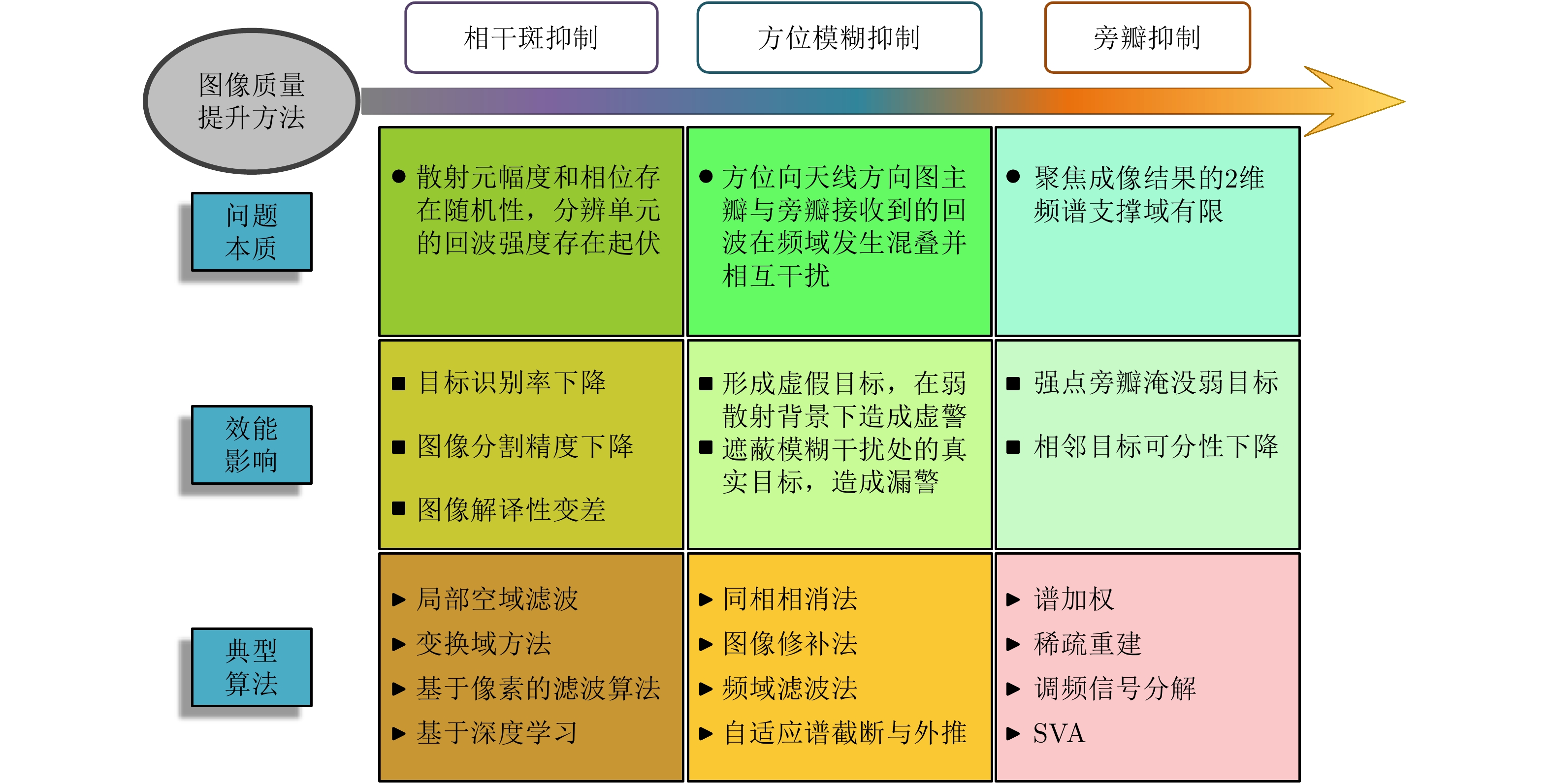 As an important tool for acquiring remote sensing information, Synthetic Aperture Radar (SAR) has various modes, including high-resolution wide-swath, multi-angle information acquisition, high temporal observation, and three-dimensional topographic mapping. For any spaceborne SAR system, obtaining high-quality images is a prerequisite for improving the performance of SAR applications. In this paper, we analyze the factors affecting spaceborne SAR imaging and image quality with respect to orbit, platform, payload, and signal processing. We describe high-precision data acquisition techniques, including amplitude-phase compensation, the dynamic adjustment of the central electronic equipment, and antenna pattern estimation. We then present imaging compensation methods based on the improved motion model and tropospheric delay correction, which can achieve resolutions better than 0.3 m. Lastly, we summarize and compare SAR image processing techniques such as speckle noise suppression, azimuth ambiguity suppression, and sidelobe suppression, whereby the equivalent number of looks can be increased to more than 25 and the azimuth ambiguity and sidelobes can both be suppressed by 20 dB.