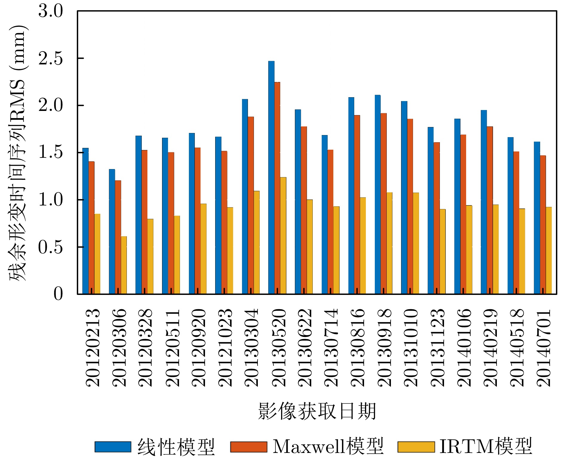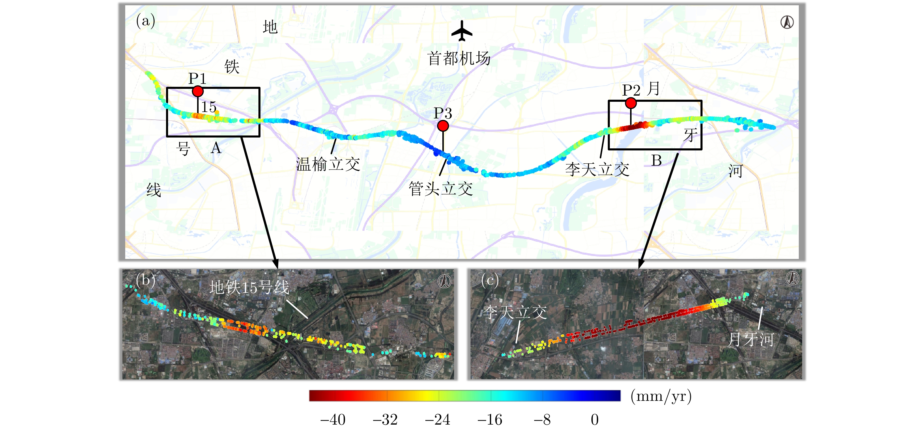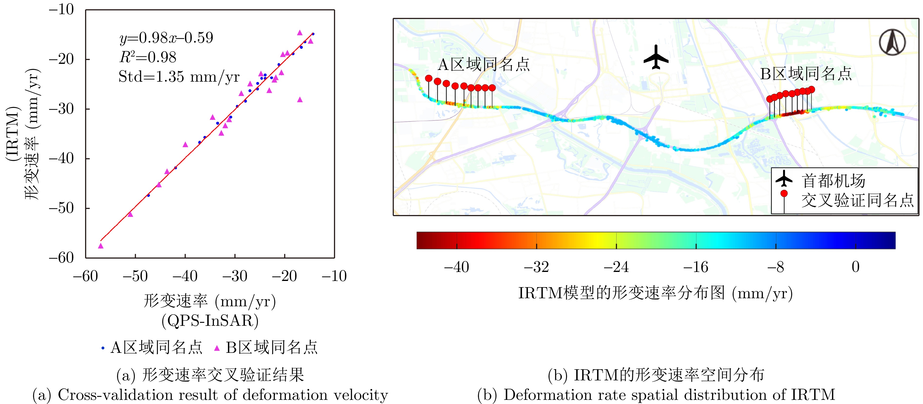 Long-term cyclic loading by vehicles is a non-negligible contributor to post-work settlement of highways. Current Interferometric Synthetic Aperture Radar (InSAR) deformation models used for monitoring the deformation of soft-soil highways generally neglect the contribution of cyclic loading. The InSAR time-series deformation models used for monitoring highway deformation are typically combinations of one or several purely empirical functions, which lack clarity in physical significance and overlook the impact of cyclic loading on settlement. Herein, a method for estimating the deformation of soft-ground highways that accounts for cyclic loading is proposed (Improved InSAR Model considering both the Rheological Properties and the Traffc Loading, IRTM). The method improves InSAR deformation modeling and the parameter estimation algorithms. In the deformation modeling, the Maxwell rheological model, which describes the deformation and creep characteristics of soft soil, serves as the base model for InSAR modeling. An additional dynamic stress model was incorporated to describe the plastic deformation caused by cyclic loading, which was combined with a thermal expansion model to characterize the thermal expansion component of the road base and bridge affected by temperature. This combination provided a more reasonable interpretation of the deformation estimation data. For parameter estimation, a method based on a Genetic Algorithm (GA) and a parameter estimation algorithm was proposed. In particular, a parameter estimation method combining GA and the Levenberg-Marquardt (LM) algorithm was developed, where the initial value obtained by GA was further optimized by LM to enhance the solving efficiency and accuracy. The proposed method was validated through simulation and experiments employing real data. The simulation revealed that the relative errors of the model parameter estimates were all below 6% when ±0.5 rad noise was applied. Real data from the selected study area, i.e., the Beijing-Pinggu Expressway, were utilized, and the time-series deformations from 22 January 2012 to 1 July 2014 were obtained. The results show that the cumulative deformation reached −140 mm, where the rheological component of the soft-ground section was the dominant contributor to deformation, accounting for approximately 76%, whereas the cyclic through-load component was dominant at road intersections, accounting for 81%. Compared with single Maxwell and traditional linear models, the modeling accuracy of the developed method was improved by 44.4% and 49.6%, respectively. Finite Element Analysis (FEA) was used to verify the deformation accuracy obtained from real experiments. The deformation curves generated using the developed method were consistent with those produced by FEA under different axle loads, with a maximum standard deviation of only 1.8 mm. Cross-validation against existing studies showed that the external accuracy of the deformation rate obtained in this study was ±1.4 mm/yr, further confirming the reliability of the developed method for estimating and interpreting the post-work deformation of highways under cyclic loading. This method can provide a reference for controlling the stability of highways.