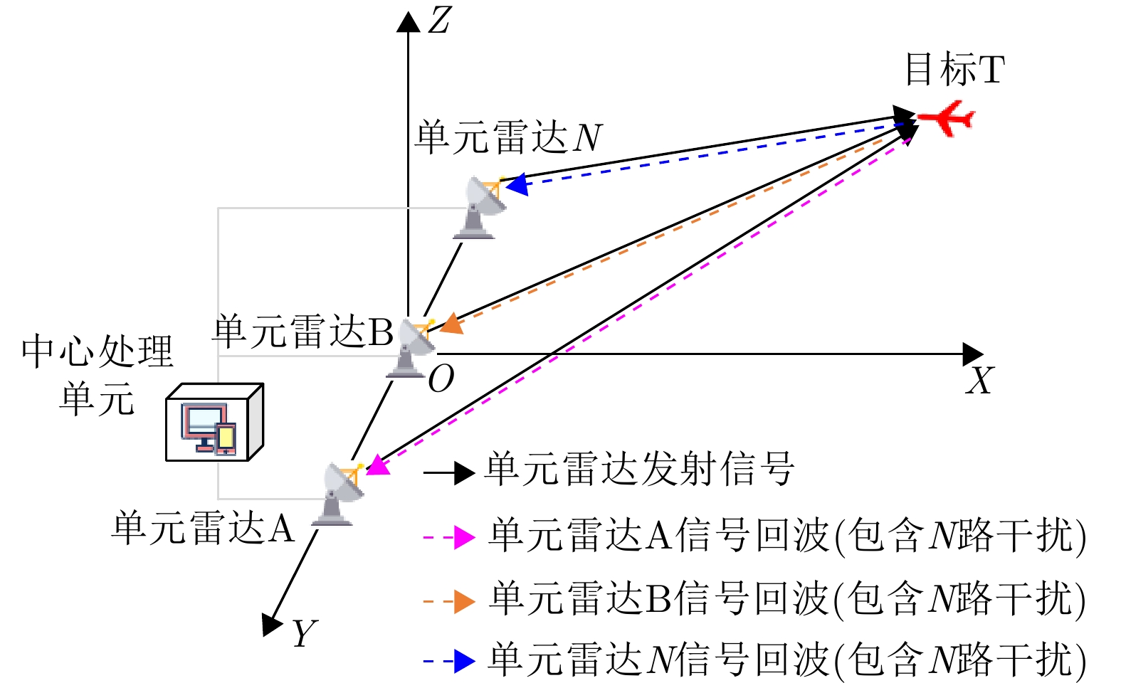 The paper proposes a double hierarchical nonhomogeneous multirank target detection method for the distributed Multiple-Input Multiple-Output (MIMO) radar to detect targets in scenarios with subspace interference and nonhomogeneous clutter. First, a multirank target model and subspace interference model are established based on the fact that the target signal and interference are located in two linearly independent subspaces, each with a rank greater than 1. The corresponding subspace matrices of the two subspaces and the coordinate vectors of the corresponding distance units are unknown. Then, a distributed MIMO radar system with a double hierarchical nonhomogeneous structure is designed, and the interference of each transmit-receive pair is nonhomogeneous, i.e., each transmit-receive pair possesses different statistics. In addition, the clutter in one transmit-receive pair is nonhomogeneous. Subsequently, the double hierarchical nonhomogeneous multirank target Rao detector and Wald detector are designed for the distributed MIMO radar in the context of subspace interference. This is achieved by adopting the Rao and Wald test criteria, constructing the parameter estimation strategy to be solved, and estimating the power median normalized covariance. Theoretical derivation showed that the proposed method had a constant false alarm property for the clutter covariance matrix structure. Simulation experiments showed that the proposed method guarantees a constant false alarm property for the clutter covariance matrix structure; in addition, compared with the existing distributed MIMO radar detection methods, the proposed detection method improves the target detection and interference suppression performances.