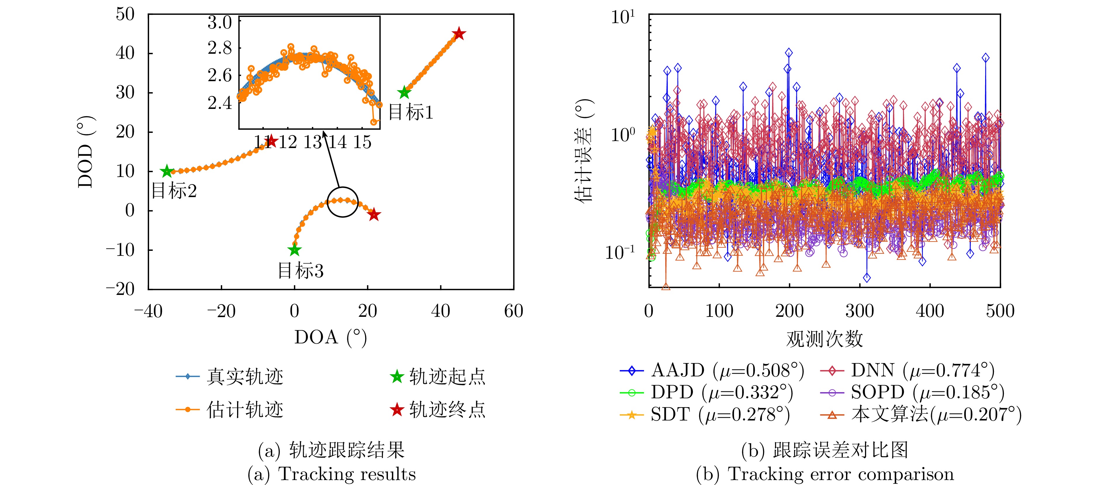 Moving target tracking is a fundamental task in bistatic Multiple-Input Multiple-Output (MIMO) radar systems, as it is essential for improving sensing accuracy and real-time adaptability in dynamic environments. This paper proposes a tracking algorithm based on Adaptive Tensor Decomposition (ATD) to address accuracy degradation caused by target dynamics and high-dimensional data coupling. A third-order streaming tensor is first established to model the time-varying, multi-dimensional structure of received signals from moving targets, which jointly incorporates the Direction Of Departure (DOD) and Direction Of Arrival (DOA). A dynamic mapping is then derived from the tensor to characterize the relationship between the target’s spatial state and the factor matrices. Next, a random dimensionality reduction strategy is integrated into the adaptive tensor decomposition, which iteratively updates the factor matrices that contain target state information, thereby enabling real-time and robust tracking of target angles. Finally, numerical simulations are conducted to evaluate the tracking performance of the proposed method. The results demonstrate that it provides continuous and stable tracking of moving targets under low Signal-to-Noise Ratio (SNR) conditions. Compared to classical approaches, the proposed algorithm reduces computational time by one to two orders of magnitude, demonstrating its effectiveness and real-time applicability in complex and dynamic environments.