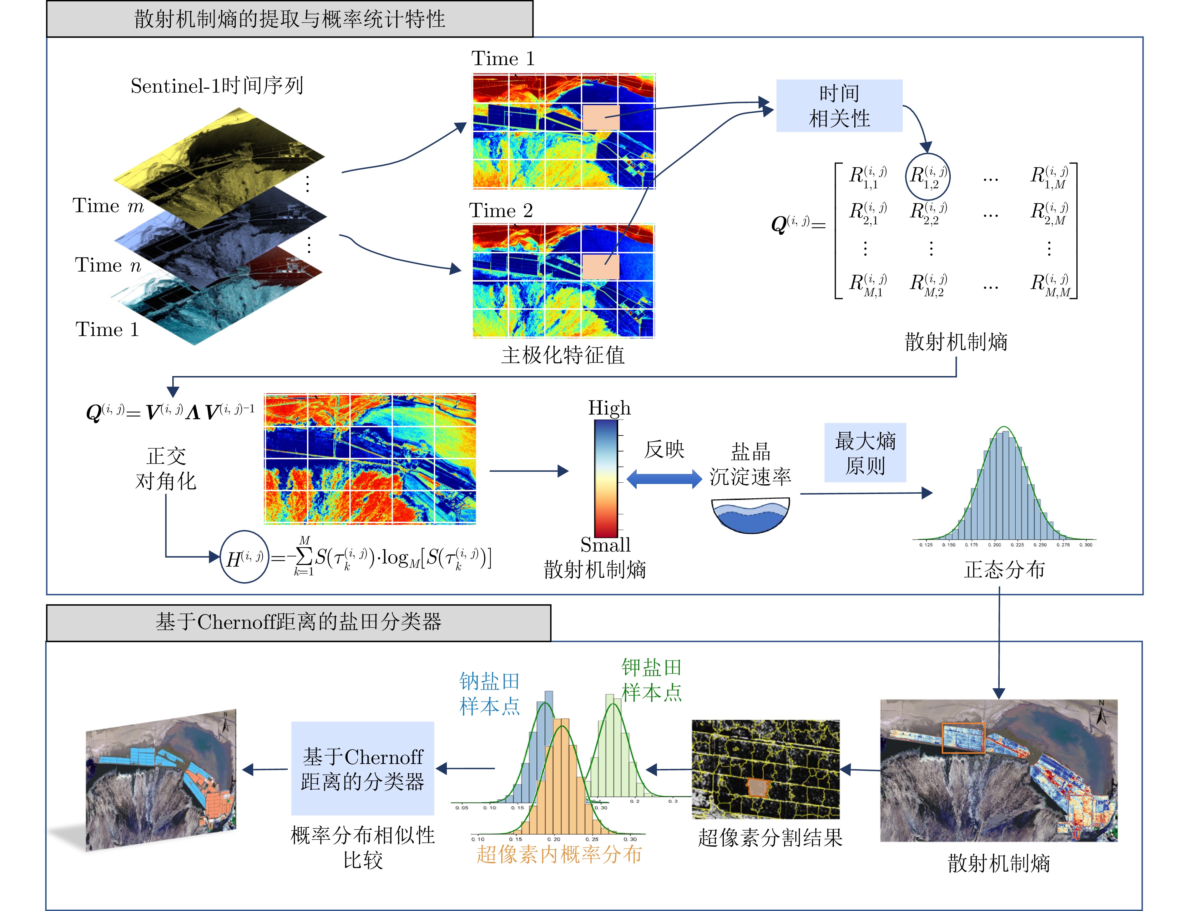 Salt lakes, rich in potassium and lithium mineral resources, are typically mined using the salt field crystallization method. Specifically, brine is first moved to sodium salt fields where sodium salts crystallize, and then it is moved to potassium salt fields for the precipitation of potassium salts. Determining the type of salt field is essential for accurately estimating salt production and ensuring efficient mining operations. Because different types of salt fields exhibit different salt precipitation rates, they also produce distinct variations in scattering intensity that can be observed in multi-temporal Polarimetric Synthetic Aperture Radar (PolSAR) data. To explore this property, this study proposes a salt field classification method based on multi-temporal PolSAR. First, to accurately characterize the long-term scattering variations in salt fields, a new multi-temporal polarization feature, i.e., dominant scattering temporal entropy, is introduced. The main scattering mechanism of the target area is extracted from the polarimetric covariance matrix, from which the temporal correlation between any two PolSAR images is calculated to construct a temporal correlation matrix. The principal change direction and magnitude of scattering variation in land cover across the time series are then obtained from the temporal correlation matrix through diagonalization, and entropy is used to quantify change intensity and provide an accurate measure of cumulative change. Second, this study demonstrates that the dominant scattering temporal entropy follows the Gaussian distribution, enabling the design of a classifier based on Chernoff distance. Classification is performed by comparing the Chernoff distance of entropy probability distributions within superpixels. The proposed method achieves overall classification accuracies of 84.13% and 86.13% on the Qarhan Salt Lake and Dead Sea Sentinel-1 datasets, respectively, representing an improvement of about 10% over existing time-series PolSAR methods. The classification results exhibit superior spatial consistency and noise robustness compared with other methods.