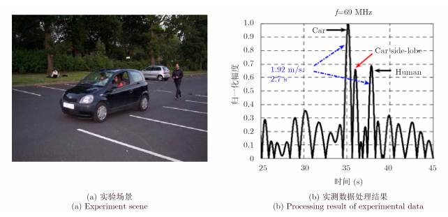 除此之外,也基于实验数据对FSR对地面编队目标的分辨能力进行了验证。图 10是一大一小两目标编队情况,大目标为车辆,小目标为人。在实验中,两目标的距离设置为5 m,目标之间通过细绳相连保持固定的间距和相同的速度。通过对实测信号的估计处理,速度估计值为1.92 m/s,峰值之间的时间间隔为2.65 s,因此估计的目标隔离度约为5.08 m,非常接近设置值,同时两个目标峰值清晰可见,表明两目标得到了较好的分辨。